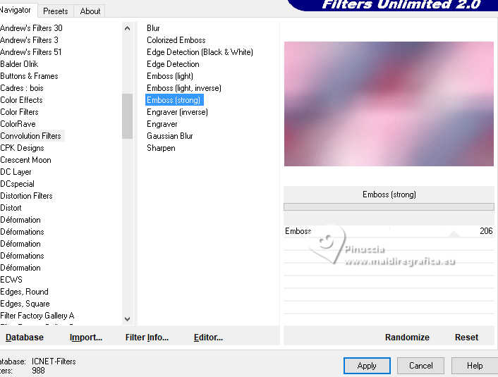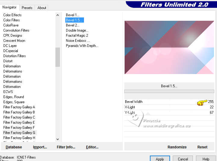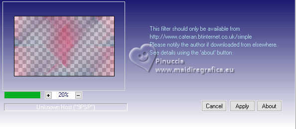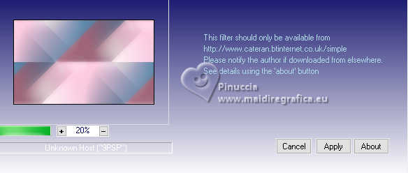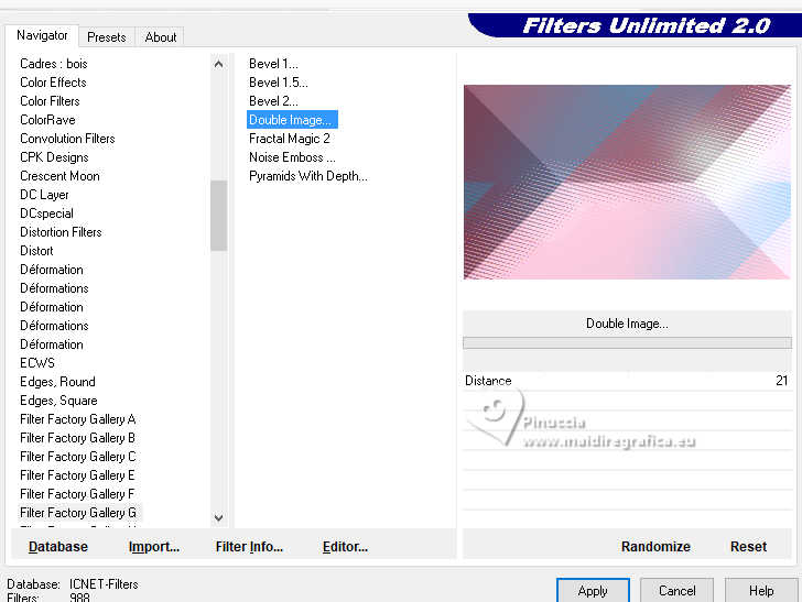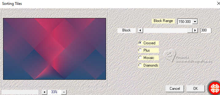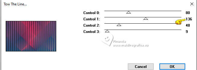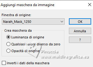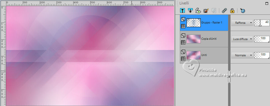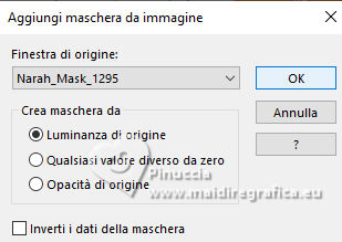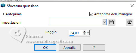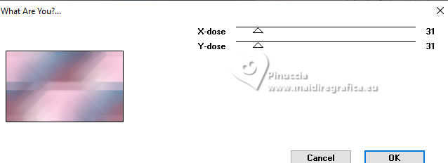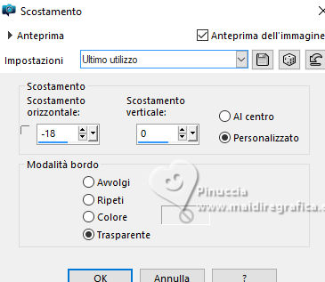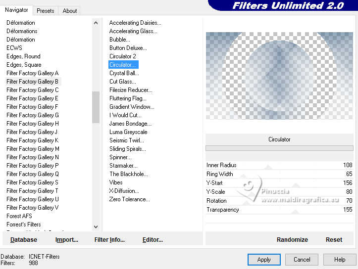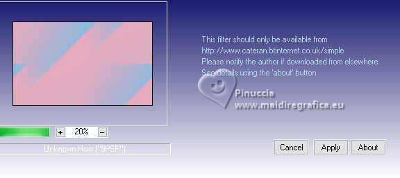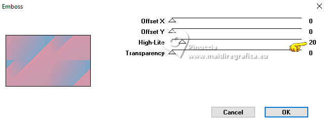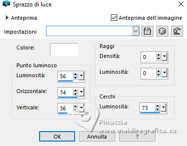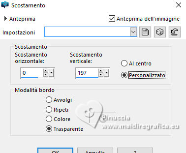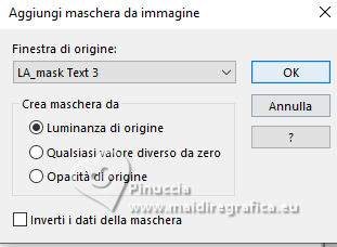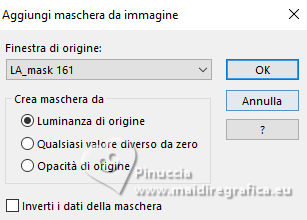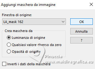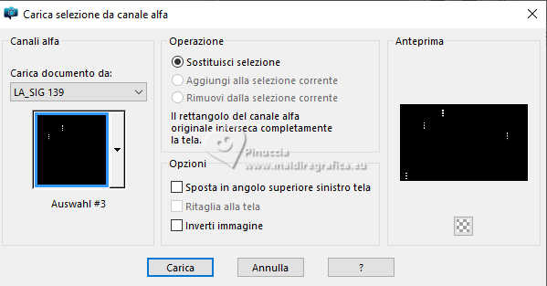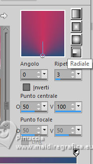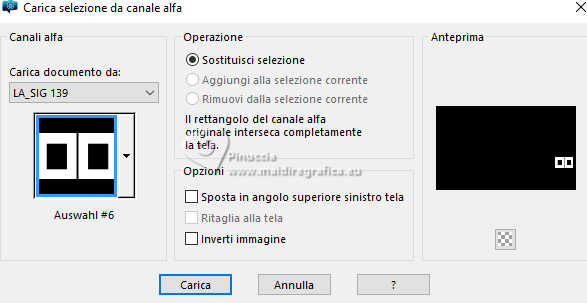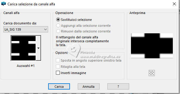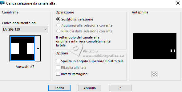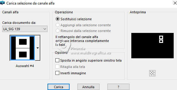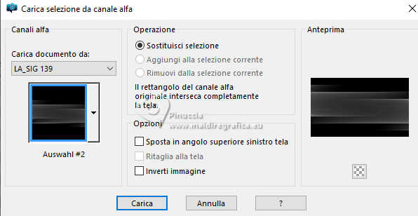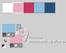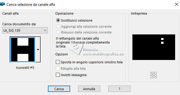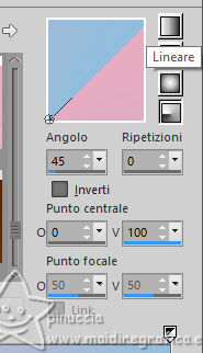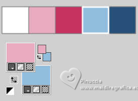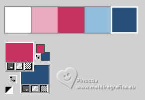 qui puoi trovare qualche risposta ai tuoi dubbi. Se l'argomento che ti interessa non è presente, ti prego di segnalarmelo. Il copyright del tutorial appartiene a Laguna Azul. Questo tutorial è stato creato con PspX9 e tradotto con CorelX e CorelX2, ma può essere realizzato anche con le altre versioni di PSP. Dalla versione X4, il comando Immagine>Rifletti è stato sostituito con Immagine>Capovolgi in orizzontale, e il comando Immagine>Capovolgi con Immagine>Capovolgi in verticale. Nelle versioni X5 e X6, le funzioni sono state migliorate rendendo disponibile il menu Oggetti. Con la nuova versione X7, sono tornati Rifletti>Capovolgi, ma con nuove varianti. Vedi la scheda sull'argomento qui Traduzione francese/traduction en français qui Le vostre versioni quiOccorrente: Un tube a scelta Il resto del materiale ![]() Per tre maschere grazie Narah. Per il tube del mio esempio grazie LoriM. Il resto del materiale è di Laguna Azul (in questa pagina trovi i links ai siti dei creatori di tubes) Filtri in caso di dubbi, ricorda di consultare la mia sezione filtri qui Filters Unlimited 2.0 qui Filter Factory Gallery B - Circulator qui Filter Factory Gallery G - Bevel 1.5, Double Image qui Alien Skin Eye Candy 5 Impact - Glass qui Graphics Plus - Emboss qui Simple - Quick Tile qui Mehdi - Sorting Tiles qui Tramages - Tow the line qui Toadies - What are you qui Transparence - Eliminate Black qui I filtri Factory Gallery, Graphics Plus, Simple, Tramages, Toadies e Transparency si possono usare da soli o importati in Filters Unlimited (come fare vedi qui) Se un filtro fornito appare con questa icona ![]() ![]() non esitare a cambiare modalità di miscelatura e opacità secondo i colori utilizzati. Nelle ultime versioni di PSP non c'è il gradiente di primo piano/sfondo (Corel_06_029) Puoi usare i gradienti delle versioni precedenti. Trovi qui i gradienti Corel X. Metti il preset Cliccando sul file una o due volte (a seconda delle tue impostazioni), automaticamente il preset si installerà nella cartella corretta. perchè uno o due clic vedi qui ![]() Apri le maschere in PSP e minimizzale con il resto del materiale. 1. Apri LA_Farbtabelle e spostalo nell'angolo destro della tua area di lavoro. ![]() Con lo strumento Riempimento, modalità Nessuno ,Riempi il campo 1 con il colore bianco. Ora scegli un colore chiaro del tuo tube, di gamma pastello, e riempi il campo 2 con questo colore. Scegli un colore leggeremente più scuro, non troppo forte, che corrisponda al colore 2, e riempi il campo 3. Ora ti servono 2 tonalità di blu, una chiara e una più scura, che si armonizzino con i colori scelti. Per l'esempio ho usato il colore #90bcde per il campo 4 e il colore scuro #275077 per il campo 5. ![]() 2. Imposta il colore di primo piano con il colore 2, e il colore di sfondo con il colore 4. ![]() Passa il colore di primo piano a Gradiente di primo piano/sfondo, stile Radiale. ![]() Apri LA_SIG 139 Questa immagine, che sarà la base del tuo lavoro, non è vuota, ma contiene le selezioni salvate sul canale alfa. Riempi l'immagine trasparente con il gradiente.Effetti>Plugins>Simple - Quick Tile. ![]() Effetti>Plugins>Graphics Plus - Emboss. ![]() 3. Effetti>Effetti di illuminazione>Sprazzo di luce. ![]() Effetti>Plugins>Filters Unlimited 2.0 - Filter Factory Gallery G - Bevel 1.5. ![]() Effetti>Plugins>Filters Unlimited 2.0 - Filter Factory Gallery G - Double Image, con i settaggi standard. ![]() Effetti>Plugins>Simple - Quick Tile. ![]() Effetti>Plugins>Toadies - What are you. ![]() 4. Selezione>Carica/Salva selezione>Carica selezione da canale alfa. La selezione Auswahl #1 è subito disponibile. Devi soltanto cliccare Carica. ![]() Regola>Sfocatura>Sfocatura gaussiana - raggio 35. ![]() Selezione>Deseleziona. Imposta il colore di primo piano con il colore 3 e il colore di sfondo con il colore 5. ![]() Passa il colore di primo piano a Gradiente di primo piano/sfondo, stile Radiale. ![]() Livelli>Nuovo livello raster. Riempi il livello con il gradiente.Effetti>Plugins>Mehdi - Sorting Tiles. ![]() Effetti>Plugins>Tramages - Tow the line ![]() Effetti>Plugins>Transparency - Eliminate Black. Effetti>Plugins>Simple - Quick Tile. ![]() 5. Effetti>Effetti di immagine>Motivo unico. ![]() Cambia la modalità di miscelatura di questo livello in Luce diffusa. Livelli>Unisci>Unisci visibile. Livelli>Duplica Regola>Sfocatura>Sfocatura gaussiana - raggio 24. ![]() Effetti>Plugins>Filters Unlimited 2 - Convolution Filter - Emboss (strong), con i settaggi standard. ![]() Immagine>Rifletti>Rifletti verticalmente. Cambia la modalità di miscelatura di questo livello in Luce diffusa. 6. Livelli>Nuovo livello raster. Riempi il livello con il colore di sfondo (colore 5 )Livelli>Nuovo livello maschera>Da immagine. Apri il menu sotto la finestra di origine e vedrai la lista dei files aperti. Seleziona la maschera LA_mask 162 ![]() Livelli>Unisci>Unisci gruppo. Effetti>Plugins>Filter Factory Gallery B - Circulator, con i settaggi standard. ![]() Cambia la modalità di miscelatura di questo livello in Rafforza, e abbassa l'opacità al 40%. L'opacità può variare, secondo i tuoi colori; dovrebbe assomigliare a questo. ![]() 7. Imposta il colore di primo piano con il colore bianco. Livelli>Nuovo livello raster. Riempi il livello con il colore bianco.Livelli>Nuovo livello maschera>Da immagine. Apri il menu sotto la finestra di origine e seleziona la maschera Narah_Mask_1250 ![]() Livelli>Unisci>Unisci gruppo. Scegli uno dei 4 LA_BG... per me ![]() Modifica>Copia. Torna al tuo lavoro e vai a Modifica>Incolla come nuovo livello. Apri LA_Deco 1 ![]() Modifica>Copia. Torna al tuo lavoro e vai a Modifica>Incolla come nuovo livello. Effetti>Effetti di immagine>Scostamento. ![]() 8. Livelli>Nuovo livello raster. Selezione>Carica/Salva selezione>Carica selezione da canale alfa. Apri il menu delle selezioni e carica la selezione Auswahl #2 ![]() Riempi la selezione con il colore di sfondo (colore 5 )Selezione>Deseleziona. Apri LA_Deco 2 ![