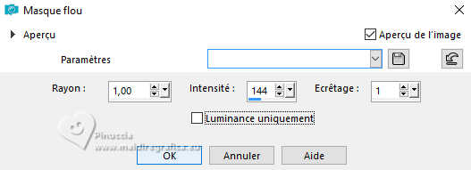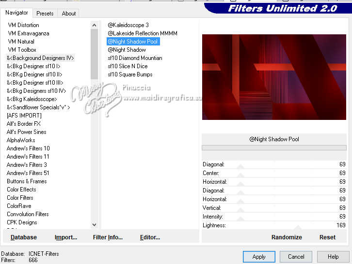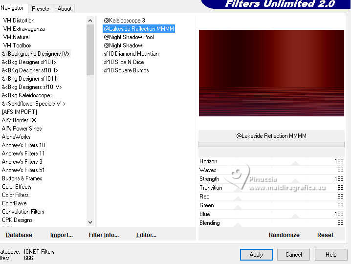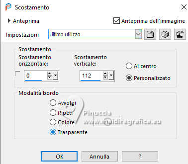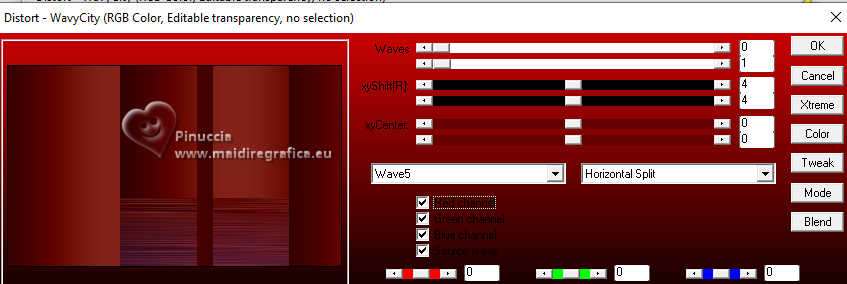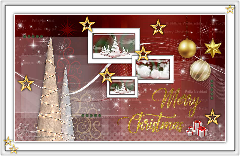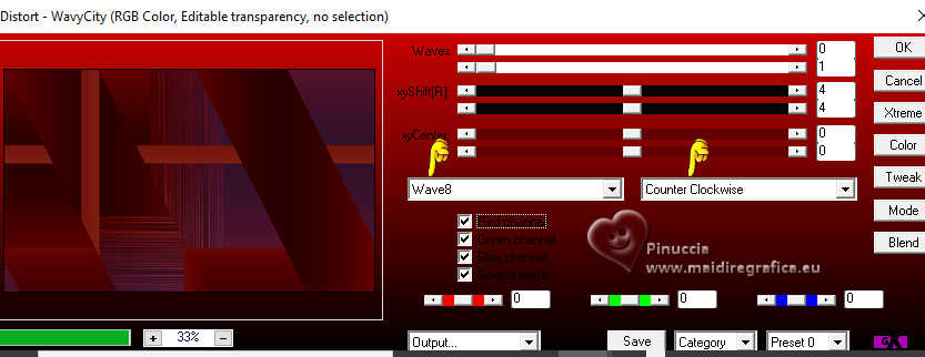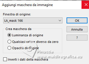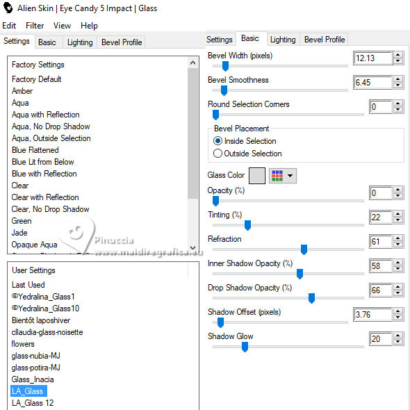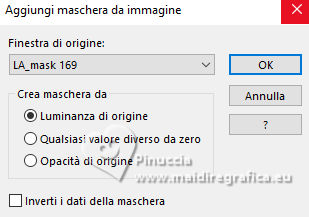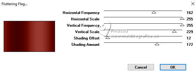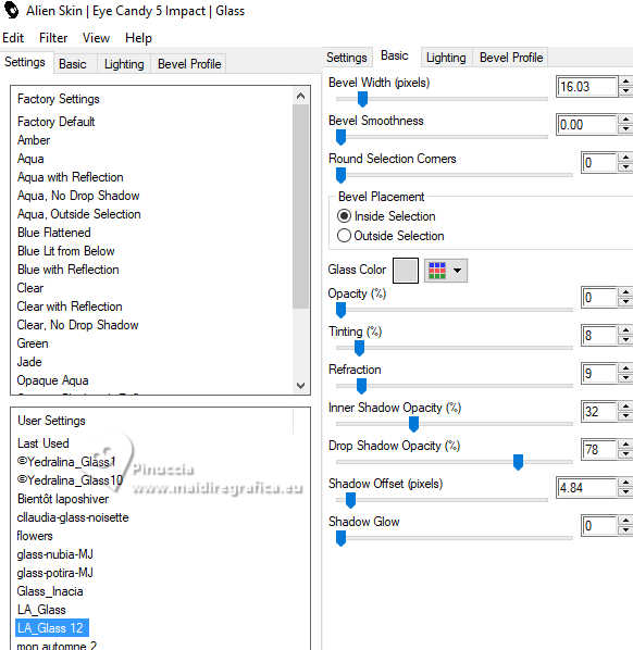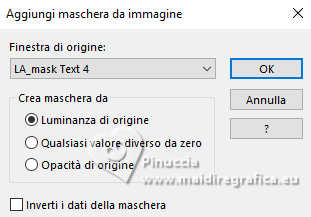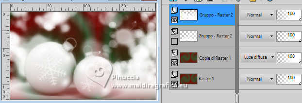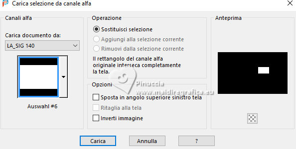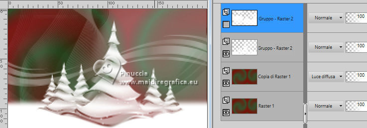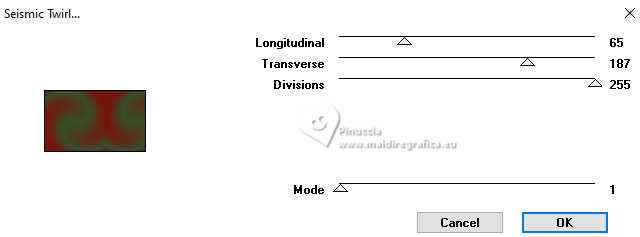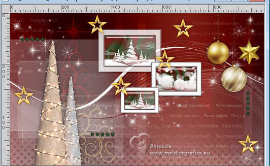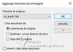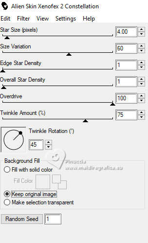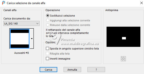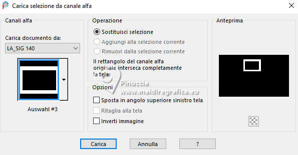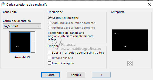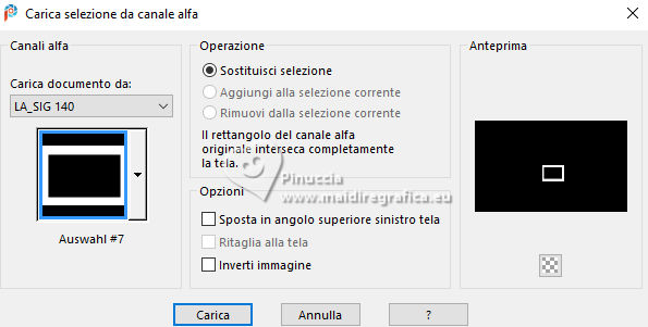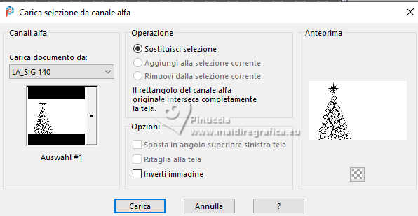 qui puoi trovare qualche risposta ai tuoi dubbi. Se l'argomento che ti interessa non è presente, ti prego di segnalarmelo. Il copyright del tutorial appartiene a Laguna Azul. Questo tutorial è stato creato con PspX9 e tradotto con PSPX9 e PSP2020, ma può essere realizzato anche con le altre versioni di PSP. Dalla versione X4, il comando Immagine>Rifletti è stato sostituito con Immagine>Capovolgi in orizzontale, e il comando Immagine>Capovolgi con Immagine>Capovolgi in verticale. Nelle versioni X5 e X6, le funzioni sono state migliorate rendendo disponibile il menu Oggetti. Con la nuova versione X7, sono tornati Rifletti>Capovolgi, ma con nuove varianti. Vedi la scheda sull'argomento qui Traduzione francese/traduction en français qui Le vostre versioni qui![]() Occorrente: ![]() (in questa pagina trovi i links ai siti dei creatori di tubes) ![]() in caso di dubbi, ricorda di consultare la mia sezione filtri qui Filters Unlimited 2.0 - versione software qui AP 01 [Innovations] - Distort-WavyCity qui Alien Skin Eye Candy 5 Impact - Glass qui Transparency - Eliminate Black qui Filter Factory Gallery B - Fluttering Flag, Seismic Twirl qui Simple - Blintz, Pizza Slice Mirror, 4Way Average qui Alien Skin Xenofex 2 - Constellation qui I filtri Factory Gallery, Transparency e Simple si possono usare da soli o importati in Filters Unlimited (come fare vedi qui) Se un filtro fornito appare con questa icona ![]() ![]() ![]() non esitare a cambiare modalità di miscelatura e opacità secondo i colori utilizzati. Nelle ultime versioni di PSP non c'è il gradiente di primo piano/sfondo (Corel_06_029) Puoi usare i gradienti delle versioni precedenti. Trovi qui i gradienti Corel X. Metti i presets Cliccando sul file una o due volte (a seconda delle tue impostazioni), automaticamente il preset si installerà nella cartella corretta. perché uno o due clic vedi qui ![]() Apri le 2 maschere LA in PSP e minimizzale con il resto del materiale.1. Apri LA_Xmas Colori e lasciala aperta sulla tua area di lavoro.Ti servirà per scegliere i colori durante lo svolgimento del tuo lavoro. Apri LA_SIG 140 Questa immagine, che sarà la base del tuo lavoro, non è vuota, ma contiene le selezioni salvate sul canale alfa. Scegli e imposta il colore di primo piano con un colore scuro, e il colore di sfondo con il colore bianco. ![]() Riempi l'immagine trasparente con il colore di primo piano.Effetti>Plugins>Filter Factory Gallery B - Fluttering Flag, con i settaggi standard. ![]() Livelli>Duplica. 2. Effetti>Plugins>Filters Unlimited 2.0 - &<Background Designer IV> - @Lakeside Reflection MMMM, con i settaggi standard. ![]() Effetti>Plugins>AP 01 [Innovations] - Distort-WavyCity. ![]() Ripeti Effetti>Plugins>AP 01 [Innovations] - Distort-WavyCity. ![]() Effetti>Plugins>Filters Unlimited 2.0 - &<Background Designer IV> - @Night Shadow Pool, con i settaggi standard. ![]() Risultato ![]() Effetti>Plugins>Transparency - Eliminate Black - 2 volte. Questo effetto lavora senza finestra; risultato ![]() 3. Effetti>Plugins>Simple - Blintz. Effetti>Plugins>Simple - Pizza Slice Mirror. Effetti>Plugins>Simple - 4Way Average. Questi effetti del filtro Simple lavorano senza finestre; risultato ![]() Effetti>Effetti di bordo>Aumenta. Cambia la modalità di miscelatura di questo livello in Luce diffusa. 4. Livelli>Nuovo livello raster. Riempi il livello con il colore bianco.Livelli>Nuovo livello maschera>Da immagine. Apri il menu sotto la finestra di origine e vedrai la lista dei files aperti. Seleziona la maschera LA_mask 164 ![]() Livelli>Unisci>Unisci gruppo. Dalla paletta scegli ora, e impostalo come colore di sfondo, un colore chiaro spento diverso dal tuo colore di primo piano, io ho scelto un colore giallo chiaro. ![]() 5. Livelli>Nuovo livello raster. Riempi il livello con il colore di sfondo.Selezione>Carica/Salva selezione>Carica selezione da canale alfa. La selezione Auswahl#1 è subito disponibile. Devi soltanto cliccare Carica. ![]() Premi sulla tastiera il tasto CANC ![]() ![]() Selezione>Deseleziona. Effetti>Effetti 3D>Sfalsa ombra. ![]() Cambia la modalità di miscelatura di questo livello in Luce diffusa. 6. Apri LA_Deco circle ![]() Modifica>Copia. Torna al tuo lavoro e vai a Modifica>Incolla come nuovo livello. Effetti>Effetti di immagine>Scostamento. ![]() Cambia la modalità di miscelatura di questo livello in Indebolisci. Apri LA_Glitzer Stars ![]() Modifica>Copia. Torna al tuo lavoro e vai a Modifica>Incolla come nuovo livello. 7. Imposta nuovamente il colore di sfondo con il colore bianco. Livelli>Nuovo livello raster. Selezione>Carica/Salva selezione>Carica selezione da canale alfa. Apri il menu delle selezioni e carica la selezione Auswahl#2 ![]() Riempi la selezione con il colore bianco.Selezione>Deseleziona. Cambia la modalità di miscelatura di questo livello in Luce diffusa. Apri LA_Deco_1 ![]() Modifica>Copia. Torna al tuo lavoro e vai a Modifica>Incolla come nuovo livello. Effetti>Effetti di immagine>Scostamento. ![]() Livelli>Nuovo livello raster. Riempi il livello con il colore bianco.Livelli>Nuovo livello maschera>Da immagine. Apri il menu sotto la finestra di origine e seleziona la maschera LA_mask Text 4 ![]() Livelli>Unisci>Unisci gruppo. 8. Livelli>Nuovo livello raster. Selezione>Carica/Salva selezione>Carica selezione da canale alfa. Apri il menu delle selezioni e carica la selezione Auswahl#3 ![]() Apri la cornice LA_Small Frame ![]() Modifica>Copia. Non chiuderla perchè ti servirà ancora. Torna al tuo lavoro e vai a Modifica>Incolla nella selezione. Selezione>Deseleziona. Effetti>Effetti 3D>Sfalsa ombra. ![]() Imposta il colore di sfondo con un colore scuro differente ma in armonia con il tuo colore di primo piano. Io ho scelto un verde scuro. ![]() Passa il colore di primo piano a Gradiente di primo piano/sfondo, stile Lineare. ![]() Apri una nuova immagine trasparente 200 x 120 pixels, e riempila con il gradiente.Effetti>Plugins>Filter Factory Gallery B - Seismic Twirl, con i settaggi stand