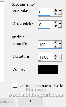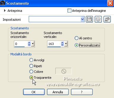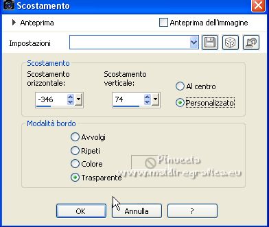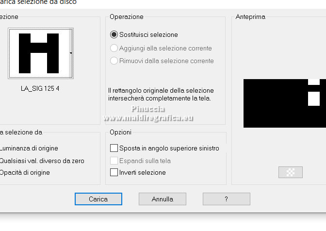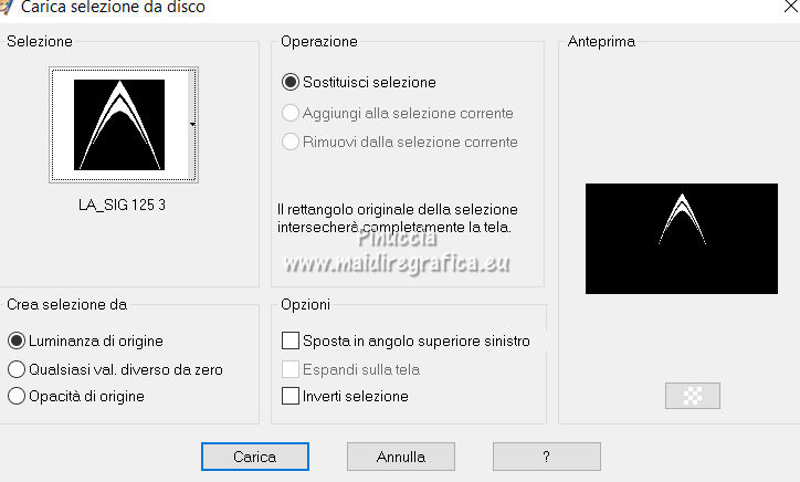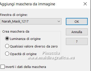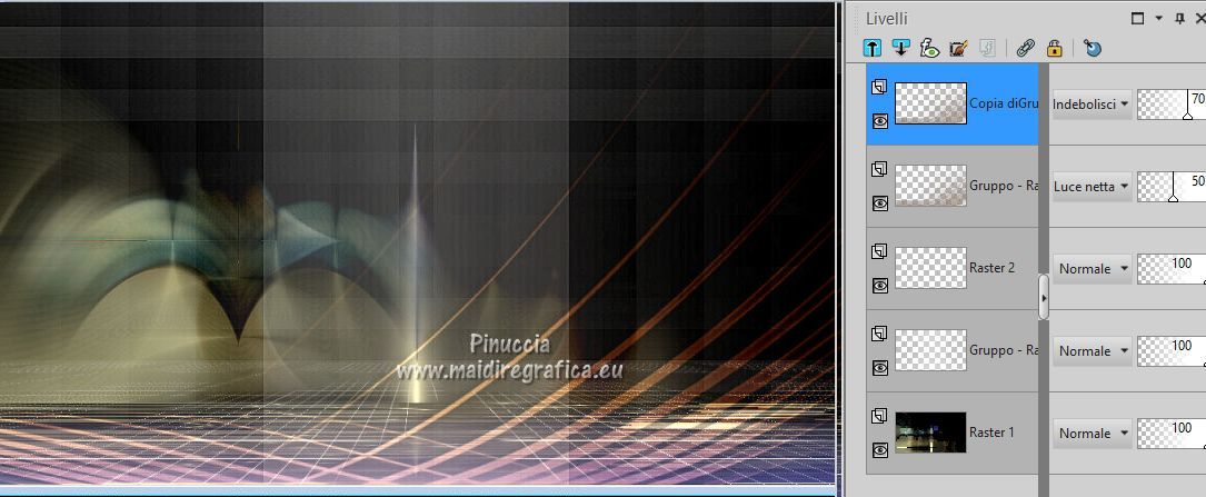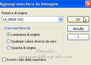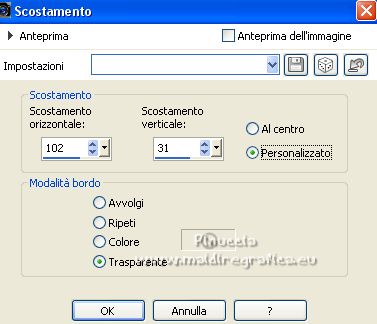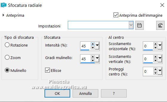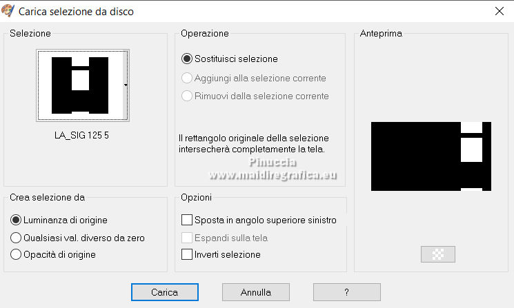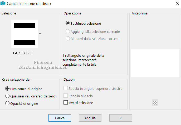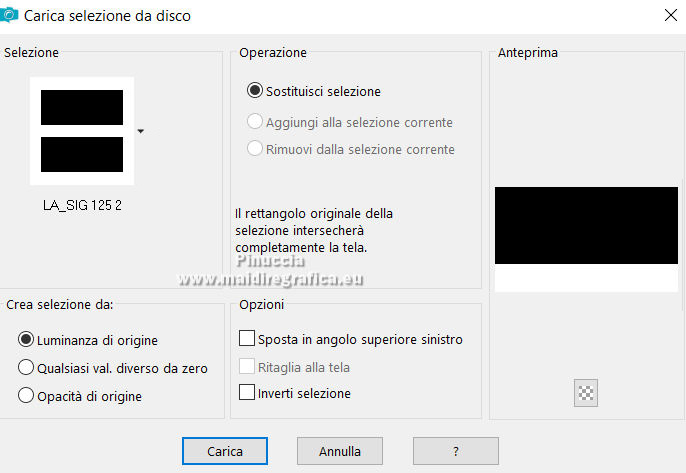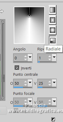 qui puoi trovare qualche risposta ai tuoi dubbi. Se l'argomento che ti interessa non è presente, ti prego di segnalarmelo. Il copyright del tutorial appartiene a Laguna Azul. Questo tutorial è stato creato con PspX9 e tradotto con CorelX e CorelX2, ma può essere realizzato anche con le altre versioni di PSP. Dalla versione X4, il comando Immagine>Rifletti è stato sostituito con Immagine>Capovolgi in orizzontale, e il comando Immagine>Capovolgi con Immagine>Capovolgi in verticale. Nelle versioni X5 e X6, le funzioni sono state migliorate rendendo disponibile il menu Oggetti. Con la nuova versione X7, sono tornati Rifletti>Capovolgi, ma con nuove varianti. Vedi la scheda sull'argomento qui Traduzione francese/traduction en français qui Le vostre versioni quiOccorrente: Un tube a scelta (il tube usato nel tutorial originale è un tube soggetto a licenza) Il resto del materiale qui Per il tube usato nella mia versione e per due maschere grazie Maryse e Narah. Il resto del materiale è di Laguna Azul (in questa pagina trovi i links ai siti dei creatori di tubes) Filtri: in caso di dubbi, ricorda di consultare la mia sezione filtri qui Filters Unlimited 2.0 - versione software qui Filters Unlimited 2.0 - versione in files formato 8bf qui &<Background Designers IV> - @Lakeside Reflection MMMM (da importare in Unlimited) qui &<Bkg Kaleidoscope> - 4QFlip UpperR (da importare in Unlimited) qui Andrew's Filters 11 - Nightmare II qui Alien Skin Eye Candy 5 Impact - Glass, Perspective Shadow qui Mura's Meister - Perspective Tiling qui Toadies - Weaver qui Simple - Quick Tile qui I filtri Andrew's, Toadies e Simple si possono usare da soli o importati in Filters Unlimited (come fare vedi qui) Se un filtro fornito appare con questa icona ![]() non esitare a cambiare modalità di miscelatura e opacità secondo i colori utilizzati. Nelle ultime versioni di PSP non c'è il gradiente di primo piano/sfondo (Corel_06_029) Puoi usare i gradienti delle versioni precedenti. Trovi qui i gradienti Corel X. Metti i preset Cliccando sul file una o due volte (a seconda delle tue impostazioni), automaticamente il preset si installerà nella cartella corretta. perchè uno o due clic vedi qui ![]() Metti le selezioni (cartella Auswahl) nella cartella Selezioni. Apri le maschere (Masken) in PSP e minimizzale con il resto del materiale. 1. Imposta il colore di primo piano con il colore bianco, e il colore di sfondo con il colore nero. ![]() Passa il colore di primo piano a Gradiente di primo piano/sfondo, stile Radiale. ![]() Apri una nuova immagine trasparente 950 x 550 pixels, e riempila con il gradiente.Effetti>Effetti geometrici>Cerchio. ![]() Modifica>Ripeti>Cerchio ![]() Ancora Modifica>Ripeti Cerchio. ![]() 2. Apri il tuo tube e vai a Modifica>Copia. Torna al tuo lavoro e vai a Modifica>Incolla come nuovo livello. Spostalo a sinistra, o a destra, come preferisci.![]() Non è necessario ridimensionare. Livelli>Duplica. Immagine>Rifletti. Livelli>Unisci>Unisci giù. Selezione>Carica/Salva selezione>Carica selezione da disco. Cerca e carica la selezione LA_SIG 125 1. ![]() La selezione delimita i bordi dell'immagine (per lasciare fuori eventuali parti del tube rimaste all'esterno) ![]() Immagine>Ritaglia la selezione. Regola>Sfocatura>Sfocatura radiale. ![]() Effetti>Plugins>Simple - Quick Tile. ![]() Effetti>Plugins>Filters Unlimited 2.0 - &<Bkg Kaleidoscope> - 4QFlip UpperR. ![]() Effetti>Effetti di bordo>Aumenta. Cambia la modalità di miscelatura di questo livello in Rafforza, e abbassa l'opacità al 55%. Livelli>Unisci>Unisci giù. 3. Effetti>Plugins>Filters Unlimited 2.0 - Andrew's Filter 11 - Nightmare 2, con i settaggi standard ![]() Ovviamente, a seconda del colore del tuo tube, il tuo risultato potrà essere un po' diverso. Selezione>Carica/Salva selezione>Carica selezione da disco. Cerca e carica la selezione LA_SIG 125 2. ![]() Effetti>Plugins>Filters Unlimited 2.0 - &<Background Designers IV> - @Lakeside Reflection MMMM ![]() Selezione>Deseleziona. 4. Passa il colore di primo piano a Colore. Livelli>Nuovo livello raster. Riempi il livello con il colore bianco.Livelli>Nuovo livello maschera>Da immagine. Apri il menu sotto la finestra di origine e vedrai la lista dei files aperti. Seleziona la maschera Narah_Mask_1217. ![]() Livelli>Unisci>Unisci gruppo. Apri il tube LA_Deco 1 ![]() Modifica>Copia. Torna al tuo lavoro e vai a Modifica>Incolla come nuovo livello. Effetti>Plugins>Mura's Meister - Perspective Tiling. ![]() Immagine>Immagine negativa. 5. Imposta il colore di sfondo con un colore chiaro del tuo tube, che non dovrebbe essere troppo luminoso; per l'esempio #ceac8a. ![]() Livelli>Nuovo livello raster. Riempi il livello con il colore di sfondo.Livelli>Nuovo livello maschera>Da immagine. Apri il menu sotto la finestra di origine e seleziona la maschera Narah_Mask_1256. ![]() Livelli>Unisci>Unisci gruppo. Effetti>Effetti 3D>Sfalsa ombra, colore nero. ![]() Cambia la modalità di miscelatura di questo livello in Luce netta, e abbassa l'opacità al 50%, o secondo i tuoi colori. Livelli>Duplica. Cambia la modalità di miscelatura di questo livello in Indebolisci, e abbassa l'opacità al 70%, o secondo i tuoi colori. ![]() (il tuo esempio potrà essere differente, secondo i colori del tuo tube) 6. Livelli>Nuovo livello raster. Selezione>Carica/Salva selezione>Carica selezione da disco. Cerca e carica la selezione LA_SIG 125 3. ![]() Riempi la selezione con il colore bianco.Selezione>Deseleziona. Effetti>Plugins>Filters Unlimited 2.0 - Toadies - Weaver, con i settaggi standard. ![]() Cambia la modalità di miscelatura di questo livello in Luce diffusa. Modifica>Copia Speciale>Copia Unione. Livelli>Nuovo livello raster. Riempi il livello con il colore bianco.Livelli>Nuovo livello maschera>Da immagine. Apri il menu sotto la finestra di origine e seleziona la maschera LA_Mask(42). ![]() Livelli>Unisci>Unisci gruppo. Livelli>Nuovo livello raster. Selezione>Carica/Salva selezione>Carica selezione da disco