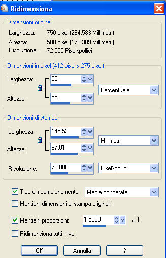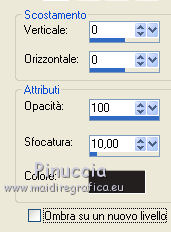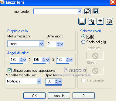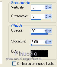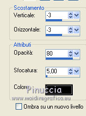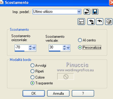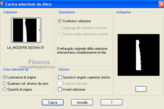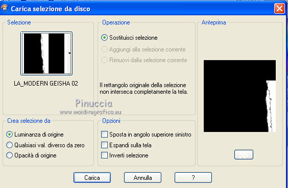 qui puoi trovare qualche risposta ai tuoi dubbi. Se l'argomento che ti interessa non è presente, ti prego di segnalarmelo. Questo tutorial è stato creato con CorelX2 e tradotto con CorelX, ma può essere eseguito anche con le altre versioni di PSP. Dalla versione X4, il comando Immagine>Rifletti è stato sostituito con Immagine>Capovolgi in orizzontale, e il comando Immagine>Capovolgi con Immagine>Capovolgi in verticale. Nelle versioni X5 e X6, le funzioni sono state migliorate rendendo disponibile il menu Oggetti. Vedi la scheda sull'argomento qui Il copyright del tutorial, del materiale scrap e dei poser appartiene a Laguna Azul. Il copyright della traduzione è mio. Il copyright dei tubes e delle immagini appartiene ai rispettivi artisti. Per favore, rispetta il lavoro degli autori. Traduzione in francese qui Occorrente: Un tube a scelta. Il resto del materiale qui I tubes sono di Guismo. Filtri: in caso di dubbi, ricorda di consultare la mia sezione filtri qui Filters Unlimited 2.0 qui Filter Factory Gallery V qui Mura's Meister - Copies qui Xero - Supersmooth, Artifax qui Xero - Improver, Lineart qui Xero - Artworx, Radiance qui I filtri Factory Gallery si possono usare da soli o importati in Filters Unlimited (come fare vedi qui) Se un filtro fornito appare con questa icona ![]() Apri il font e minimizzalo. Lo troverai nella lista dei font disponibili quando ti servirà. Metti le selezioni nella cartella Selezioni. 1. Apri una nuova immagine trasparente 750 x 500 pixels. Scegli un colore medio dal tuo tube e impostalo come colore di primo piano. Per il mio esempio ho scelto il colore beige #d4c4b9. Riempi l'immagine trasparente con il colore di primo piano.Livelli>Nuovo livello raster. Apri l'immagine di sfondo la_Back e vai a Modifica>Copia. Torna al tuo lavoro e vai a Modifica>Incolla come nuovo livello. Abbassa l'opacità di questo livello al 30%. 2. Apri lo sfondo "la_back 2". Lavora su questa immagine. Livelli>Nuovo livello raster. Imposta il colore di primo piano con #61a1c8, e riempi il livello con questo colore.Cambia la modalità di miscelatura di questo livello in Colore (esistente). Livelli>Unisci>Unisci visibile. Selezione>Carica/Salva maschera>Carica selezione da disco. Cerca e carica la selezione "La_modern geisha 01". ![]() Modifica>Copia, e minimizza l'immagine perchè ti servirà ancora. 3. Torna al tuo lavoro e vai a Modifica>Incolla come nuovo livello. Sposta l'immagine a sinistra, contro il bordo.![]() Effetti>Effetti 3D>Sfalsa ombra. ![]() 4. Apri uno dei quattro "La_ribbon...", (composti da due livelli nel caso volessi adattarli ai tuoi colori. Modifica>Copia Unione. Torna al tuo lavoro e vai a Modifica>Incolla come nuovo livello. Spostalo sul bordo inferiore.![]() Effetti>Effetti 3D>Sfalsa ombra. ![]() 5. Apri lo sfondo "La_grey back". Lavora su questa immagine. Livelli>Nuovo livello raster. Riempi con il colore di primo piano.Cambia la modalità di miscelatura di questo livello in Colore (esistente). 6. Apri uno dei due "La_flower 0...". Come per tutti gli elementi, puoi adattarlo ai tuoi colori (non lo ripeterò più). Modifica>Copia. Torna allo sfondo "la_grey back" e vai a Modifica>Incolla come nuovo livello. Effetti>Effetti 3D>Sfalsa ombra, con i settaggi precedenti. Effetti>Plugins>Mura's Meister - Copies. ricorda che "random" significa casuale. Per questo il risultato può essere diverso dal mio esempio. ![]() Abbassa l'opacità di questo livello al 45%. Livelli>Unisci>Unisci visibile. Effetti>Plugins>Filters Unlimited 2.0 - Paper Textures - Canvas,Fine. ![]() 7. Effetti>Plugins>Filters Unlimited 2.0 - Edges,Square - Square Edge 13. ![]() Modifica>Copia. Torna al tuo lavoro e vai a Modifica>Incolla come nuovo livello. Effetti>Effetti 3D>Sfalsa ombra. ![]() Sposta l'immagine a destra.![]() 8. Apri il tube La_lace e vai a Modifica>Copia. Torna al tuo lavoro e vai a Modifica>Incolla come nuovo livello. Spostalo a destra, come nell'esempio.![]() Effetti>Effetti 3D>Sfalsa ombra. ![]() 9. Attiva l'immagine di sfondo "La_back" che hai minimizzato al punto 2. Selezione>Deseleziona. Selezione>Carica/Salva maschera>Carica selezione da disco. Cerca e carica la selezione "La_modern geisha 02". ![]() Modifica>Copia, e puoi chiudere lo sfondo senza salvarlo. Torna al tuo lavoro e vai a Modifica>Incolla cme nuovo livello. Sposta l'immagine contro il bordo a destra.![]() Effetti>Effetti 3D>Sfalsa ombra. ![]() 10. Apri il tube "La_stitch 1" e vai a Modifica>Copia. Torna al tuo lavoro e vai a Modifica>Incolla come nuovo livello. Spostalo a destra come nell'esempio.![]() 11. Scegli e apri uno dei ventagli e vai a Modifica>Copia. Torna al tuo lavoro e vai a Modifica>Incolla come nuovo livello. Immagine>Ridimensiona, al 55%, tutti i livelli non selezionato. ![]() Regola>Messa a fuoco>Metti a fuoco. Immagine>Ruota per gradi - 45 gradi a sinistra. ![]() Effetti>Effetti 3D>Sfalsa ombra, con i settaggi precedenti. 12. Apri e scegli uno degli sfondo "La_picture...". Modifica>Copia. Torna al tuo lavoro e vai a Modifica>Incolla come nuovo livello. Effetti>Effetti di immagine>Scostamento. ![]() Effetti>Effetti 3D>Sfalsa ombra. ![]() 13. Apri uno dei due tubes scelti per lo scrap. Lavora sul tube. Effetti>Plugins>Filters Unlimited 2.0 - Filter Factory Gallery V - Posterize. ![]() Effetti>Plugins>Xero - SuperSmooth, con i seguenti settaggi (che possono variare in base al tube). ![]() Effetti>Plugins>Xero - Lineart. ![]() Effetti>Plugins>Xero - Improver. ![]() Effetti>Plugins>Xero - Radiance. ![]() Effetti>Plugins>Filters Unlimited 2.0 - Paper Textures - Striped Paper,Fine. ![]() 14. Modifica>Copia (e puoi chiudere il tube senza salvarlo). Apri una nuova immagine trasparente 350 x 350 pixels e vai a Modifica>Incolla come nuovo livello. Se vuoi, puoi ridimensionarlo. Sposta il tube in modo che con la testa riempia tutta la tela.Apri una delle "La_Back Picture" e minimizzala. Passa il colore di primo piano a Motivi cerca e seleziona il motivo tra le Immagini aperte. ![]() Riempi il l