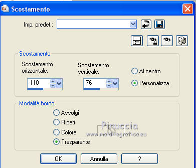 qui puoi trovare qualche risposta ai tuoi dubbi. Se l'argomento che ti interessa non è presente, ti prego di segnalarmelo. Il copyright del tutorial appartiene a Laguna Azul. Questo tutorial è stato creato con CorelX2, ma può essere realizzato anche con le altre versioni di PSP. Dalla versione X4, il comando Immagine>Rifletti è stato sostituito con Immagine>Capovolgi in orizzontale, e il comando Immagine>Capovolgi con Immagine>Capovolgi in verticale. Nelle versioni X5 e X6, le funzioni sono state migliorate rendendo disponibile il menu Oggetti. Vedi la scheda sull'argomento qui Per tradurlo ho usato PSP X. Traduzione francese/traduction française qui ![]() Occorrente: Un tube a scelta. Il resto del materiale qui Filtri: se hai problemi con i filtri, consulta la mia sezione filtri qui Filters Unlimited 2.0 qui ![]() 1. Scegli il kit del tuo colore. Per il mio esempio ho usato "Kit Pink". Apri una nuova immagine trasparente 1100 x 900 pixels. Apri il tube "la_metal frame", e vai a Modifica>Copia. Torna al tuo lavoro e vai a Modifica>Incolla come nuovo livello. Effetti>Effetti di immagine>Scostamento. ![]() 2. Apri il tube "la_skyline", e vai a Modifica>Copia. Torna al tuo lavoro e vai a Modifica>Incolla come nuovo livello. Effetti>Effetti di immagine>Scostamento. ![]() Livelli>Disponi>Sposta giù. Attiva lo strumento Gomma ![]() e cancella la parte del tube sotto la cornice. ![]() 3. Scegli e apri un'immagine di sfondo "la_back 1" o "la_back 2". Livelli>Innalza livello di sfondo. Effetti>Plugins>Filters Unlimited 2.0 - Edges, Round - Round Edge 15. ![]() Modifica>Copia. Torna al tuo lavoro e vai a Modifica>Incolla come nuovo livello. Effetti>Effetti di immagine>Scostamento. ![]() Livelli>Disponi>Sposta giù. Abbassa l'opacità di questo livello al 55%. 4. Apri il tube "la_diamond 1" e vai a Modifica>Copia. Torna al tuo lavoro e vai a Modifica>Incolla come nuovo livello. Attiva il livello superiore. Apri il tube "la_ribbon V", e vai a Modifica>Copia. Torna al tuo lavoro e vai a Modifica>Incolla come nuovo livello. Immagine>Ridimensiona, al 50%, tutti i livelli non selezionato. ![]() Sposta il tube sulla cornice, come nell'esempio.![]() Regola>Messa a fuoco>Metti a fuoco. Effetti>Effetti 3D>Sfalsa ombra. ![]() 5. Apri uno dei fiori, e vai a Modifica>Copia. Torna al tuo lavoro e vai a Modifica>Incolla come nuovo livello. Immagine>Ridimensiona, tra il 40 e il 50%, tutti i livelli non selezionato. Regola>Messa a fuoco>Metti a fuoco. Spostalo sulla cornice.![]() Effetti>Effetti 3D>Sfalsa ombra, con i settaggi precedenti. 6. Apri il tube "la_heart chain", e vai a Modifica>Copia. Torna al tuo lavoro e vai a Modifica>Incolla come nuovo livello. Immagine>Ridimensiona, al 60%, tutti i livelli non selezionato. Regola>Messa a fuoco>Metti a fuoco - 2 volte. Spostalo a sinistra, come nell'esempio.![]() Effetti>Effetti 3D>Sfalsa ombra, con i settaggi precedenti. 7. Apri il tube "la_bow" e vai a Modifica>Copia. Torna al tuo lavoro e vai a Modifica>Incolla come nuovo livello. Immagine>Ridimensiona, al 32%, tutti i livelli non selezionato. Regola>Messa a fuoco>Metti a fuoco. Spostalo a sinistra, sulla catena.![]() Attiva il livello della catena e cancella la parte di catena sopra il nastro.Attiva il livello superiore. Effetti>Effetti 3D>Sfalsa ombra, con i settaggi precedenti. 8. Apri la targa "la_wallstreet", e vai a Modifica>Copia. Torna al tuo lavoro e vai a Modifica>Incolla come nuovo livello. Immagine>Ridimensiona, al 40%, tutti i livelli non selezionato. Immagine>Ruota per gradi - 70 gradi a destra. ![]() Regola>Messa a fuoco>Metti a fuoco. Effetti>Effetti 3D>Sfalsa ombra, con i settaggi precedenti. Spostalo nell'angolo in basso a sinistra della cornice.![]() 9. Apri il tube "la_ribbon", e vai a Modifica>Copia. Torna al tuo lavoro e vai a Modifica>Incolla come nuovo livello. Immagine>Rifletti. Immagine>Ridimensiona, al 70%, tutti i livelli non selezionato. Regola>Messa a fuoco>Metti a fuoco. Spostalo in basso sul bordo della cornice.![]() Effetti>Effetti 3D>Sfalsa ombra, con i settaggi precedenti. 10. Apri il tube "la_diamond 2", e vai a Modifica>Copia. Torna al tuo lavoro e vai a Modifica>Incolla come nuovo livello. Immagine>Ridimensiona, al 60%, tutti i livelli non selezionato. Regola>Messa a fuoco>Metti a fuoco - 2 volte. Effetti>Effetti 3D>Sfalsa ombra, con i settaggi precedenti. Spostalo sulla cornice, a destra.![]() 11. Apri il tube "la_moviestrip". Lavoriamo su questo tube. Apri il tube "la_back moviestrip" e vai a Modifica>Copia. Torna al tube della striscia e vai a Modifica>Incolla come nuovo livello. Apri Filmstrip e vai a Modifica>Copia. Torna al tube della striscia e vai a Modifica>Incolla come nuovo livello. Effetti>Effetti di immagine>Scostamento. ![]() Livelli>Disponi>Sposta giù. Attiva il livello superiore. Attiva lo strumento Bacchetta magica , sfumatura e tolleranza 0,e clicca nel primo fotogramma per selezionarlo. ![]() Selezione>Modifica>Espandi - 3 pixels. Attiva il livello sottostante. Livelli>Nuovo livello raster. Scegli uno dei tube New york - per il mio esempio ho scelto la_newyork1. ![]() Modifica>Copia. Torna al tube della striscia e vai a Modifica>Incolla nella selezione. Regola>Messa a fuoco>Metti a fuoco. Selezione>Deseleziona. 12. Attiva nuovamente il livello superiore. Seleziona il fotogramma centrale con la bacchetta magica ![]() ![]() Selezione>Modifica>Espandi - 3 pixels. Livelli>Nuovo livello raster. Livelli>Disponi>Sposta giù. Apri il tube successivo - per l'esempio "la_new york 2" e vai a Modifica>Copia. Torna al tube della striscia e vai a Modifica>Incolla nella selezione. Regola>Messa a fuoco>Metti a fuoco. Selezione>Deseleziona. Attiva nuovamente il livello superiore. Seleziona il terzo fotogramma a destra con la bacchetta magica ![]() Selezione>Modifica>Espandi - 3 pixels. Livelli>Nuovo livello raster. Livelli>Disponi>Sposta giù. Apri il tube successivo - per l'esempio "la_new york 3" e vai a Modifica>Copia. Torna al tube della striscia e vai a Modifica