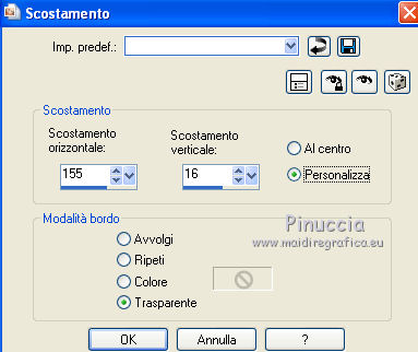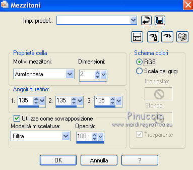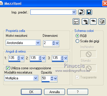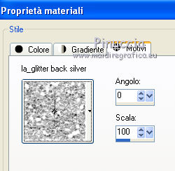 qui puoi trovare qualche risposta ai tuoi dubbi. Se l'argomento che ti interessa non è presente, ti prego di segnalarmelo. Questo tutorial è stato scritto con PSP X2, ma può essere eseguito anche con le altre versioni di PSP. Il copyright del tutorial, del materiale scrap e dei poser appartiene a Laguna Azul. Il copyright della traduzione è mio. Il copyright dei tubes e delle immagini appartiene ai rispettivi artisti. Per favore, rispetta il lavoro degli autori. traduzione in francese/traduction en français qui Occorrente: Il template di Missy Template347 qui Il resto del materiale qui Filtri: Alien Skin Eye Candy 5 Impact - Bevel qui ![]() 1. Apri "Template 347 con Missy". Duplicalo usando la combinazione di tasti maiuscola+D e chiudi l'originale. La copia sarà la base del tuo lavoro. 2. Apri i tre sfondi glitter "la_glitter_back_black", "la_glitter_back_pink", "la_glitter_back_silver", e minimizzali. Imposta lo sfondo rosa come colore di primo piano (che si alternerà con lo sfondo silver), e lo sfondo nero come colore di sfondo. ![]() 3. Prima di iniziare, una piccola spiegazione per il riempimento con i motivi di primo piano e sfondo. Si possono eseguire i seguenti passaggi. Selezione>Seleziona tutto. Selezione>Mobile. Selezione>Immobilizza. Strumento riempimento così impostato. ![]() Ora è possibile riempire la selezione. Selezione>Deseleziona. Per il riempimento dello sfondo, copiare la carta (Papier). Selezione>Seleziona tutto. Selezione>Mobile. Selezione>Immobilizza. Modifica>Incolla nella selezione. Così, quando scrivo di riempire con il motivo di primo piano o sfondo, oppure incolla la carta, procedi come descritto sopra. Per la mia traduzione, ho descritto i passaggi ogni volta. Lascio quanto descritto sopra come indicazione di massima per i tuoi prossimi lavori. 4. Livelli>Visualizza>Nessuno. 5. Apri e attiva il livello "glittered centre circle". Selezione>Seleziona tutto. Selezione>Mobile. Selezione>Immobilizza. Riempi con il motivo rosa di primo piano.6. Apri e attiva il livello soprastante "circle centre 1". Selezione>Seleziona tutto. Selezione>Mobile. Selezione>Immobilizza. Apri la carta "la_paper 1" e vai a Modifica>Copia. Torna al tuo lavoro e vai a Modifica>Incolla nella selezione. Selezione>Deseleziona. 7. Apri e attiva il livello soprastante "glittered circle right". Selezione>Seleziona tutto. Selezione>Mobile. Selezione>Immobilizza. Riempi con il motivo nero di sfondo.Selezione>Deseleziona. 8. Apri e attiva il livello successivo "rectangle 1". Apri il tube "la_ribbon wavy". Immagine>Ruota a destra o - sulla barra superiore degli strumenti - clicca sull'icona corrispondente ![]() Immagine>Ridimensiona, a 493 pixels di altezza. Modifica>Copia, e minimizza il tube perchè ti servirà ancora. Torna al tuo lavoro e vai a Modifica>Incolla come nuovo livello. Effetti>Effetti di immagine>Scostamento. ![]() ![]() 9. Apri e attiva il livello successivo "circle right". Selezione>Seleziona tutto. Selezione>Mobile. Selezione>Immobilizza. Apri "la_paper 2" e vai a Modifica>Copia. non chiuderla perchè ti servirà ancora Torna al tuo lavoro e vai a Modifica>Incolla nella selezione. Selezione>Deseleziona. Apri il tube "la_black ribbon with eyelet" e vai a Modifica>Copia. Torna al tuo lavoro e vai a Modifica>Incolla come nuovo livello. Effetti>Effetti di immagine>Scostamento. ![]() 10. Apri e attiva il livello successivo "glittered circle left". Selezione>Seleziona tutto. Selezione>Mobile. Selezione>Immobilizza. Riempi con il motivo di sfondo.Selezione>Deseleziona. Apri e attiva il livello successivo "rectangle 2". Attiva nuovamente il tube "la_ribbon wave" e vai a Modifica>Copia. Torna al tuo lavoro e vai a Modifica>Incolla come nuovo livello. Effetti>Effetti di immagine>Scostamento. ![]() 11. Apri e attiva il livello successivo "circle left". Selezione>Seleziona tutto. Selezione>Mobile. Selezione>Immobilizza. Attiva nuovamente "la_paper 2" e vai a Modifica>Copia. Torna al tuo lavoro e vai a Modifica>Incolla nella selezione. Selezione>Deseleziona. 12. Apri e attiva il livello successivo "square 1". Selezione>Seleziona tutto. Selezione>Mobile. Selezione>Immobilizza. Apri "la_paper 3" e vai a Modifica>Copia. Torna al tuo lavoro e vai a Modifica>Incolla nella selezione. Selezione>Deseleziona. Apri e attiva il livello successivo "square 2". Selezione>Seleziona tutto. Selezione>Mobile. Selezione>Immobilizza. Modifica>Incolla nella selezione (lo sfondo "la_paper3" è ancora in memoria). Selezione>Deseleziona. 13. Apri e attiva il livello successivo "frame background 1". Selezione>Seleziona tutto. Selezione>Mobile. Selezione>Immobilizza. Apri "la_paper 4" e vai a Modifica>Copia. Torna al tuo lavoro e vai a Modifica>Incolla nella selezione. Mantieni selezionato. Apri uno dei tube - per l'esempio "la_render_woman1_pink freak". Immagine>Ridimensiona, al 70%. Regola>Messa a fuoco>Metti a fuoco. Modifica>Copia. Torna al tuo lavoro e vai a Modifica>Incolla come nuovo livello. Posiziona il tube con il viso nel riquadro a sinistra.![]() Selezione>Inverti. Premi sulla tastiera il tasto CANC. Selezione>Deseleziona. Apri e attiva il livello successivo "frame background 2". Selezione>Seleziona tutto. Selezione>Mobile. Selezione>Immobilizza. Attiva nuovamente "la_paper4" e vai a Modifica>Copia. Torna al tuo lavoro e vai a Modifica>Incolla nella selezione. Apri il secondo tube - per l'esempio "la_render_woman2_pink freak" o, se preferisci rifletti il primo tube. Immagine>Ridimensiona, al 70%. Regola>Messa a fuoco>Metti a fuoco. Modifica>Copia. Torna al tuo lavoro e vai a Modifica>Incolla come nuovo livello. Posiziona il tube con il viso nel riquadro a destra.![]() Selezione>Inverti. Premi sulla tastiera il tasto CANC. Selezione>Deseleziona. 14. Apri il livello successivo "glittered frame 1" (rimane invariato). Apri e attiva il livello "heart frame 1". Effetti>Effetti artistici>Mezzitoni. ![]() Il livello Raster 1 è vuoto. Puoi eliminarlo. Apri il livello "glittered frame2" (rimane inviariato)