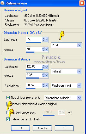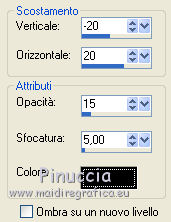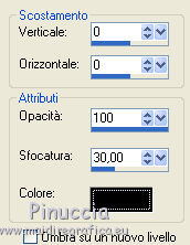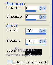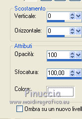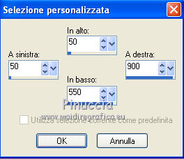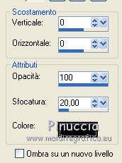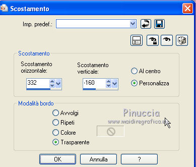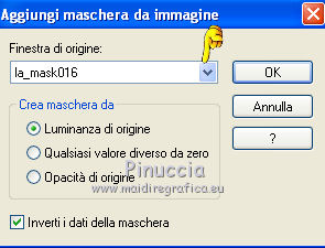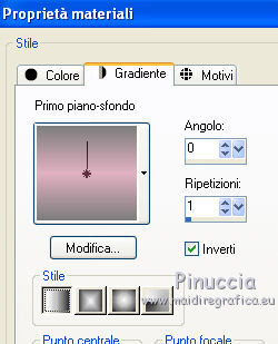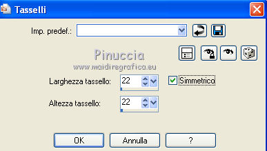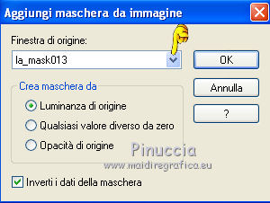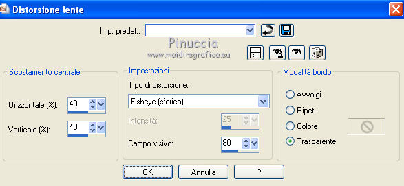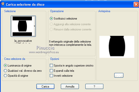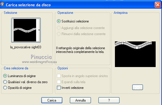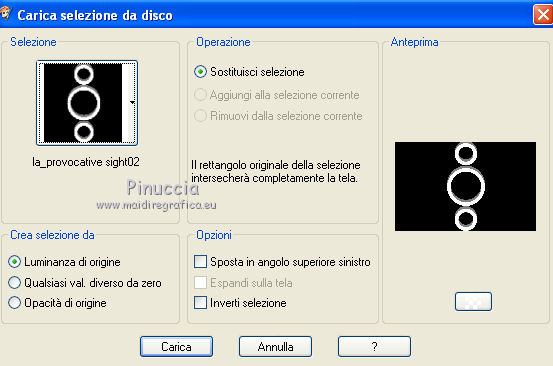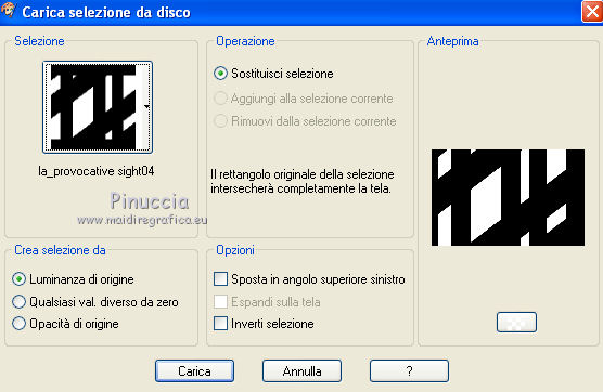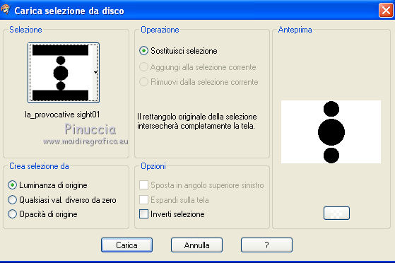 qui puoi trovare qualche risposta ai tuoi dubbi. Se l'argomento che ti interessa non è presente, ti prego di segnalarmelo. Il copyright del tutorial e del poser appartiene a Laguna Azul. Il copyright della traduzione è mio. Questo tutorial è stato scritto con PSP X2 e tradotto con Corel X, ma può essere eseguito anche con le altre versioni di PSP. Dalla versione X4, il comando Immagine>Rifletti è stato sostituito con Immagine>Capovolgi in orizzontale, e il comando Immagine>Capovolgi con Immagine>Capovolgi in verticale. Nelle versioni X5 e X6, le funzioni sono state migliorate rendendo disponibile il menu Oggetti. Con la nuova versione X7, sono tornati Rifletti>Capovolgi, ma con nuove varianti. Vedi la scheda sull'argomento qui traduzione francese/traduction française qui le vostre versioni quiOccorrente: Il tube di una donna e il tube di un uomo; oppure due tubes di donne. Il misted di una città. Il resto del materiale qui Per i tubes grazie Min@ e Gabry. (in questa pagina trovi i links ai siti dei creatori di tubes) Filtri: se hai problemi con i filtri, consulta la mia sezione filtri qui Filters Unlimited 2.0 qui Toadies qui Penta.com qui Alien Skin Eye Candy 5 Impact qui I filtri Toadies e Penta.com si possono usare da soli o importati in Filters Unlimited. come fare vedi qui) Se un filtro fornito appare con questa icona non esitare a cambiare modalità di miscelatura e opacità secondo i colori utilizzati. Nelle ultime versioni di PSP non c'è il gradiente di primo piano/sfondo (Corel_06_029) Puoi usare i gradienti delle versioni precedenti. Trovi qui i gradienti Corel X. Apri il font e minimizzalo. Lo troverai nella lista dei font disponibili quando ti servirà. Con i nuovi sistemi operativi questo non è più possibile. Per usare un font occorre copiarlo nella cartella Font di Windows. Metti il pennello nella cartella Pennelli. Attenzione, il pennello è composto da due files che non devono essere separati. Vedi gli appunti sui pennelli qui Metti le selezioni nella cartella Selezioni. Apri le maschere in PSP e minimizzale con il resto del materiale. 1. Apri una nuova immagine trasparente 950 x 600 pixels. Scegli due colori dai tuoi tubes, e imposta il colore di primo piano con un colore chiaro (#e1b1c2), e il colore di sfondo con un colore medio (#7d7d7d). ![]() Passa il colore di primo piano a Gradiente di primo piano/sfondo, stile Lineare. ![]() Riempi l'immagine trasparente con il colore di sfondo.Effetti>Plugins>Toadies - Picasso's Another Word: ![]() 2. Effetti>Effetti di distorsione>Tasselli: ![]() Effetti>Effetti di bordo>Aumenta di più. Livelli>Nuovo livello raster. Riempi il livello con il gradiente.Effetti>Plugins>Penta.com - Jeans. ![]() Livelli>Disponi>Sposta giù. 3. Attiva il livello superiore. Effetti>Effetti di distorsione>Distorsione lente. ![]() Premi il tasto K per attivare lo strumento Puntatore ![]() se stai usando PSP 9 il tasto D per attivare lo strumento Deformazione ![]() in modalità Scala ,spingi i nodi laterali ![]() verso l'esterno fino ai bordi ![]() Cambia la modalità di miscelatura di questo livello in Sovrapponi. Premi il tasto M per liberarti della griglia dello strumento. Effetti>Effetti 3D>Sfalsa ombra, con il colore nero. ![]() 4. Livelli>Nuovo livello raster. Attiva lo strumento Selezione ,clicca sull'icona Selezione personalizzata ![]() e imposta i seguenti settaggi: ![]() Riporta il colore di primo piano a Colore, e riempi la selezione con il colore di primo piano.Mantieni selezionato. Livelli>Nuovo livello raster. Riempi con il colore di sfondo.Immagine>Nuovo livello maschera>Da immagine, apri il menu sotto la finestra di origine e vedrai la lista dei files aperti. Seleziona la maschera "la_mask016". ![]() Livelli>Unisci>Unisci gruppo. Effetti>Effetti di bordo>Aumenta di più. Cambia la modalità di miscelatura di questo livello in Rafforza. 5. Mantieni ancora selezionato. Livelli>Nuovo livello raster. Riempi con il colore di primo piano.Apri la maschera "la_mask013" e minimizzala. Torna al tuo lavoro. Livelli>Nuovo livello maschera>Da immagine. Seleziona la maschera "la_mask013". ![]() Livelli>Unisci>Unisci gruppo. Effetti>Effetti di bordo>Aumenta. Cambia la modalità di miscelatura di questo livello in Indebolisci, e abbassa l'opacità al 27%. 6. Mantieni ancora selezionato. Apri il tube "la_©city". (Se stai usando un altro tube: Immagine>Ridimensiona a 800 pixels di larghezza, quindi Regola>Messa a fuoco>Metti a fuoco). Modifica>Copia. Torna al tuo lavoro e vai a Modifica>Incolla come nuovo livello. Spostalo un po' più a destra e in basso.![]() Selezione>Inverti. Premi sulla tastiera il tasto CANC. Selezione>Deseleziona. Attiva il terzo livello dal basso. ![]() Effetti>Effetti 3D>Sfalsa ombra, con i settaggi precedenti. 7. Chiudi i tre livelli inferiori, e attiva uno dei livelli visibili. ![]() Livelli>Unisci>Unisci visibile. Livelli>Visualizza>Tutto e rimani posizionato sul livello Uniti. 8. Effetti>Plugins>Toadies - What Are You? ![]() Effetti>Effetti di bordo>Aumenta. 9. Livelli>Nuovo livello raster. Riporta il colore di primo piano a Gradiente, e riempi il livello con il gradiente.Selezione>Carica/Salva selezione>Carica selezione da disco. Cerca e carica la selezione "la_provocative sight01". ![]() Premi sulla tastiera il tasto CANC. Selezione>Deseleziona. Cambia la modalità di miscelatura di questo livello in Rafforza. Attiva lo strumento Selezione , rettangolo, tolleranza 0,e seleziona i due cerchi piccoli. ![]() Premi sulla tastiera il tasto CANC. Selezione>Deseleziona. 10. Imposta il colore di primo piano con il bianco. Livelli>Nuovo livello raster. Selezione>Carica/Salva selezione>Carica selezione da disco. Cerca e carica la selezione "la_provocative sight02". ![]() Riempi la selezione con il colore bianco.Selezione>Deseleziona. Livelli>Nuovo livello raster. Selezione>Carica/Salva selezione>Carica selezione da disco. Cerca e carica la selezione "la_provocative sight02_Schatten". ![]() Effetti>Effetti 3D>Sfalsa ombra, c