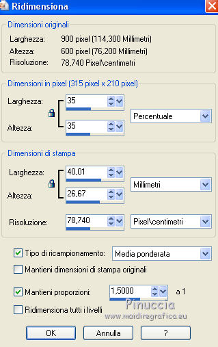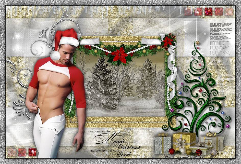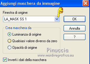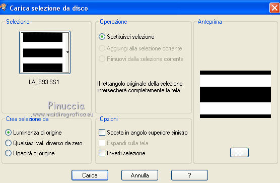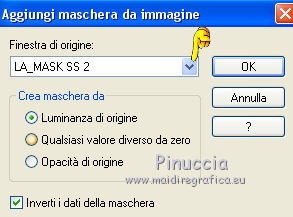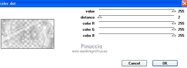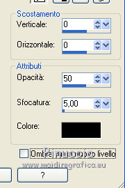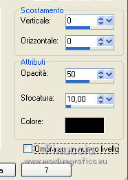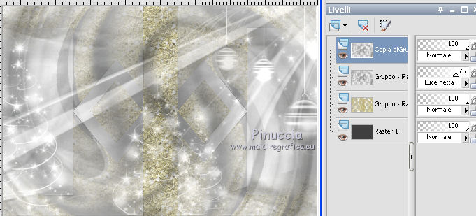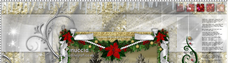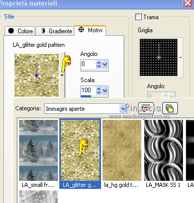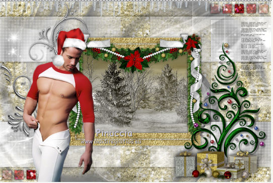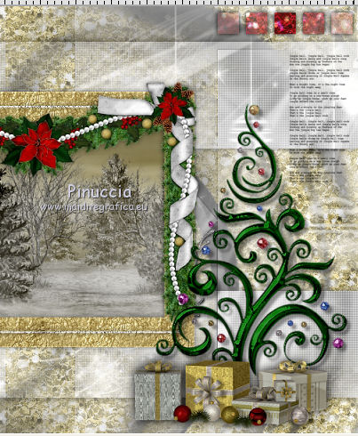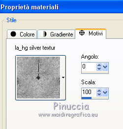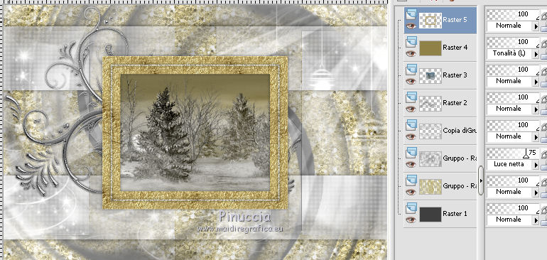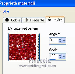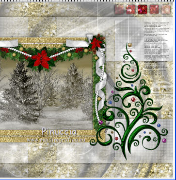 qui puoi trovare qualche risposta ai tuoi dubbi. Se l'argomento che ti interessa non è presente, ti prego di segnalarmelo. Il copyright del tutorial appartiene a Laguna Azul. Questo tutorial è stato creato con CorelX2, ma può essere realizzato anche con le altre versioni di PSP. Dalla versione X4, il comando Immagine>Rifletti è stato sostituito con Immagine>Capovolgi in orizzontale, e il comando Immagine>Capovolgi con Immagine>Capovolgi in verticale. Nelle versioni X5 e X6, le funzioni sono state migliorate rendendo disponibile il menu Oggetti. Con la nuova versione X7, sono tornati Rifletti>Capovolgi, ma con nuove varianti. Vedi la scheda sull'argomento qui Per tradurrlo ho usato PSP X. Traduzione francese/traduction en français qui Le vostre versioni qui Occorrente: A scelta: Il tube di un paesaggio (di circa 360 x 285 pixels), e il tube di un personaggio. Il resto del materiale qui Filtri: se hai problemi con i filtri, consulta la mia sezione filtri qui Filters Unlimited 2.0 qui Penta.com - Color Dot qui I filtri Penta.com si possono usare da soli o importati in Filters Unlimited. come fare vedi qui) Se un filtro fornito appare con questa icona ![]() Metti le selezioni nella cartella Selezioni. Apri le maschere in PSP e minimizzale. 1. Scegli e apri un glitter da abbinare al tuo tube - oro o argento - e minimizzalo. Apri una nuova immagine trasparente 900 x 600 pixels. Imposta il colore di primo piano con #404040. Riempi l'immagine trasparente con il colore #404040.2. Livelli>Nuovo livello raster. Passa il colore di sfondo a Motivi, e seleziona nella categoria immagini aperte, il motivo scelto. ![]() Riempi il livello con il motivo oro di sfondo (tasto destro del mouse).Livelli>Nuovo livello maschera>Da immagine. Apri il menu sotto la finestra di origine e vedrai la lista dei files aperti. Seleziona la maschera LA_MASK SS 1, con i seguenti settaggi. ![]() Livelli>Unisci>Unisci gruppo. 3. Apri l'immagine di sfondo "LA_XMAS HG" e vai a Modifica>Copia. Torna al tuo lavoro e vai a Modifica>Incolla come nuovo livello. Livelli>Nuovo livello maschera>Da immagine. Apri il menu sotto la finestra di origine e seleziona la maschera LA_MASK SS 2, con i seguenti settaggi. ![]() Livelli>Unisci>Unisci gruppo. Livelli>Duplica. Cambia la modalità di miscelatura del livello sottostante dell'originale in Luce netta, e abbassa l'opacità al 75%. se la tua paletta si presenta così, puoi rimanere posizionato sul livello superiore, perchè non è necessario attivare il livello per cambiare le proprietà. ![]() Assicurati di essere posizionato sul livello superiore. 4. Selezione>Carica/Salva selezione>Carica selezione da disco. Cerca e carica la selezione "LA_S93 SS1". ![]() Effetti>Plugins>Penta.com - Color dot. ![]() Selezione>Inverti. Premi sulla tastiera il tasto CANC ![]() Di nuovo Selezione>Inverti. Effetti>Effetti 3D>Sfalsa ombra. ![]() Selezione>Deseleziona. 5. Apri il tube "LA_deco" e vai a Modifica>Copia. Torna al tuo lavoro e vai a Modifica>Incolla come nuovo livello. Effetti>Effetti di immagine>Scostamento. ![]() Effetti>Effetti 3D>Sfalsa ombra. ![]() 6. Apri la piccola immagine di sfondo "LA_small frame hg" e vai a Modifica>Copia. Torna al tuo lavoro e vai a Modifica>Incolla come nuovo livello. Livelli>Nuovo livello raster. Imposta il colore di primo piano con #908247. Riempi il livello con il colore #908247.Cambia la modalità di miscelatura di questo livello in Tonalità (esistente). 7. Apri il tube "LA_small frame" e vai a Modifica>Copia. Torna al tuo lavoro e vai a Modifica>Incolla come nuovo livello. Effetti>Effetti 3D>Sfalsa ombra. ![]() Risultato: ![]() Scegli e apri uno dei tube "Christmas Swag" - per l'esempio "LA_Christmas Swag red". Torna al tuo lavoro e vai a Modifica>Incolla come nuovo livello. Effetti>Effetti di immagine>Scostamento. ![]() Effetti>Effetti 3D>Sfalsa ombra, con i settaggi precedenti. 8. Livelli>Nuovo livello raster. Selezione>Carica/Salva selezione>Carica selezione da disco. Cerca e carica la selezione "LA_S93 SS2". ![]() Cambia il motivo di sfondo con un altro colore abbinato al tuo lavoro. Per l'esempio ![]() Modalità di miscelatura dello strumento Riempimento Nessuno (basterà un solo clic per riempire) ![]() e riempi la selezione con il nuovo motivo (tasto destro del mouse).Selezione>Deseleziona. Livelli>Duplica. Livelli>Unisci>Unisci giù. Selezione>Carica/Salva selezione>Carica selezione da disco. Cerca e carica la selezione "LA_S93 SS3". ![]() Effetti>Effetti 3D>Sfalsa ombra. ![]() Selezione>Deseleziona. 9. Apri il pennello "LA_tiny text" e vai a Modifica>Copia. Torna al tuo lavoro e vai a Modifica>Incolla come nuovo livello. Effetti>Effetti di immagine>Scostamento. ![]() Abbassa l'opacità di questo livello al 75%. ![]() 10. Scegli e apri uno degli alberi di natale - per il mio esempio "LA_deco christmas tree mixed dark", e vai a Modifica>Copia. Torna al tuo lavoro e vai a Modifica>Incolla come nuovo livello. Spostalo in basso a destra.![]() Effetti>Effetti 3D>Sfalsa ombra. ![]() 11. Scegli e apri una delle confezioni regalo - per l'esempio "LA_gifts red", e vai a Modifica>Copia. Torna al tuo lavoro e vai a Modifica>Incolla come nuovo livello. Immagine>Ridimensiona, al 35%, tutti i livelli non selezionato. ![]() Regola>Messa a fuoco>Metti a fuoco. Effetti>Effetti 3D>Sfalsa ombra. ![]() Spostalo nell'angolo in basso a destra.![]() 12. Apri il tube "LA_icicles" e vai a Modifica>Copia. Torna al tuo lavoro e vai a Modifica>Incolla come nuovo livello. Spostalo in alto, contro il bordo superiore.![]() 13. Apri il tuo tube. Immagine>Ridimensiona, a 550 pixels di altezza. Modifica>Copia. Torna al tuo lavoro e vai a Modifica>Incolla come nuovo livello. Regola>Messa a fuoco>Metti a fuoco. Spostalo a sinistra.![]() Effetti>Effetti 3D>Sfalsa ombra, con i settaggi precedenti. 15. Apri il pennello "LA_chrismas text brush" e vai a Modifica>Copia. Torna al tuo lavoro e vai a Modifica>Incolla come nuovo livello. Spostalo dove preferisci.o vedi il mio esempio. ![]() 15