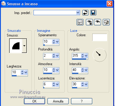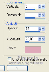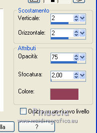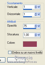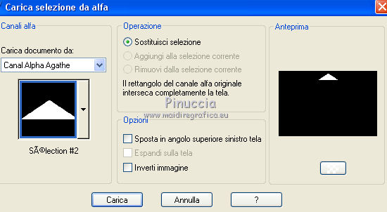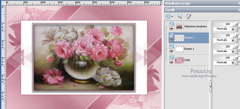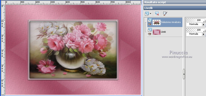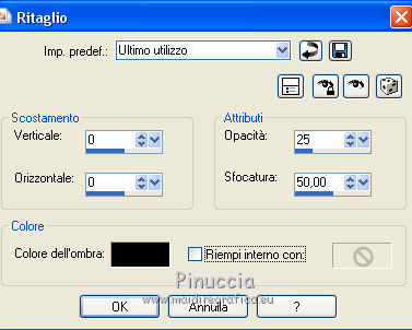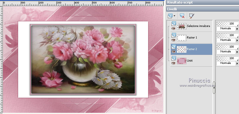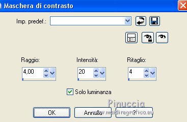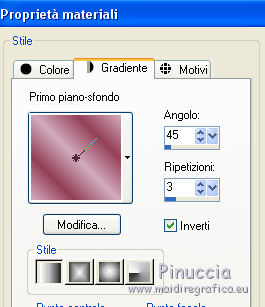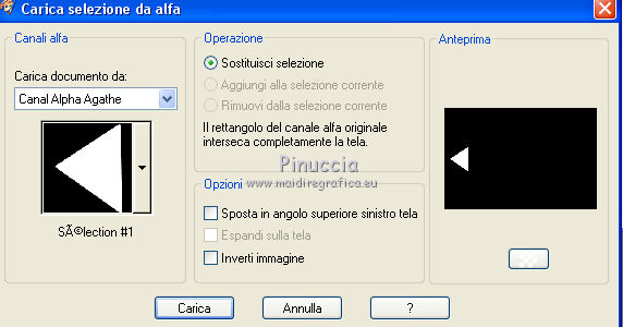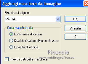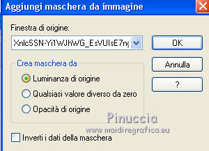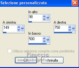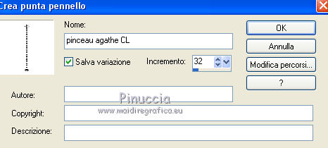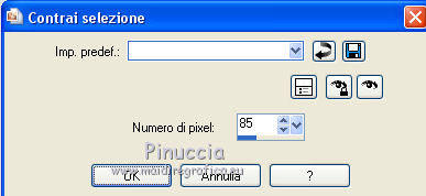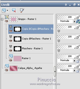 qui puoi trovare qualche risposta ai tuoi dubbi. Se l'argomento che ti interessa non è presente, ti prego di segnalarmelo. Questo tutorial è stato tradotto con Corel X e CorelX3, ma può essere realizzato anche con le altre versioni di PSP. Dalla versione X4, il comando Immagine>Rifletti è stato sostituito con Immagine>Capovolgi in orizzontale, e il comando Immagine>Capovolgi con Immagine>Capovolgi in verticale. Nelle versioni X5 e X6, le funzioni sono state migliorate rendendo disponibile il menu Oggetti. Con la nuova versione X7, sono tornati Rifletti>Capovolgi, ma con nuove varianti. Vedi la scheda sull'argomento qui traduzione in inglese/english translation qui/hereLe vostre versioni qui Occorrente: Materiale qui Per il tube della donna grazie Nadège. (in questa pagina trovi i links ai siti dei creatori di tubes) Filtri in caso di dubbi, ricorda di consultare la mia sezione filtri qui Alien Skin Eye Candy 5 Impact - Glass qui VM Toolbox - Instant Tile qui Toadies - What are you qui Ap Lines - Lines SilverLining qui Mehdi - Wavy Lab 1.1. qui Mura's Seamless - Emboss at Alpha qui Filters Unlimited 2.0 qui I filtri VM Toolbox, Toadies e Mura's Seamless si possono usare da soli o importati in Filters Unlimited (come fare vedi qui) Se un filtro fornito appare con questa icona ![]() non esitare a cambiare modalità di miscelatura e opacità secondo i colori utilizzati. Nelle ultime versioni di PSP non c'è il gradiente di primo piano/sfondo (Corel_06_029) Puoi usare i gradienti delle versioni precedenti. Trovi qui i gradienti Corel X. Metti il preset Cliccando sul file una o due volte (a seconda delle tue impostazioni), automaticamente il preset si installerà nella cartella corretta. perchè uno o due clic vedi qui Se preferisci, puoi importare direttamente il preset nel corso del tutorial Come fare vedi la scheda del filtro Eye Candy qui La trama Corel_15_021 è standard e corrisponde alla trama Tratteggio fine delle versioni precedenti. Se non la trovi nel tuo PSP, metti quella fornita nella cartella Trame. Apri le maschere in PSP e minimizzale con il resto del materiale. Colori utilizzati ![]() Imposta il colore di primo piano con #933f57, e il colore di sfondo con #e0a9ba. ![]() Passa il colore di primo piano a Gradiente di primo piano/sfondo, stile Lineare. ![]() 1. Apri "Canal Alpha Agathe". Duplicalo usando la combinazione di tasti maiuscola+D e chiudi l'originale. La copia, che sarà la base del tuo lavoro, non è vuota, ma contiene le selezioni salvate sul canale alfa. Riempi l'immagine trasparente con il gradiente.Regola>Sfocatura>Sfocatura gaussiana, raggio 30. ![]() Effetti>Effetti di trama>Trama - seleziona la trama Corel_15_021 o Tratteggio fine ![]() 2. Livelli>Nuovo livello raster. Imposta il colore di sfondo con il colore #d3abbe e riempi il livello con il nuovo colore di sfondo.Livelli>Nuovo livello maschera>Da immagine. Apri il menu sotto la finestra di origine e vedrai la lista dei files aperti. Seleziona la maschera 24_14. ![]() Livelli>Duplica - 2 volte. ![]() Effetti>Effetti di bordo>Aumenta. Regola>Messa a fuoco>Metti a fuoco. Livelli>Unisci>Unisci gruppo. Di nuovo Effetti>Effetti di bordo>Aumenta di più. Livelli>Unisci>Unisci visibile. 3. Attiva lo strumento Selezione ![]() (non importa il tipo di selezione impostato, perchè con la selezione personalizzata si ottiene sempre un rettangolo) clicca sull'icona Selezione personalizzata ![]() e imposta i seguenti settaggi. ![]() Selezione>Innalza selezione a livello. Imposta il colore di sfondo con il colore bianco #ffffff. ![]() Riempi la selezione con il colore bianco.Selezione>Modifica>Contrai - 4 pixels. Riempi la selezione con il colore scuro di primo piano #9333f57.Selezione>Modifica>Contrai - 2 pixels. Riempi la selezione con il colore bianco.Selezione>Modifica>Contrai - 4 pixels. Premi sulla tastiera il tasto CANC ![]() Selezione>Deseleziona. Effetti>Plugins>Alien Skin Eye Candy 5 Impact - Glass. Seleziona il preset ©agathe e ok ![]() Regola>Correzione fotografica in un passaggio. 4. Livelli>Nuovo livello raster (raster 1) Selezione personalizzata , con i settaggi precedenti.![]() Selezione>Modifica>Contrai - 10 pixels. Apri la tua immagine in jpg e vai a Modifica>Copia. Torna al tuo lavoro e vai a Modifica>Incolla nella selezione. Effetti>Plugins>Alien Skin Eye Candy 5 Impact - Glass, preset ©agathe ![]() Livelli>Nuovo livello raster. Effetti>Effetti 3D>Ritaglio. ![]() Selezione>Deseleziona. Livelli>Unisci>Unisci giù - 2 volte e avrai due livelli ![]() 5. Attiva il livello di sfondo. Livelli>Nuovo livello raster. Riempi con il colore bianco.Selezione>Seleziona tutto. Selezione>Modifica>Contrai - 85 pixels. ![]() Selezione>Inverti. Premi sulla tastiera il tasto CANC. Di nuovo Selezione>Inverti. Effetti>Effetti 3D>Sfalsa ombra, colore di primo piano #933f57. ![]() Ripeti l'Effetto Sfalsa ombra, cambiando verticale e orizzontale con -2. Selezione>Deseleziona. 6. Attiva nuovamente il livello di sfondo. Livelli>Nuovo livello raster. Riempi con il colore bianco.Livelli>Nuovo livello maschera>Da immagine. Apri il menu sotto la finestra di origine e seleziona la maschera XnlcSSN ![]() Regola>Messa a fuoco>Metti a fuoco. Livelli>Unisci>Unisci gruppo. Effetti>Effetti 3D>Sfalsa ombra, colore #30a9ba. ![]() Livelli>Unisci>Unisci giù. 7. Attiva il livello superiore. Livelli>Nuovo livello raster. Selezione>Carica/Salva selezione>Carica selezione da canale alfa. La selezione ©Agathe-01 è subito disponibile. Devi soltanto cliccare Carica. ![]() Riempi la selezione con il colore scuro di primo piano #933f57.Selezione>Deseleziona. Effetti>Plugins>AP Lines - Lines SilverLining. ![]() Livelli>Duplica. Immagine>Rifletti. Livelli>Unisci>Unisci giù. Effetti>Plugins>Toadies - What are you. ![]() Livelli>Disponi>Sposta giù. Effetti>Effetti 3D>Sfalsa ombra, colore di primo piano #933f57. ![]() Dovresti avere questo ![]() 8. Attiva il livello superiore. Livelli>Nuovo livello raster. Selezione>Carica/Salva selezione>Carica s