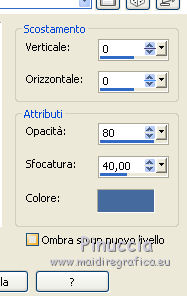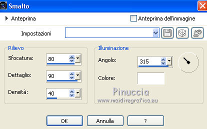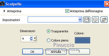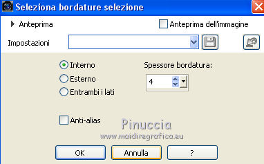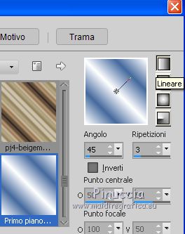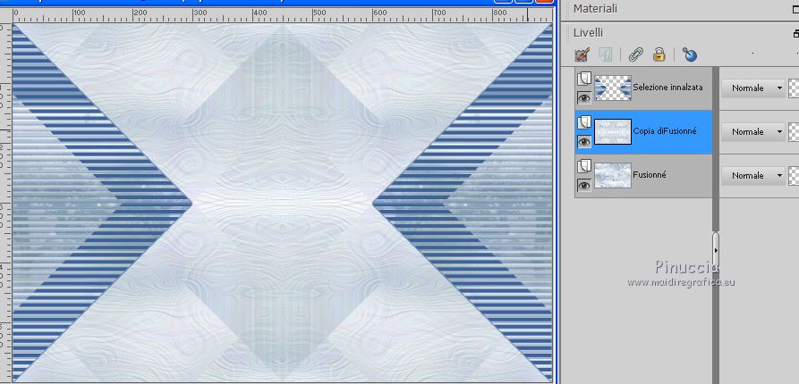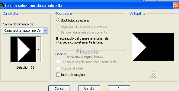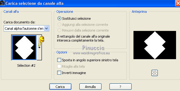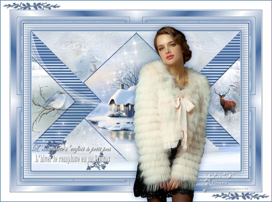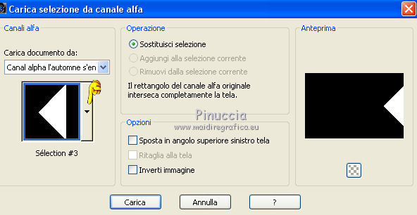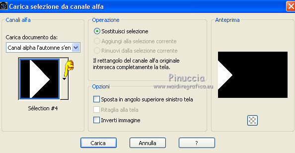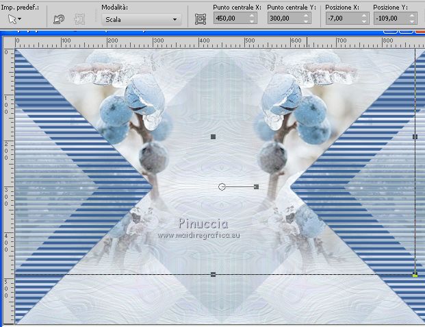 qui puoi trovare qualche risposta ai tuoi dubbi. Se l'argomento che ti interessa non è presente, ti prego di segnalarmelo. Questo tutorial è stato scritto con PSPX9 e tradotto con CorelX7 e CorelX3, ma può essere realizzato anche con le altre versioni di PSP. Dalla versione X4, il comando Immagine>Rifletti è stato sostituito con Immagine>Capovolgi in orizzontale, e il comando Immagine>Capovolgi con Immagine>Capovolgi in verticale. Nelle versioni X5 e X6, le funzioni sono state migliorate rendendo disponibile il menu Oggetti. Con la nuova versione X7, sono tornati Rifletti>Capovolgi, ma con nuove varianti. Vedi la scheda sull'argomento qui traduzione in inglese/english translation qui/hereOccorrente: Un tube a scelta. Il resto del materiale qui Grazie: per il tube della donna Sylvie Erwan. Il resto del materiale è di Laurette. (in questa pagina trovi i links ai siti dei creatori di tubes) Filtri in caso di dubbi, ricorda di consultare la mia sezione filtri qui Filters Unlimited 2.0 qui VM Instant Art - Tripolis qui Carolaine and Sensibility - CS-HLinearH qui Graphics Plus - Quick Tile I qui I filtri VM Instant Art e Graphics Plus si possono usare da soli o importati in Filters Unlimited (come fare vedi qui) Se un filtro fornito appare con questa icona ![]() non esitare a cambiare modalità di miscelatura e opacità secondo i colori utilizzati. Nelle ultime versioni di PSP non c'è il gradiente di primo piano/sfondo (Corel_06_029) Puoi usare i gradienti delle versioni precedenti. Trovi qui i gradienti Corel X. Imposta il colore di primo piano con il colore bianco, e il colore di sfondo con il colore #456a9e. ![]() Apri canal_alpha_l'automne_s'enfuit. Finestra>Duplica, o sulla tastiera maiuscola+D, per fare una copia. Chiudi l'originale. La copia, che sarà la base del tuo lavoro, non è vuota, ma contiene le selezioni salvate sul canale alfa. 1. Selezione>Seleziona tutto. Apri l'immagine di sfondo "fond", colorizza se stai usando altri colori, e vai a Modifica>Copia. Torna al tuo lavoro e vai a Modifica>Incolla nella selezione. Selezione>Deseleziona. 2. Livelli>Nuovo livello raster - Raster 1. Selezione>Seleziona tutto. Apri il tube paysage 1, e vai a Modifica>Copia. Torna al tuo lavoro e vai a Modifica>Incolla nella selezione. Selezione>Deseleziona. Effetti>Effetti di immagine>Motivo unico, con i settaggi standard. ![]() Livelli>Unisci>Unisci giù. Livelli>Duplica. Effetti>Effetti artistici>Smalto. ![]() 3. Effetti>Plugins>VM Instant Art - Tripolis, con i settaggi standard. ![]() Livelli>Duplica. Immagine>Capovolgi. Abbassa l'opacità di questo livello al 50%. Livelli>Unisci>Unisci giù. Effetti>Effetti di riflesso>Specchio rotante. ![]() 4. Attiva il livello di sfondo. Selezione>Carica/Salva selezione>Carica selezione da canale alfa. La selezione sélection#1 è subito disponibile. Devi soltanto cliccare Carica. ![]() Selezione>Innalza selezione a livello. Livelli>Disponi>Porta in alto. Effetti>Plugins>Carolaine and Sensibility - CS-LinearH ![]() Effetti>Effetti di trama>Veneziana, colore di sfondo. ![]() Selezione>Deseleziona. Livelli>Duplica. Immagine>Rifletti. Livelli>Unisci>Unisci giù. Effetti>Effetti 3D>Sfalsa ombra, colore di sfondo. ![]() Ripeti l'Effetto Sfalsa ombra, orizzontale -2. 5. Attiva il livello Copia di Uniti. ![]() Apri "tube fruit d'hiver", e vai a Modifica>Copia. Torna al tuo lavoro e vai a Modifica>Incolla come nuovo livello. Premi sulla tastiera il tasto K per attivare lo strumento Puntatore ![]() e imposta Posizione X: -7,00 e Posizione Y: -109,00 ![]() Tasto M per deselezionare lo strumento. Abbassa l'opacità di questo livello al 35%. 6. Attiva il livello di sfondo. Selezione>Carica/Salva selezione>Carica selezione da canale alfa. Apri il menu delle selezioni e carica sélection#2. ![]() Selezione>Innalza selezione a livello. Livelli>Disponi>Porta in alto. Selezione>Modifica>Seleziona bordature selezione. ![]() Livelli>Nuovo livello raster. Riempi con il colore di sfondo.Selezione>Deseleziona. Livelli>Unisci>Unisci giù. 7. Rimani su questo livello. Selezione>Carica/Salva selezione>Carica selezione da canale alfa. Apri il menu delle selezioni e carica nuovamente sélection#2. ![]() Selezione>Modifica>Contrai - 4 pixels. Apri il tube "paysage 2" e vai a Modifica>Copia. Torna al tuo lavoro e vai a Modifica>Incolla come nuovo livello. Posiziona correttamente il tube al centro della selezione.![]() Selezione>Inverti. Premi sulla tastiera il tasto CANC ![]() Selezione>Deseleziona Regola>Correzione fotografica in un passaggio. Livelli>Unisci>Unisci giù. 8. Attiva il livello di sfondo. Selezione>Carica/Salva selezione>Carica selezione da canale alfa. Apri il menu delle selezioni e carica sélection#3. ![]() Selezione>Innalza selezione a livello. Livelli>Disponi>Porta in alto. Apri "tube cerf" e vai a Modifica>Copia. Torna al tuo lavoro e vai a Modifica>Incolla come nuovo livello. Posiziona il tube sulla selezione.![]() Selezione>Inverti. Premi sulla tastiera il tasto CANC. Di nuovo Selezione>Inverti. Effetti>Effetti 3D>Scalpello - colore di sfondo. ![]() Selezione>Deseleziona. Livelli>Unisci>Unisci giù. 9. Attiva il livello di sfondo. Selezione>Carica/Salva selezione>Carica selezione da canale alfa. Apri il menu delle selezioni e carica sélection#4. ![]() Selezione>Innalza selezione a livello. Livelli>Disponi>Porta in alto. Apri "tube oiseau hiver" e vai a Modifica>Copia. Torna al tuo lavoro e vai a Modifica>Incolla come nuovo livello. Spostalo sulla selezione.![]() Selezione>Inverti. Premi sulla tastiera il tasto CANC. Di nuovo Selezione>Inverti. Effetti>Effetti 3D>Scalpello, con i settaggi precedenti. ![]() Selezione>Deseleziona. Livelli>Unisci>Unisci giù. 10. Apri il tube "déco scintillants" e vai a Modifica>Copia. Torna al tuo lavoro e vai a Modifica>Incolla come nuovo livello. Spostalo un po' più a sinistra.![]() 11. Apri il tube "déco fond neige" e vai a Modifica>Copia. Torna al tuo lavoro e vai a Modifica>Incolla come nuovo livello. Spostalo in bass