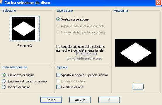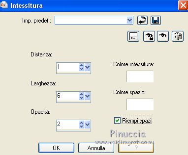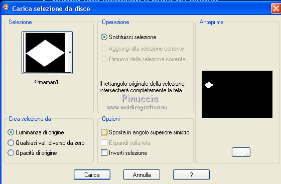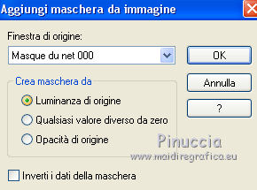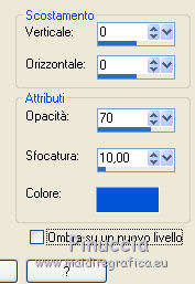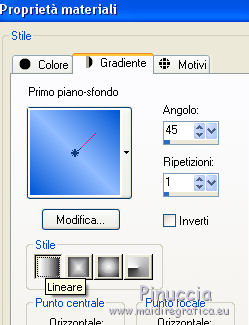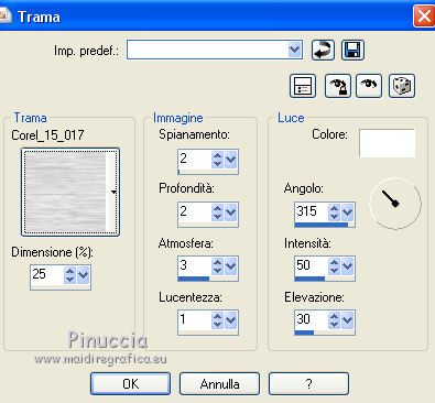 qui puoi trovare qualche risposta ai tuoi dubbi. Se l'argomento che ti interessa non è presente, ti prego di segnalarmelo. Questo tutorial è stato tradotto con Corel X e CorelX3, ma può essere realizzato anche con le altre versioni di PSP. Dalla versione X4, il comando Immagine>Rifletti è stato sostituito con Immagine>Capovolgi in orizzontale, e il comando Immagine>Capovolgi con Immagine>Capovolgi in verticale. Nelle versioni X5 e X6, le funzioni sono state migliorate rendendo disponibile il menu Oggetti. Con la nuova versione X7, sono tornati Rifletti>Capovolgi, ma con nuove varianti. Vedi la scheda sull'argomento qui traduzione in inglese/english translation qui/hereOccorrente: Materiale qui Per il tube della donna grazie Lady Bird. (in questa pagina trovi i links ai siti dei creatori di tubes) Filtri in caso di dubbi, ricorda di consultare la mia sezione filtri qui Filter Factory Gallery M - Faceter qui Simple - Top Left Mirror qui VM Toolbox - Instant Tile qui AAA Frames - Foto Frame qui FM Tile Tools - Blend Emboss qui Mura's Seamless - Emboss at Alpha qui Filters Unlimited 2.0 qui I filtri Factory Gallery, VM Toolbox, Simple e Mura's Seamless si possono usare da soli o importati in Filters Unlimited (come fare vedi qui) Se un filtro fornito appare con questa icona ![]() non esitare a cambiare modalità di miscelatura e opacità secondo i colori utilizzati. Nelle ultime versioni di PSP non c'è il gradiente di primo piano/sfondo (Corel_06_029) Puoi usare i gradienti delle versioni precedenti. Trovi qui i gradienti Corel X. Metti il pennello nella cartella Pennelli. Attenzione, il pennello è composto da due files che non devono essere separati. Vedi gli appunti sui pennelli qui La trama Grain long profond è standad in PSP e corrisponde alla trama italiana Grana luna intensa, o Corel_15_017 nelle versioni più recenti. Se non la trovi nel tuo PSP, metti quella fornita nella cartella Trame. Sulle nuove denominazioni delle cartelle in PSP vedi qui Metti le selezioni nella cartella Selezioni. Apri la maschera in PSP e minimizzala con il resto del materiale. Colori utilizzati ![]() 1. Apri una nuova immagine trasparente 900 x 600 pixels. Imposta il colore di primo piano con il colore scuro #0056d6, e il colore di sfondo con il colore chiaro #91bcff. ![]() Passa il colore di primo piano a Gradiente di primo piano/sfondo, stile Lineare. ![]() Riempi l'immagine trasparente con il gradiente.2. Effetti>Effetti di trama>Trama - seleziona la trama Grana lunga intensa o Corel_15_017 ![]() 3. Imposta il colore di primo piano con il colore bianco. Livelli>Nuovo livello raster. Riempi il livello con il colore bianco.4. Livelli>Nuovo livello maschera>Da immagine. Apri il menu sotto la finestra di origine e vedrai la lista dei files aperti. Seleziona la maschera masque du net 000. ![]() Regola>Messa a fuoco>Metti a fuoco. Effetti>Effetti di bordo>Aumenta. Livelli>Unisci>Unisci gruppo. 5. Effetti>Plugins>FM Tile Tools - Blend Emboss, con i settaggi standard - 2 volte. ![]() 6. Effetti>Plugins>Mura's Seamless - Emboss at Alpha. ![]() 7. Livelli>Nuovo livello raster. Selezione>Carica/Salva selezione>Carica selezione da disco. Cerca e carica la selezione ©maman3. ![]() Imposta nuovamente il colore di primo piano con il colore scuro #0056d6. ![]() Riempi la selezione con il colore di primo piano #0056d6.Selezione>Modifica>Contrai - 2 pixels. ![]() Riporta il colore di primo piano al Gradiente iniziale. ![]() Riempi la selezione con il gradiente iniziale.8. Effetti>Effetti di trama>Intessitura. entrambi i colori: bianco #ffffff ![]() Mantieni selezionato. 9. Apri l'immagine coeur de rose, colorizza secondo i tuoi colori e vai a Modifica>Copia. Torna al tuo lavoro e vai a Modifica>Incolla nella selezione. 10. Livelli>Nuovo livello raster. Attiva lo strumento Pennello ![]() cerca e seleziona il pennello pinceau ecriture CL ![]() Applica il pennello al centro, cliccando con il tasto destro del mouse per usare il colore chiaro di sfondo #91bcff (se preferisci, puoi usare il colore bianco). ![]() Livelli>Unisci>Unisci giù. 11. Effetti>Effetti 3D>Smusso a incasso. ![]() Selezione>Deseleziona. Immagine>Ridimensiona, al 105%, tutti i livelli non selezionato. ![]() 12. Effetti>Effetti 3D>Sfalsa ombra, colore nero ![]() 13. Livelli>Unisci>Unisci visibile. 14. Livelli>Nuovo livello raster. Selezione>Carica/Salva selezione>Carica selezione da disco. Cerca e carica la selezione ©maman01. ![]() Passa il colore di primo piano a Colore. Riempi il livello con il colore di primo piano #0056d6.Selezione>Modifica>Contrai - 1 pixel. Ancora una volta passa il colore di primo piano a Gradiente. Riempi la selezione con il gradiente.15. Effetti>Effetti di trama>Intessitura, con i settaggi precedenti. Effetti>Effetti 3D>Smusso a incasso, con i settaggi precedenti. Selezione>Deseleziona. 16. Immagine>Ridimensiona, al 105%, tutti i livelli non selezionato. Effetti>Effetti di immagine>Scostamento. ![]() 17. Effetti>Plugins>Simple - Top left mirror. Livelli>Duplica. Effetti>Effetti di immagine>Scostamento. ![]() 18. Livelli>Duplica. Immagine>Capovolgi. Livelli>Unisci>Unisci giù 2 volte. 19. Effetti>Effetti 3D>Sfalsa ombra, colore nero. ![]() 20. Apri il tube Bouton CL e vai a Modifica>Copia. Torna al tuo lavoro e vai a Modifica>Incolla come nuovo livello. Effetti>Effetti di immagine>Scostamento. ![]() Effetti>Plugins>Simple - Top Left Mirror. Effetti>Effetti 3D>Sfalsa ombra, con i settaggi precedenti. ![]() 21. Apri il tube déco CL dentelle e vai a Modifica>Copia. Torna al tuo lavoro e vai a Modifica>Incolla come nuovo livello. Se necessario, colorizza con lo strumento Trasforma in destinazione ![]() Prima di applicare lo strumento, imposta il colore di primo piano con il colore scelto. 22. Effetti>Effetti 3D>Sfalsa ombra, colore di primo piano #0056d6. ![]() 23. Immagine>Aggiungi bordatura, 1 pixel, simmetriche, colore chiaro di sfondo #91bcff. Immagine>Aggiungi bordatura, 3 pixels, simmetriche, colore bianco. Immagine>Aggiu