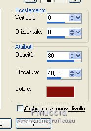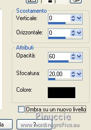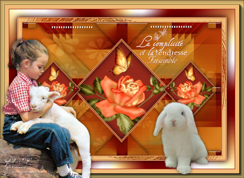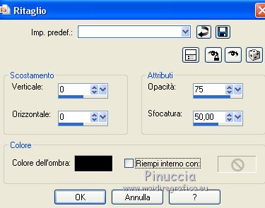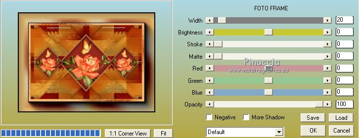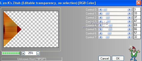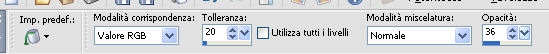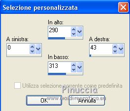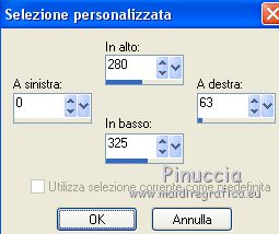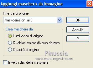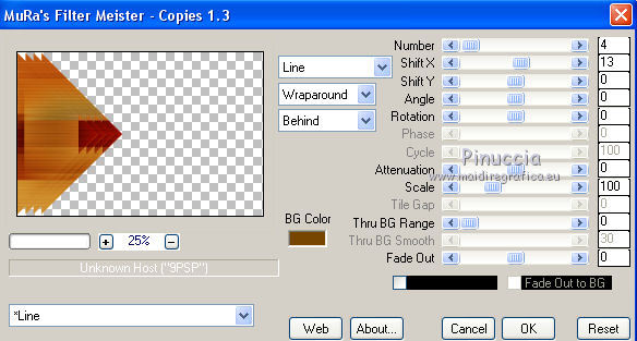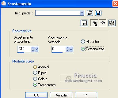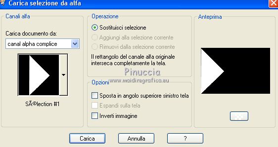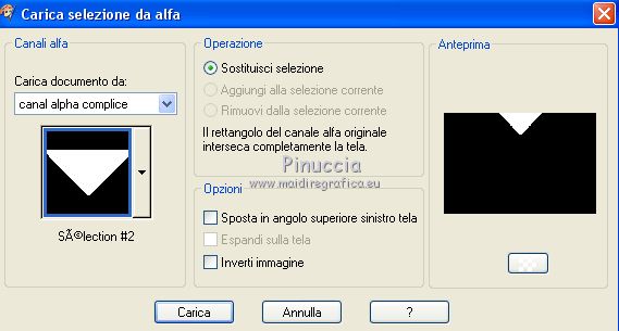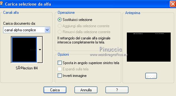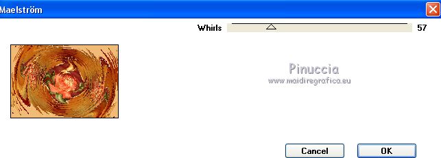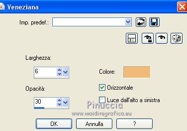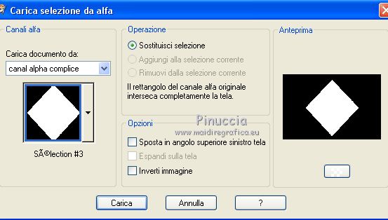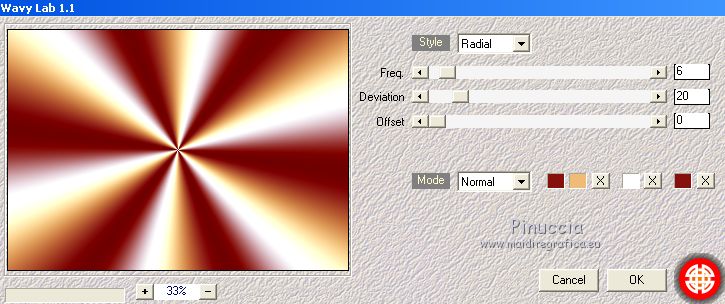 qui puoi trovare qualche risposta ai tuoi dubbi. Se l'argomento che ti interessa non è presente, ti prego di segnalarmelo. Questo tutorial è stato scritto con PSPX9 e tradotto con CorelX7 e CorelX3, ma può essere realizzato anche con le altre versioni di PSP. Dalla versione X4, il comando Immagine>Rifletti è stato sostituito con Immagine>Capovolgi in orizzontale, e il comando Immagine>Capovolgi con Immagine>Capovolgi in verticale. Nelle versioni X5 e X6, le funzioni sono state migliorate rendendo disponibile il menu Oggetti. Con la nuova versione X7, sono tornati Rifletti>Capovolgi, ma con nuove varianti. Vedi la scheda sull'argomento qui traduzione in inglese/english translation qui/hereOccorrente: Tubes a scelta il resto del materiale qui Per i tubes utilizzati e non forniti, grazie Rooske. Il resto del materiale è di Laurette. (in questa pagina trovi i links ai siti dei creatori di tubes) Filtri in caso di dubbi, ricorda di consultare la mia sezione filtri qui Filters Unlimited 2.0 qui AAA Frames - Foto Frame qui Simple - Pizza Slice Mirror qui Simple - Top Bottom Wrap (bonus) qui L&K's - L&K's Zitah qui Alien Skin Eye Candy 5 Impact - Glass qui Funhouse - Malestrom qui Mura's Meister - Copies qui Mehdi - Wavy lab 1.1. qui I filtri Simple e Funhouse si possono usare da soli o importati in Filters Unlimited (come fare vedi qui) Se un filtro fornito appare con questa icona ![]() non esitare a cambiare modalità di miscelatura e opacità secondo i colori utilizzati. Metti le selezioni nella cartella Selezioni (se preferisci usarle al posto del canale alpha). Apri la maschera in PSP e minimizzala con il resto del materiale. Colori utilizzati ![]() Imposta il colore di primo piano con il colore 1 #efbb77, e il colore di sfondo con il colore 2 #784500. ![]() 1. Apri canal_alpha_Complice Finestra>Duplica, o sulla tastiera maiuscola+D, per fare una copia. Chiudi l'originale. La copia, che sarà la base del tuo lavoro, non è vuota, ma contiene le selezioni salvate sul canale alfa. (Se preferisci: Apri una nuova immagine trasparente 900 x 600 pixels) Riempi l'immagine trasparente con il colore di sfondo.Selezione>Seleziona tutto. Apri il tube déco_perso e vai a Modifica>Copia. Torna al tuo lavoro e vai a Modifica>Incolla nella selezione. Selezione>Deseleziona. 2. Effetti>Effetti di immagine>Motivo unico, con i settaggi standard. ![]() Regola>Sfocatura>Sfocatura radiale ![]() Regola>Sfocatura>Sfocatura gaussiana, raggio 50 ![]() 3. Effetti>Plugins>Simple - Pizza Slice mirror. Effetti>Effetti di riflesso>Specchio rotante. ![]() Effetti>Effetti di bordo>Aumenta di più. Effetti>Effetti di trama>Veneziana, colore di primo piano ![]() Apri il tube fond2 (colorizza se necessario) e vai a Modifica>Copia. Torna al tuo lavoro e vai a Modifica>Incolla come nuovo livello. Cambia la modalità di miscelatura di questo livello in Sovrapponi. Livelli>Unisci>Unisci visibile. 4. Selezione>Carica/Salva selezione>Carica selezione da canale alfa. La selezione sélection#1 è subito disponibile. Devi soltanto cliccare Carica. ![]() se preferisci puoi fare Carica selezione da disco Selezione>Innalza selezione a livello. Selezione>Deseleziona. Effetti>Plugins>L&K's - L&K's Zitah ![]() Ripeti l'Effetto una seconda volta. Effetti>Plugins>Mura's Meister - Copies ![]() Livelli>Duplica. Immagine>Rifletti. Livelli>Unisci>Unisci giù. Effetti>Effetti 3D>Sfalsa ombra, colore nero. ![]() Effetti>Effetti di immagine>Motivo unico, con i settaggi standard. Livelli>Unisci>Unisci giù. 5. Attiva lo strumento Selezione ![]() (non importa il tipo di selezione impostato, perchè con la selezione personalizzata si ottiene sempre un rettangolo) clicca sull'icona Selezione personalizzata ![]() e imposta i seguenti settaggi. ![]() Selezione>Innalza selezione a livello. Selezione>Deseleziona. Livelli>Duplica. Immagine>Rifletti. Livelli>Unisci>Unisci giù. Effetti>Plugins>Simple - Top Bottom Wrap. Effetti>Plugins>Alien Skin Eye Candy 5 Impact - Glass. Seleziona il preset Clear, no drop shadow e ok ![]() Effetti>Effetti 3D>Sfalsa ombra, con i settaggi precedenti. ![]() 6. Attiva il livello di sfondo. Selezione>Carica/Salva selezione>Carica selezione da canale alfa. Apri il menu delle selezioni e carica sélection#2. ![]() Selezione>Innalza selezione a livello. Selezione>Deseleziona. Livelli>Duplica. Immagine>Capovolgi. Livelli>Unisci>Unisci giù. Effetti>Plugins>Alien Skin Eye Candy 5 Impact - Glass, con i settaggi precedenti. ![]() Effetti>Effetti 3D>Sfalsa ombra, con i settaggi precedenti. ![]() 7. Attiva il livello di sfondo, Uniti. Imposta il colore di sfondo con il colore bianco #ffffff. Abbassa l'opacità dello strumento Riempimento a 36 ![]() Livelli>Nuovo livello raster. Riempi il livello con il colore bianco.Riporta l'opacità dello strumento Riempimento a 100. Livelli>Nuovo livello maschera>Da immagine. Apri il menu sotto la finestra di origine e vedrai la lista dei files aperti. Seleziona la maschera maskcameron_air6. ![]() Livelli>Unisci>Unisci gruppo. Cambia la modalità di miscelatura di questo livello in Luce diffusa. 8. Imposta il colore di sfondo con il colore 3 #86100c. ![]() Attiva il livello superiore. Livelli>Nuovo livello raster. Selezione>Carica/Salva selezione>Carica selezione da canale alfa. Apri il menu delle selezioni e carica sélection#3. ![]() Riempi la selezione con il colore di primo piano.Selezione>Modifica>Contrai - 3 pixels. ![]() Riempi la selezione con il colore di sfondo.Selezione>Modifica>Contrai - 3 pixels. Riempi la selezione con il colore di primo piano.Selezione>Modifica>Contrai - 3 pixels. Riempi la selezione con il colore di sfondo.Effetti>Effetti di trama>Veneziana - colore di primo piano. ![]() Apri il tube déco-perso e vai a Modifica>Copia. Torna al tuo lavoro e vai a Modifica>Incolla nella selezione. Mantieni selezionato. Livelli>Nuovo livello raster. Effetti>Effetti 3D>Ritaglio. ![]() Selezione>Deseleziona. Livelli>Unisci>Unisci giù. Immagine>Ridimensiona, al 90%, tutti i livelli no