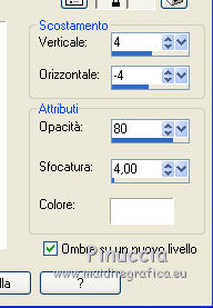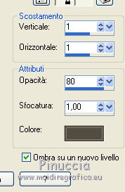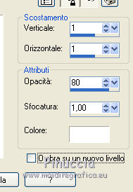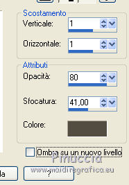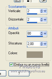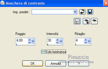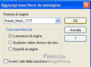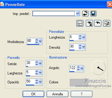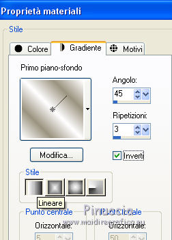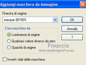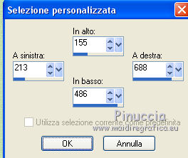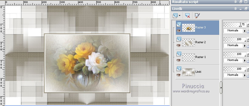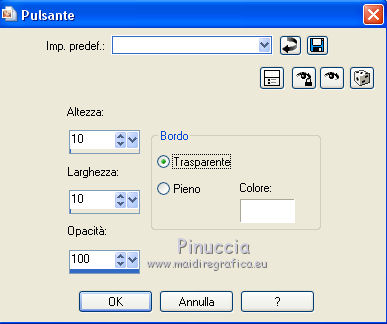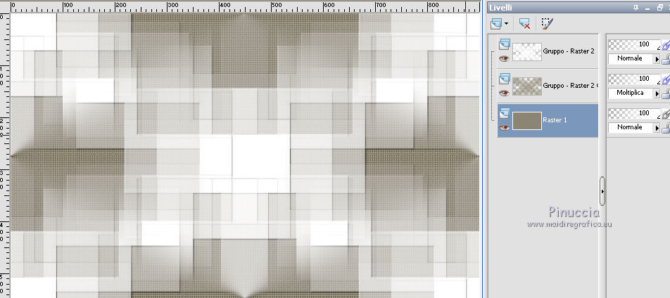 qui puoi trovare qualche risposta ai tuoi dubbi. Se l'argomento che ti interessa non è presente, ti prego di segnalarmelo. Questo tutorial è stato scritto con PSPX9 e tradotto con CorelX7 e CorelX3, ma può essere realizzato anche con le altre versioni di PSP. Dalla versione X4, il comando Immagine>Rifletti è stato sostituito con Immagine>Capovolgi in orizzontale, e il comando Immagine>Capovolgi con Immagine>Capovolgi in verticale. Nelle versioni X5 e X6, le funzioni sono state migliorate rendendo disponibile il menu Oggetti. Con la nuova versione X7, sono tornati Rifletti>Capovolgi, ma con nuove varianti. Vedi la scheda sull'argomento qui traduzione in inglese/english translation qui/hereLe vostre versioni qui Occorrente: Un tube a scelta. Il resto del materiale qui Grazie: per il tube Colybrix. Il resto del materiale è di Laurette. (in questa pagina trovi i links ai siti dei creatori di tubes) Filtri in caso di dubbi, ricorda di consultare la mia sezione filtri qui Filters Unlimited 2.0 qui Mura's Seamless - Emboss at Alpha qui Carolaine and Sensibility - CS-LDots qui Mura's Meister - copies qui Cybia - Screenworks qui Nik Software - Color Efex Pro qui Adjust - Variations qui Graphics Plus - Cross Shadow qui Simple - Top Left Mirror qui L&K's - L&K's Paris qui I filtri Mura's Seamless, Cybia, Simple e Graphics Plus si possono usare da soli o importati in Filters Unlimited (come fare vedi qui) Se un filtro fornito appare con questa icona ![]() non esitare a cambiare modalità di miscelatura e opacità secondo i colori utilizzati. Nelle ultime versioni di PSP non c'è il gradiente di primo piano/sfondo (Corel_06_029) Puoi usare i gradienti delle versioni precedenti. Trovi qui i gradienti Corel X. Metti i pennelli nella cartella Pennelli. Attenzione, il pennello è composto da due files che non devono essere separati. Vedi gli appunti sui pennelli qui Nel materiale trovi anche il pennello in formato png (cartella Divers). Apri le maschere in PSP e minimizzale con il resto del materiale. 1. Imposta il colore di primo piano con il colore #9b9380, e il colore di sfondo con il colore bianco #ffffff. ![]() Prepara il colore di primo piano con un Gradiente di primo piano/sfondo, stile Lineare ![]() Passa il colore di primo piano a Colore. 2. Apri una nuova immagine trasparente 900 x 600 pixels. Riempi l'immagine trasparente con il colore di primo piano #9b9380.Livelli>Nuovo livello raster. Riempi con il colore bianco di sfondo.Livelli>Nuovo livello maschera>Da immagine. Apri il menu sotto la finestra di origine e vedrai la lista dei files aperti. Seleziona la maschera @100%. ![]() Livelli>Unisci>Unisci gruppo. Effetti>Effetti di bordo>Aumenta. 3. Livelli>Duplica. Immagine>Rifletti. Livelli>Unisci>Unisci giù. Effetti>Plugins>Mura's Seamless - Emboss at alpha. ![]() Livelli>Duplica. Immagine>Capovolgi. Abbassa l'opacità di questo livello al 45%. Livelli>Unisci>Unisci giù. 4. Effetti>Effetti di immagine>Motivo unico, con i settaggi standard. ![]() Effetti>Effetti 3D>Sfalsa ombra, colore #9b9380, ombra su nuovo livello selezionato. ![]() Cambia la modalità di miscelatura del livello dell'ombra in Moltiplica. Attiva il livello superiore. Effetti>Plugins>Mura's Seamless - Emboss at alpha, con i settaggi precedenti. Attiva il livello di sfondo, Raster 1. Effetti>Plugins>Carolaine and Sensibility - CS-LDots. ![]() Regola>Messa a fuoco>Accentua messa a fuoco - 2 volte. ![]() Livelli>Unisci>Unisci visibile. 5. Attiva lo strumento Selezione ![]() (non importa il tipo di selezione impostato, perchè con la selezione personalizzata si ottiene sempre un rettangolo) clicca sull'icona Selezione personalizzata ![]() e imposta i seguenti settaggi. ![]() Livelli>Nuovo livello raster, Raster 1. Riempi con il colore di primo piano.Selezione>Modifica>Contrai - 4 pixels. Premi sulla tastiera il tasto CANC ![]() Livelli>Nuovo livello raster, Raster 2 Riempi con il colore di sfondo #ffffff.Selezione>Modifica>Contrai - 6 pixels. Premi sulla tastiera il tasto CANC. Abbassa l'opacità dello strumento Riempimento a 35 Riempi di nuovo con il colore bianco.Selezione>Modifica>Contrai - 12 pixels. Riporta l'opacità dello strumento Riempimento a 100 Riempi ancora con il colore bianco.Selezione>Modifica>Contrai - 6 pixels. Premi sulla tastiera il tasto CANC. Selezione>Deseleziona. Effetti>Plugins>Mura's Seamless - Emboss at alpha, con i settaggi precedenti. ![]() Livelli>Unisci>Unisci giù. 6. Livelli>Nuovo livello raster, Raster 2. Selezione personalizzata , con i settaggi precedenti![]() Selezione>Modifica>Contrai - 8 pixels. Passa il colore di primo piano al Gradiente preparato all'inizio. ![]() Riempi la selezione con il gradiente.Regola>Sfocatura>Sfocatura gaussiana - raggio 25. ![]() Effetti>Effetti tecniche di disegno>Pennellate. ![]() Apri il tube fond fleur e vai a Modifica>Copia. Torna al tuo lavoro e vai a Modifica>Incolla come nuovo livello. Posiziona il tube al centro.Selezione>Inverti. Premi sulla tastiera il tasto CANC. Di nuovo Selezione>Inverti. Abbassa l'opacità al 75%. Selezione>Deseleziona. Dovresti avere questo ![]() Livelli>Unisci>Unisci giù. Livelli>Disponi>Sposta giù. Attiva il livello superiore. Livelli>Unisci>Unisci giù. 7. Livelli>Duplica. Immagine>Ridimensiona, al 40%, tutti i livelli non selezionato. Premi sulla tastiera il tasto K per attivare lo strumento Puntatore ![]() e imposta Posizione X: 698,00 e Posizione Y: 12.00 ![]() Tasto M per deselezionare lo strumento. Effetti>Plugins>Mura's Meister - Copies. ![]() Effetti>Effetti 3D>Sfalsa ombra, colore #534d41. ![]() 8. Attiva il livello Raster 2. Attiva lo strumento Bacchetta magica ![]() ![]() Clicca sul piccolo bordo del quadro centrale per selezionarlo. ![]() Effetti>Plugins>Cybia - Screenworks - Dot Screen ![]() Effetti>Effetti 3D>Smusso a incasso. ![]() Selezione>Deseleziona. Effetti>Effetti 3D>Sfalsa ombra, con i settaggi precedenti. 9. Attiva il livello di sfondo. Apri il tube déco dentelle e vai a Modifica>Copia. Torna al tuo 