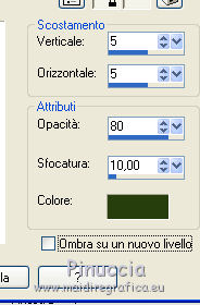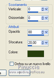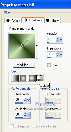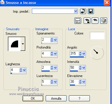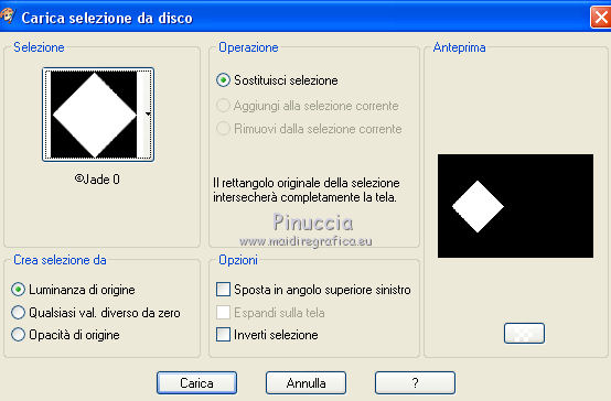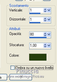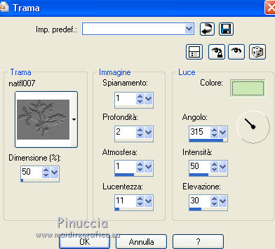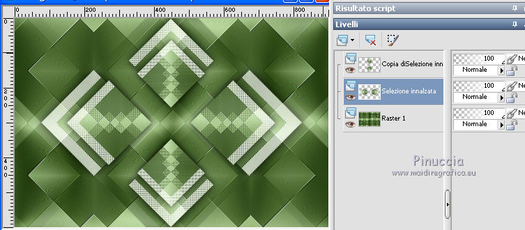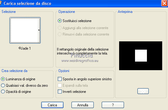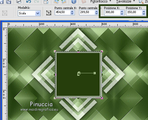 qui puoi trovare qualche risposta ai tuoi dubbi. Se l'argomento che ti interessa non è presente, ti prego di segnalarmelo. Questo tutorial è stato scritto con PSP 8 e tradotto con CorelX e CorelX3, ma può essere realizzato anche con le altre versioni di PSP. Dalla versione X4, il comando Immagine>Rifletti è stato sostituito con Immagine>Capovolgi in orizzontale, e il comando Immagine>Capovolgi con Immagine>Capovolgi in verticale. Nelle versioni X5 e X6, le funzioni sono state migliorate rendendo disponibile il menu Oggetti. Con la nuova versione X7, sono tornati Rifletti>Capovolgi, ma con nuove varianti. Vedi la scheda sull'argomento qui traduzione in inglese/english translation qui/hereLe vostre versioni qui Occorrente: Materiale qui Per il tube grazie Babette. (in questa pagina trovi i links ai siti dei creatori di tubes) Filtri in caso di dubbi, ricorda di consultare la mia sezione filtri qui Filters Unlimited 2.0 qui &<Background Designer IV> - sf10 Slide N Dice (da importare in Unlimited) qui CPK Designs - Mirror qui L&K's - L&K's Katharina qui Simple - Zoom out and flip, Top Left Mirror qui I filtri Simple e CPK Designs si possono usare da soli o importati in Filters Unlimited (come fare vedi qui) Se un filtro fornito appare con questa icona ![]() non esitare a cambiare modalità di miscelatura e opacità secondo i colori utilizzati. Nelle ultime versioni di PSP non c'è il gradiente di primo piano/sfondo (Corel_06_029) Puoi usare i gradienti delle versioni precedenti. Trovi qui i gradienti Corel X. Metti il pennello nella cartella Pennelli. Attenzione, il pennello è composto da due files che non devono essere separati. Vedi gli appunti sui pennelli qui Metti il preset Emboss 3 nella cartella Impostazioni predefinite. Metti le selezioni nella cartella Selezioni. Metti la trama natfl007 nella cartella Trame. 1. Apri una nuova immagine trasparente 900 x 600 pixels. Imposta il colore di primo piano con #cce8b5, e il colore di sfondo con #263e0f. ![]() Passa il colore di primo piano a Gradiente di primo piano/sfondo, stile Radiale. ![]() Riempi l'immagine trasparente con il gradiente.Regola>Sfocatura>Sfocatura gaussiana, raggio 30. ![]() Effetti>Plugins>Filters Unlimited 2.0 - &<Background designers IV> - sf10 Slice N Dice. ![]() Regola>Messa a fuoco>Metti a fuoco. Effetti>Effetti di bordo>Aumenta. 2. Livelli>Duplica. Effetti>Plugins>Filters Unlimited 2.0 - CPK Designs - Mirror. ![]() Cambia la modalità di miscelatura di questo livello in Luce diffusa, e abbassa l'opacità al 50%. Livelli>Unisci>Unisci giù. 3. Livelli>Duplica. Effetti>Plugins>Simple - Zoom out and flip. Abbassa l'opacità di questo livello al 65%. Effetti>Filtro definito dall'utente, seleziona il preset Emboss 3 e ok. ![]() Livelli>Unisci>Unisci giù. 4. Imposta il colore di primo piano con il colore bianco. ![]() Selezione>Carica/Salva selezione>Carica selezione da disco. Cerca e carica la selezione ©Jade0. ![]() Selezione>Innalza selezione a livello. Selezione>Deseleziona. 5. Effetti>Plugins>L&K's - L&K's Katharina. ![]() Effetti>Effetti 3D>Sfalsa ombra, colore nero. ![]() Livelli>Duplica. Immagine>Rifletti. Livelli>Unisci>Unisci giù. 6. Di nuovo Livelli>Duplica. Immagine>Ruota per gradi - 90 gradi a sinistra. ![]() Immagine>Ridimensiona, all'80%, tutti i livelli non selezionato. ![]() Di nuovo Immagine>Ruota per gradi - 90 gradi a sinistra. ![]() Livelli>Unisci>Unisci giù. 7. Livelli>Duplica. Ancora Immagine>Ruota per gradi - 90 gradi a sinistra. Immagine>Ridimensiona, all'80%, tutti i livelli non selezionato. 8. Attiva il livello sottostante. ![]() Immagine>Ridimensiona, all'80%, tutti i livelli non selezionato. Livelli>Unisci>Unisci visibile. 9. Livelli>Nuovo livello raster. Selezione>Carica/Salva selezione>Carica selezione da disco. Cerca e carica la selezione ©Jade 1. ![]() Riempi la selezione con il colore bianco.Selezione>Modifica>Contrai - 3 pixels. 10. Riempi con il colore scuro.Selezione>Modifica>Contrai - 3 pixels. Riempi con il colore bianco.Selezione>Modifica>Contrai - 3 pixels. Riempi con il colore scuro.Selezione>Deseleziona. 11. Immagine>Ridimensiona, al 120%, tutti i livelli non selezionato. Oggetti>Allinea>Centra nella tela. o tasto K per attivare lo strumento Puntatore ![]() e imposta Posizione X: 300.00 e Posizione Y: 150,00 ![]() 12. Apri il tube Déco Jade 1 e vai a Modifica>Copia. Torna al tuo lavoro e vai a Modifica>Incolla come nuovo livello. Non spostarlo. E' correttamente posizionato. Se vuoi cambiare colore a questo tube, usa lo strumento Cambio colore ![]() e fai clic con il colore che desideri. Effetti>Effetti 3D>Sfalsa ombra, con i settaggi precedenti. ![]() Livelli>Unisci>Unisci giù. 13. Livelli>Duplica. Immagine>Ridimensiona, al 72%, tutti i livelli non selezionato. Immagine>Ruota per gradi - 45 gradi a sinistra ![]() Livelli>Unisci>Unisci giù. Effetti>Effetti 3D>Sfalsa ombra, con i settaggi precedenti. 14. Apri il tube Déco Jade 2 e vai a Modifica>Copia. Torna al tuo lavoro e vai a Modifica>Incolla come nuovo livello. Effetti>Effetti di trama>Trama - seleziona la trama natfl007, colore chiaro #cce8b5. ![]() Effetti>Effetti 3D>Sfalsa ombra, colore scuro. ![]() Ripeti l'Effetto Sfalsa ombra, cambiando verticale e orizzontale a -5. Livelli>Duplica. Livelli>Unisci>Unisci giù. Effetti>Effetti 3D>Sfalsa ombra, colore nero. ![]() 15. Apri il tube Déco Jade 3 e vai a Modifica>Copia. Torna al tuo lavoro e vai a Modifica>Incolla come nuovo livello. Sulla tastiera premi il tasto K per attivare lo strumento Puntatore ![]() e imposta Posizione X: 39,00 e Posizione Y: 193,00. ![]() Tasto M per deselezionare lo strumento. Livelli>Duplica. Immagine>Rifletti. Livelli>Unisci>Unisci giù. 16. Apri il tube Déco Jade 4 e vai a Modifica>Copia. Torna al tuo lavoro e vai a Modifica>Incolla come nuovo livello. Non spostarlo. Effetti>Effetti 3D>Sfalsa ombra, colore nero. ![]() Livelli>Unisci>Unisci visibile. 17. Livelli>Nuovo livello raster. Attiva lo strumento Pennello ![]() cerca e selezion