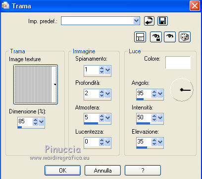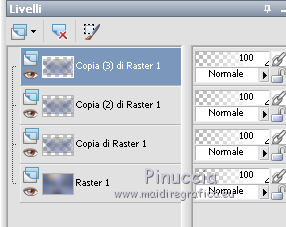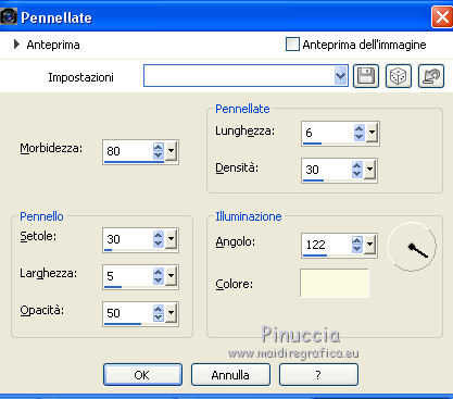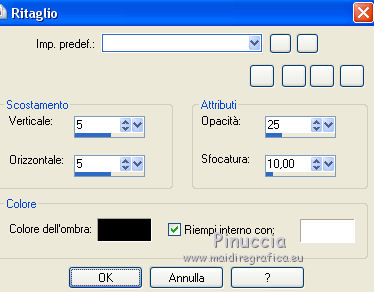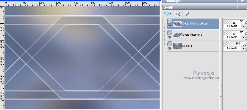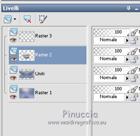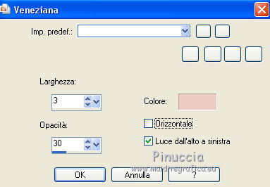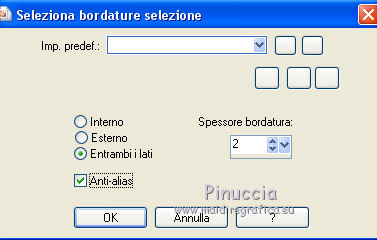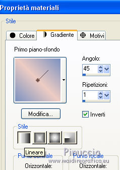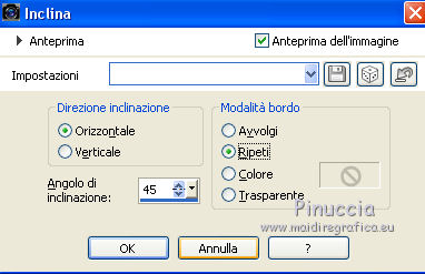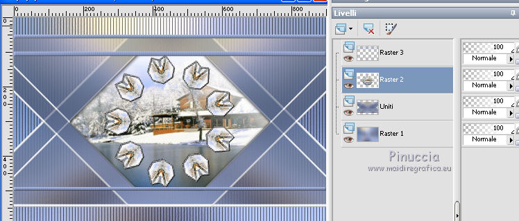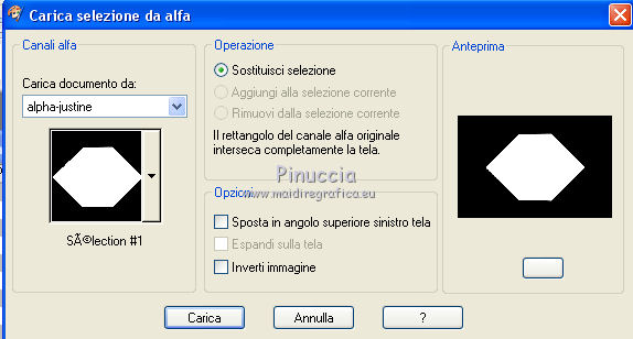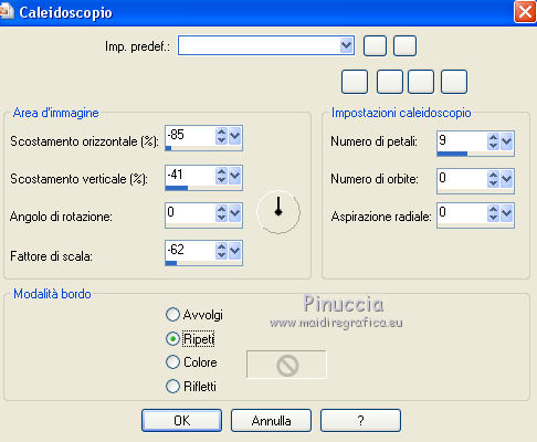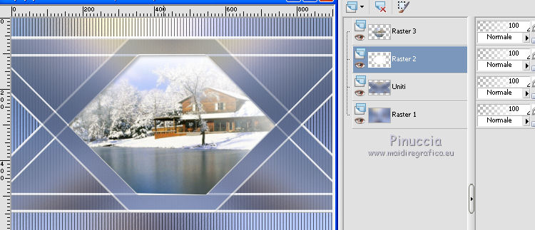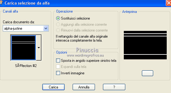 qui puoi trovare qualche risposta ai tuoi dubbi. Se l'argomento che ti interessa non è presente, ti prego di segnalarmelo. Questo tutorial è stato scritto con PSPX9 e tradotto con CorelX7 e CorelX3, ma può essere realizzato anche con le altre versioni di PSP. Dalla versione X4, il comando Immagine>Rifletti è stato sostituito con Immagine>Capovolgi in orizzontale, e il comando Immagine>Capovolgi con Immagine>Capovolgi in verticale. Nelle versioni X5 e X6, le funzioni sono state migliorate rendendo disponibile il menu Oggetti. Con la nuova versione X7, sono tornati Rifletti>Capovolgi, ma con nuove varianti. Vedi la scheda sull'argomento qui traduzione in inglese/english translation qui/hereOccorrente: Materiale qui Grazie per il tube della donna grazie Babette e per il paesaggio Animabelle Il resto del materiale è di Laurette. (in questa pagina trovi i links ai siti dei creatori di tubes) Filtri in caso di dubbi, ricorda di consultare la mia sezione filtri qui Filters Unlimited 2.0 qui Cybia - Screenworks qui Flaming Pear - Flood qui Alien Skin Eye Candy 5 Impact - Glass qui Tramages - Gradient/Spokes Radio Maker qui I filtri Cybia e Tramages si possono usare da soli o importati in Filters Unlimited (come fare vedi qui) Se un filtro fornito appare con questa icona ![]() non esitare a cambiare modalità di miscelatura e opacità secondo i colori utilizzati. Nelle ultime versioni di PSP non c'è il gradiente di primo piano/sfondo (Corel_06_029) Puoi usare i gradienti delle versioni precedenti. Trovi qui i gradienti Corel X. Metti la trama "Image texture store015" nella cartella Trame. Imposta il colore di primo piano con il colore #edccc3, e il colore di sfondo con il colore #7c92c1. ![]() 1. Apri alpha_justine. Finestra>Duplica, o sulla tastiera maiuscola+D, per fare una copia. Chiudi l'originale. La copia, che sarà la base del tuo lavoro, non è vuota, ma contiene le selezioni salvate sul canale alfa. Selezione>Seleziona tutto. Apri l'immagine del paesaggio in jpg e vai a Modifica>Copia. Torna al tuo lavoro e vai a Modifica>Incolla nella selezione. Selezione>Deseleziona. Regola>Sfocatura>Sfocatura gaussiana - raggio 80 ![]() Effetti>Effetti tecniche di disegno>Pennellate - colore #f9f9e1. ![]() 2. Livelli>Duplica. Immagine>Ridimensiona, all'80%, tutti i livelli non selezionato. ![]() Apri l'immagine déco 0 e vai a Modifica>Copia. Torna al tuo lavoro e vai a Modifica>Incolla come nuovo livello. Livelli>Unisci>Unisci giù. 3. Livelli>Duplica. Immagine>Ridimensiona, all'80%, tutti i livelli non selezionato. Livelli>Unisci>Unisci giù. Effetti>Effetti geometrici>Inclina. ![]() Abbassa l'opacità di questo livello al 50%. Livelli>Duplica. Immagine>Rifletti. ![]() Livelli>Unisci>Unisci giù. Effetti>Effetti di riflesso>Specchio rotante. ![]() Regola>Messa a fuoco>Metti a fuoco. Livelli>Duplica - 2 volte ![]() 4. Chiudi il livello inferiore. Livelli>Unisci>Unisci visibile. Riapri e attiva il livello Raster 1. Effetti>Effetti di trama>Trama - seleziona la trama "Image texture store 015", colore bianco. ![]() 5. Attiva il livello superiore. Livelli>Nuovo livello raster. Selezione>Carica/Salva selezione>Carica selezione da canale alfa. La selezione sélection#1 è subito disponibile. Devi soltanto cliccare Carica. ![]() Imposta il colore di primo piano con il colore #e9e3d7 ![]() Riempi la selezione con il colore di primo piano.Apri il tube del paesaggio, cancella la firma e vai a Modifica>Copia. Torna al tuo lavoro e vai a Modifica>Incolla come nuovo livello. Posiziona il tube sulla selezione.Selezione>Inverti. Premi sulla tastiera il tasto CANC ![]() Selezione>Deseleziona. Attiva il livello sottostante Raster 2. Effetti>Effetti 3D>Ritaglio ![]() Risultato ![]() Attiva nuovamente il livello superiore. Livelli>Unisci>Unisci giù. Avremo questo: ![]() 6. Selezione>Carica/Salva selezione>Carica selezione da canale alfa. Apri il menu delle selezioni e carica sélection#2. ![]() Livelli>Nuovo livello raster. Riempi con il colore di sfondo.Effetti>Effetti di trama>Veneziana, colore di primo piano iniziale #edccc3. ![]() Effetti>Effetti 3D>Smusso a incasso. ![]() Effetti>Effetti 3D>Sfalsa ombra, colore nero. ![]() Selezione>Deseleziona. 7. Attiva il livello sottostante Raster 2. ![]() Livelli>Duplica. Immagine>Ridimensiona, al 40%, tutti i livelli non selezionato. ![]() Effetti>Effetti di riflesso>Caleidoscopio. ![]() Selezione>Seleziona tutto. Selezione>Mobile. Selezione>Immobilizza. Selezione>Modifica>Seleziona bordature selezione. ![]() Livelli>Nuovo livello raster. Riempi la selezione con il colore di primo piano.Effetti>Plugins>Cybia - Screenworks. ![]() Effetti>Effetti 3D>Smusso a incasso, con i settaggi precedenti. Livelli>Unisci>Unisci giù. Selezione>Deseleziona. Effetti>Effetti 3D>Sfalsa ombra, colore nero. ![]() Ripeti l'Effetto Sfalsa ombra, cambiando verticale e orizzontale con -1. Livelli>Unisci>Unisci giù. Effetti>Plugins>Alien skin Eye Candy 5 Impact - Glass. Seleziona il preset Clear e ok. ![]() 8. Rimani posizionato su questo livello. ![]() Apri il tube déco 1 e vai a Modifica>Copia. Torna al tuo lavoro e vai a Modifica>Incolla come nuovo livello. Non spostarlo. Effetti>Effetti 3D>Sfalsa ombra, colore nero. ![]() 9. Apri il tube déco 2 e vai a Modifica>Copia. Torna al tuo lavoro e vai a Modifica>Incolla come nuovo livello. Non spostarlo. Effetti>Effetti 3D>Sfalsa ombra, con i settaggi precedenti. Ripeti l'Effetto Sfalsa verticale e orizzontale -1. Attiva il livello superiore. Livelli>Unisci>Unisci giù - 2 volte. 10. Attiva il livello Uniti - il secondo dal basso. Effetti>Plugins>Flaming Pear - Flood. ![]() 11. Attiva il livello superiore. Apri il tube Cygne e vai a Modifica>Copia. Torna al tuo lavoro e vai a Modifica>Incolla come nuovo livello. Spostalo in basso a destra.Livelli>Duplica. Immagine>Rifletti. Immagine>Ridimensiona, all'85%, tutti i livelli non selezionato. Spostalo di fronte al primo.![]() Livelli>Unisci>Unisci giù. 12. Rimani posizionato sul livello superiore. 