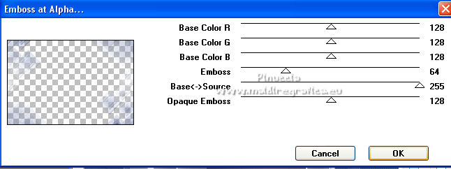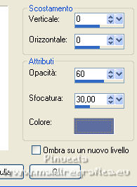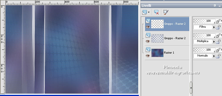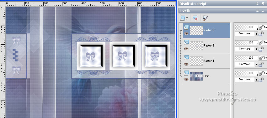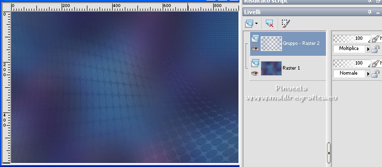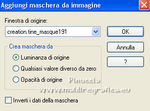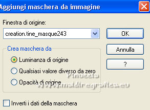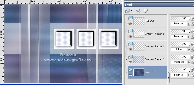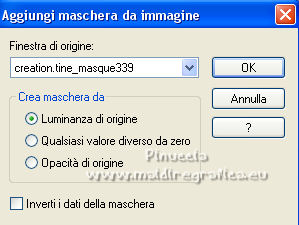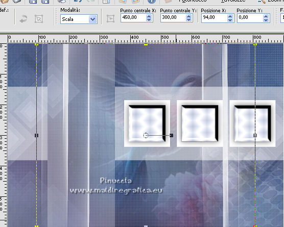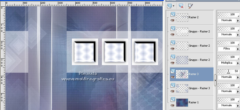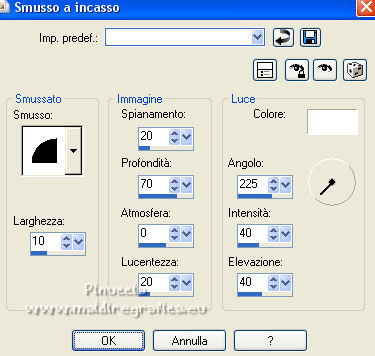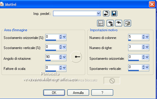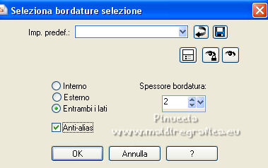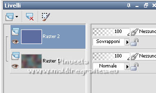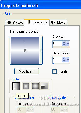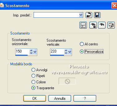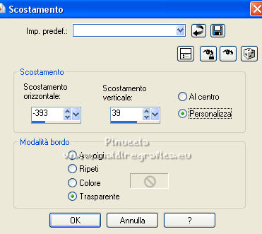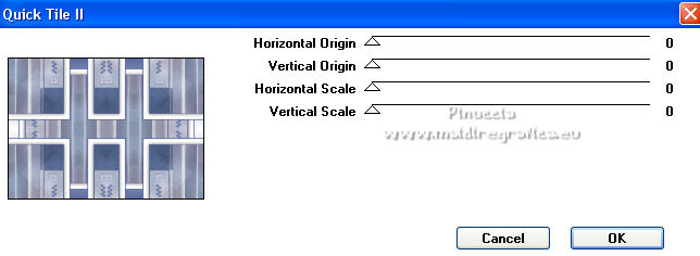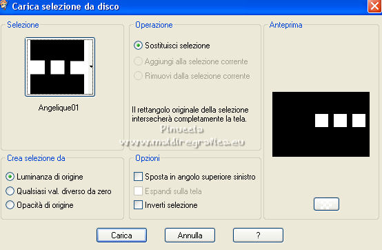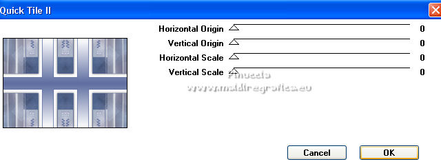 qui puoi trovare qualche risposta ai tuoi dubbi. Se l'argomento che ti interessa non è presente, ti prego di segnalarmelo. Questo tutorial è stato scritto con PSP2020 e tradotto con PSPX7, ma può essere realizzato anche con le altre versioni di PSP. Dalla versione X4, il comando Immagine>Rifletti è stato sostituito con Immagine>Capovolgi in orizzontale, e il comando Immagine>Capovolgi con Immagine>Capovolgi in verticale. Nelle versioni X5 e X6, le funzioni sono state migliorate rendendo disponibile il menu Oggetti. Con la nuova versione X7, sono tornati Rifletti>Capovolgi, ma con nuove varianti. Vedi la scheda sull'argomento qui Occorrente: ![]() Per le maschere grazie Tine. Il resto del materiale è di Laurette. L'autrice prega di non condividere in rete i suoi tubes. (in questa pagina trovi i links ai siti dei creatori di tubes) ![]() in caso di dubbi, ricorda di consultare la mia sezione filtri qui Filters Unlimited 2-0 qui Graphics Plus - Quick Tile 2 qui Mura's Seamless - Emboss at Alpha qui I filtri Graphics Plus e Mura's Seamless si possono usare da soli o importati in Filters Unlimited (come fare vedi qui) Se un filtro fornito appare con questa icona ![]() non esitare a cambiare modalità di miscelatura e opacità secondo i colori utilizzati. Nelle ultime versioni di PSP non c'è il gradiente di primo piano/sfondo (Corel_06_029) Puoi usare i gradienti delle versioni precedenti. Trovi qui i gradienti Corel X. ![]() Metti le selezioni nella cartella Selezioni. Apri le maschere in PSP e minimizzale con il resto del materiale. Scegli due colori dal tube o dal paesaggio. Per l'esempio: Imposta il colore di primo piano con #5d6da0, e il colore di sfondo con #ffffff. ![]() 1. Apri l'immagine di partenza Image de depart ![]() Questa immagine sarà la base del tuo lavoro, e non serve colorizzarla. Livelli>Innalza livello di sfondo. Livelli>Nuovo livello raster, Raster 2. Riempi con il colore di primo piano #5d6da0.Cambia la modalità di miscelatura di questo livello in Sovrapponi. ![]() Livelli>Unisci>Unisci giù. 2. Livelli>Nuovo livello raster, Raster 2. Riempi con il colore di primo piano #5d6da0.Livelli>Nuovo livello maschera>Da immagine. Apri il menu sotto la finestra di origine e vedrai la lista dei files aperti. Seleziona la maschera creation.tine_masque339 ![]() Livelli>Unisci>Unisci gruppo. Immagine>Rifletti. Cambia la modalità di miscelatura di questo livello in Moltiplica. ![]() 3. Livelli>Nuovo livello raster, Raster 2. Riempi con il colore bianco di sfondo.Livelli>Nuovo livello maschera>Da immagine. Apri il menu sotto la finestra di origine e seleziona la maschera creation.tine_masque243 ![]() Effetti>Effetti di bordo>Aumenta. Livelli>Unisci>Unisci gruppo. Cambia la modalità di miscelatura di questo livello in Filtra. ![]() 4. Livelli>Nuovo livello raster, Raster 2. Riempi con il colore bianco.Livelli>Nuovo livello maschera>Da immagine. Apri il menu sotto la finestra di origine e seleziona la maschera creation.tine_masque191 ![]() Regola>Messa a fuoco>Metti a fuoco. Livelli>Unisci>Unisci gruppo. 5. Passa il colore di primo piano a Gradiente di primo piano/sfondo, stile Lineare. ![]() Selezione>Carica/Salva selezione>Carica selezione da disco. Cerca e carica la selezione Angelique01 ![]() Calques nouveau calque raster, Raster 2. Riempi il livello con il gradiente.Effetti>Effetti di riflesso>Motivi. ![]() 6. Effetti>Effetti 3D>Smusso a incasso. ![]() Effetti>Effetti 3D>Sfalsa ombra, colore nero. ![]() Selezione>Deseleziona. 7. Attiva il livello inferiore, Raster 1. ![]() Livelli>Nuovo livello raster, Raster 3. Riempi il livello con il gradiente.Livelli>Nuovo livello maschera>Da immagine. Apri il menu sotto la finestra di origine e seleziona la maschera creation.tine_masque354 ![]() Regola>Messa a fuoco>Accentua messa a fuoco. Livelli>Unisci>Unisci gruppo. Effetti>Plugins>Mura's Seamless - Emboss at Alpha, con i settaggi standard. ![]() Effetti>Effetti 3D>Sfalsa ombra, colore di primo piano. ![]() 8. Rimani posizionato su questo livello Apri il tube Image paysage oiseau ![]() Modifica>Copia. Torna al tuo lavoro e vai a Modifica>Incolla come nuovo livello. Il tube si trova automaticamente al centro dell'immagine. ![]() Abbassa l'opacità di questo livello al 50%. ![]() Livelli>Unisci>Unisci visibile. 9. Apri il tube déco n 1 ![]() Colorizza secondo i tuoi colori. Modifica>Copia. Torna al tuo lavoro e vai a Modifica>Incolla come nuovo livello. Effetti>Effetti di immagine>Scostamento. ![]() 10. Apri il tube déco n 2 ![]() Colorizza secondo i tuoi colori. Modifica>Copia. Torna al tuo lavoro e vai a Modifica>Incolla come nuovo livello. Effetti>Effetti di immagine>Scostamento. ![]() 11. Livelli>Nuovo livello raster, Raster 3 Selezione>Carica/Salva selezione>Carica selezione da disco. Apri il menu delle selezioni e carica la selezione Angelique02 ![]() Selezione>Modifica>Seleziona bordature selezione. ![]() Passa il colore di primo piano a Colore. Riempi la selezione con il colore blu di primo piano.Effetti>Effetti 3D>Sfalsa ombra, colore nero. ![]() Selezione>Deseleziona. Dovresti avere questo ![]() 12. Immagine>Aggiungi bordatura, 2 pixels, simmetriche, colore di primo piano. Selezione>Seleziona tutto. Immagine>Aggiungi bordatura, 30 pixels, simmetriche, colore bianco. Effetti>Effetti 3D>Sfalsa ombra, colore nero. ![]() Selezione>Deseleziona. 13. Immagine>Aggiungi bordatura, 2 pixels, simmetriche, colore di primo piano. Selezione>Seleziona tutto. Immagine>Aggiungi bordatura, 50 pixels, simmetriche, colore bianco. Selezione>Inverti. Passa nuovamente il colore di primo piano a Gradiente. Riempi con il gradiente.Effetti>Plugins>Graphics Plus - Quick Tile II. ![]() Ripeti l'Effetto una seconda volta. ![]() Selezione>Inverti. Effetti>Effetti 3D>Sfalsa ombra, colore nero. ![]() Selezione>Deseleziona. 14. Immagine>Aggiungi bordatura, 2 pixels, simmetriche, colore di primo piano. Selezione>Seleziona tutto. Immagine>Aggiungi bordatura, 50 pixels, simmetriche, colore bianco. Effetti>Ef