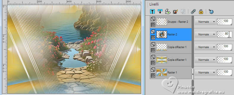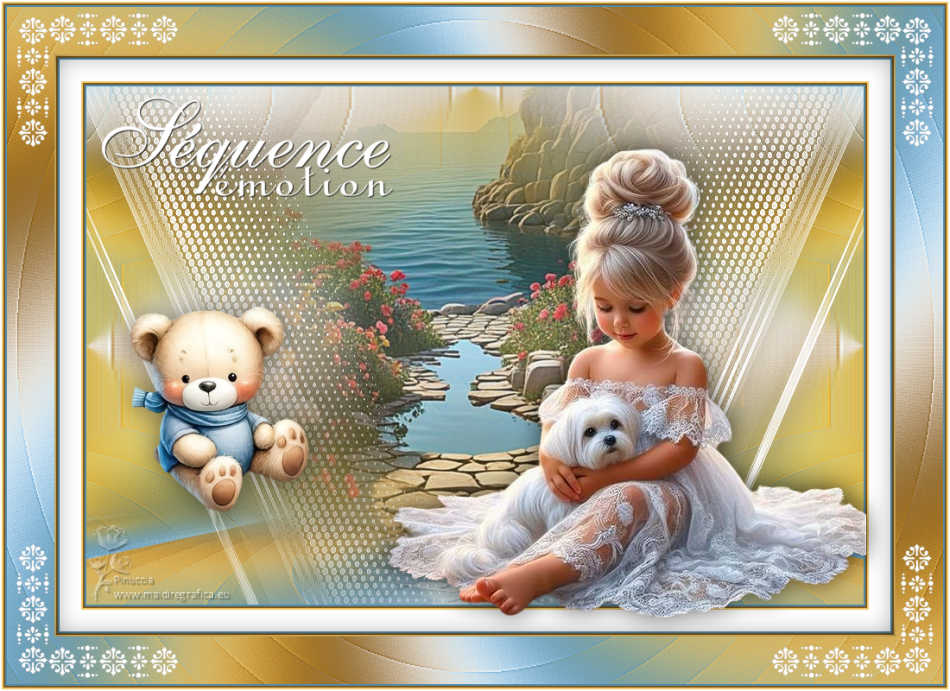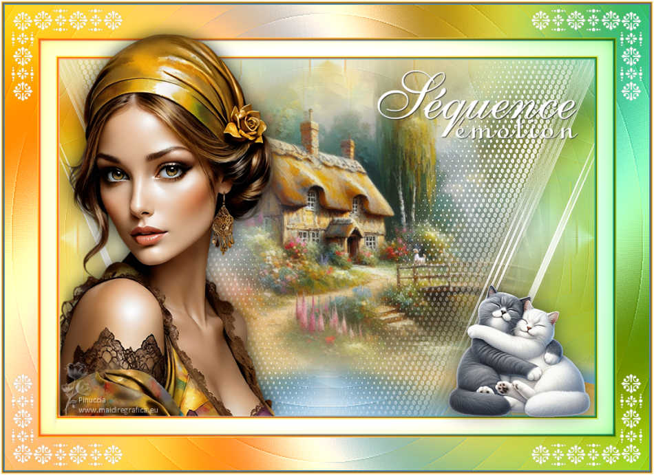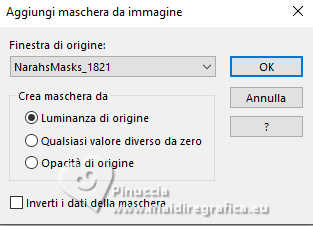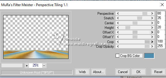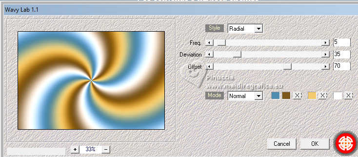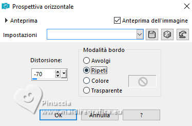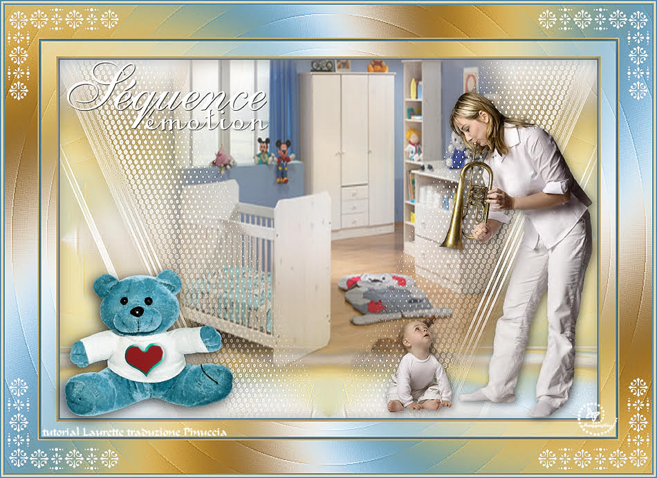 qui puoi trovare qualche risposta ai tuoi dubbi. Se l'argomento che ti interessa non è presente, ti prego di segnalarmelo. Questo tutorial è stato scritto con PSP2020 e tradotto con PSPX9, ma può essere realizzato anche con le altre versioni di PSP. Dalla versione X4, il comando Immagine>Rifletti è stato sostituito con Immagine>Capovolgi in orizzontale, e il comando Immagine>Capovolgi con Immagine>Capovolgi in verticale. Nelle versioni X5 e X6, le funzioni sono state migliorate rendendo disponibile il menu Oggetti. Con la nuova versione X7, sono tornati Rifletti>Capovolgi, ma con nuove varianti. Vedi la scheda sull'argomento qui Occorrente: ![]() Per la maschera grazie Narah. Il resto del materiale è di Laurette. L'autrice prega di non condividere in rete i suoi tubes. (in questa pagina trovi i links ai siti dei creatori di tubes) ![]() in caso di dubbi, ricorda di consultare la mia sezione filtri qui Filters Unlimited 2.0 qui Mehdi - Wavy Lab 1.1. qui Filter Factory Gallery C - Evanescence qui Mura's Meister - Perspective Tiling qui Simple - Top Left Mirror qui I filtri Factory Gallery e Simple si possono usare da soli o importati in Filters Unlimited (come fare vedi qui) Se un filtro fornito appare con questa icona ![]() non esitare a cambiare modalità di miscelatura e opacità secondo i colori utilizzati. ![]() Apri la maschera in PSP e minimizzala con il resto del materiale 1. Apri una nuova immagine trasparente 900 x 600 pixels. ![]() 2. Imposta il colore di primo piano con 7e571a, e il colore di sfondo con #508cae. ![]() 3. Effetti>Plugins>Mehdi - Wavy Lab 1.1. Questo filtro crea gradienti con i colori della paletta. Il primo è il colore di sfondo, il secondo quello di primo piano. Cambia gli ultimi due colori creati dal filtro: il terzo con #f1ca6e, e il quarto con il colore bianco #ffffff. ![]() Regola>Sfocatura>Sfocatura gaussiana - raggio 30 ![]() 4. Effetti>Plugins>Filters Unlimited 2.0 - Filter Factory Gallery C - Evanescence, con i settaggi standard. ![]() Effetti>Effetti di bordo>Aumenta di più. Livelli>Duplica. 5. Effetti>Effetti geometrici>Prospettiva orizzontale. ![]() Effetti>Effetti di riflesso>Specchio rotante, con i settaggi standard. ![]() 6. Livelli>Duplica. Immagine>Capovolgi. Cambia la modalità di miscelatura di questo livello in Luce netta, e abbassa l'opacità al 50%. Livelli>Unisci>Unisci giù. Effetti>Effetti di immagine>Motivo unico, con i settaggi standard. ![]() 7. Imposta il colore di primo piano con il colore bianco #ffffff. Livelli>Nuovo livello raster. Riempi il livello con il colore bianco.Livelli>Nuovo livello maschera>Da immagine. Apri il menu sotto la finestra di origine e vedrai la lista dei files aperti. Seleziona la maschera NarahsMasks_1821 ![]() Effetti>Effetti di bordo>Aumenta. Livelli>Unisci>Unisci gruppo. Effetti>Effetti 3D>Sfalsa ombra, colore di primo piano. ![]() 8. Attiva il livello inferiore. Livelli>Duplica. Livelli>Disponi>Sposta su (è il terzo livello dal basso). Effetti>Plugins>Mura's Meister - Perspective Tiling. ![]() Effetti>Effetti di riflesso>Specchio rotante, con i settaggi standard. ![]() Attiva lo strumento Bacchetta magica , sfumatura 60,![]() e clicca nello spazio trasparente per selezionarlo. Premi 7-8 volte sulla tastiera il tasto CANC ![]() Non dimenticare di riportare la sfumatura a 0. Effetti>Effetti 3D>Sfalsa ombra, colore di primo piano. ![]() 9. Apri il tube paysage ![]() Modifica>Copia. Torna al tuo lavoro e vai a Modifica>Incolla come nuovo livello. Abbassa l'opacità di questo livello all'80%. Effetti>Effetti 3D>Sfalsa ombra, colore di primo piano. ![]() La tag e i livelli ![]() 10. Attiva il livello di sfondo, Raster 1. Modifica>Copia Per precauzione Modifica>Incolla come nuova immagine, e minimizza questa immagine. 11. Torna al tuo lavoro. Per i bordi imposta nuovamente il colore di primo piano con #508cae. ![]() Immagine>Aggiungi bordatura, 2 pixels, simmetriche, colore di sfondo .Immagine>Aggiungi bordatura, 2 pixels, simmetriche, colore di primo piano .Immagine>Aggiungi bordatura, 2 pixels, simmetriche, colore 3 #f1ca6e ![]() Immagine>Aggiungi bordatura, 25 pixels, simmetriche, colore bianco #ffffff. 12. Immagine>Aggiungi bordatura, 2 pixels, simmetriche, colore di sfondo .Immagine>Aggiungi bordatura, 2 pixels, simmetriche, colore di primo piano .Immagine>Aggiungi bordatura, 2 pixels, simmetriche, colore 3 #f1ca6e ![]() 13. Immagine>Aggiungi bordatura, 55 pixels, simmertriche, colore bianco. Attiva lo strumento Bacchetta magica , sfumatura e tolleranza 0![]() Clicca nel bordo da 25 pixels per selezionarlo. Modifica>Incolla nella selezione (l'immagine minimizzata è ancora in memoria). Effetti>Effetti 3D>Sfalsa ombra, colore nero. ![]() 14. Apri il tube IA-tube-enfant-laurette ![]() Modifica>Copia. Torna al tuo lavoro e vai a Modifica>Incolla come nuovo livello. Sposta il tube a destra.Effetti>Effetti 3D>Sfalsa ombra, a scelta o con i seguenti settaggi, colore nero ![]() Regola>Messa a fuoco>Metti a fuoco. 15. Apri il tube nounours-laurette ![]() Modifica>Copia. Torna al tuo lavoro e vai a Modifica>Incolla come nuovo livello. Sposta il tube a tuo piacimento.Effetti>Effetti 3D>Sfalsa mobra, colore nero. ![]() 16. Apri il tube word sequence émotion ![]() Modifica>Copia. Torna al tuo lavoro e vai a Modifica>Incolla come nuovo livello. Sposta il tube dove preferisci.Effetti>Effetti 3D>Sfalsa ombra, colore nero. ![]() 17. Apri il tube coin cadre-laurette ![]() Modifica>Copia. Torna al tuo lavoro e vai a Modifica>Incolla come nuovo livello. Colorizza secondo i tuoi colori. Strumento Puntatore (K) ![]() Posizione X: 10,00 - Posizione Y: 6,00. ![]() Livelli>Duplica. Livelli>Unisci>Unisci giù. Effetti>Plugins>Simple - Top Left Mirror. ![]() Effetti>Effetti 3D>Sfalsa ombra, colore nero. ![]() 17. Immagine>Aggiungi bordatura, 2 pixels, simmetriche, colore di sfondo ![]() Immagine>Aggiungi bordatura, 2 pixels, simmetriche, colore di primo piano ![]() Immagine>Aggiungi bordatura, 2 pixels, simmetriche, color