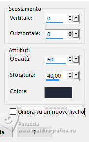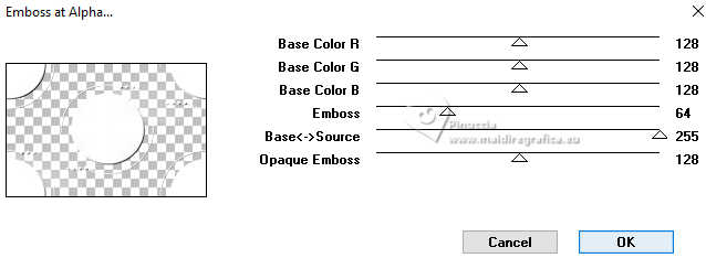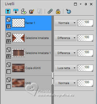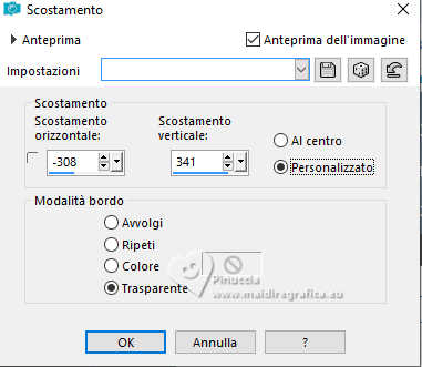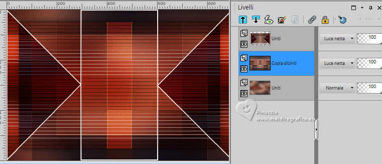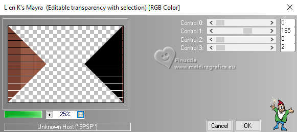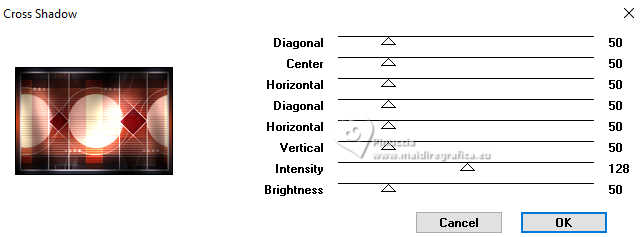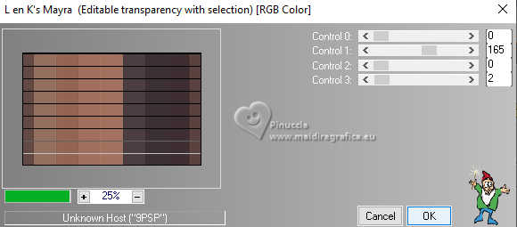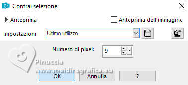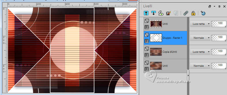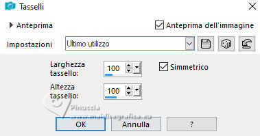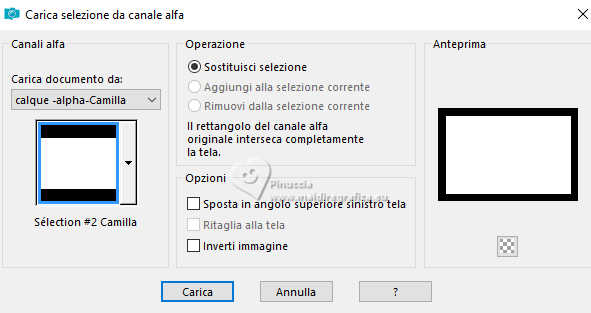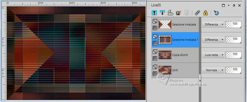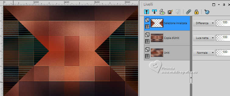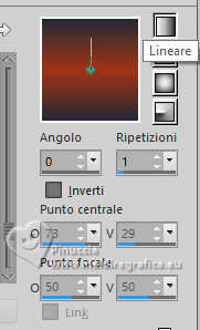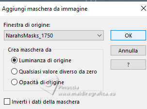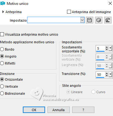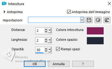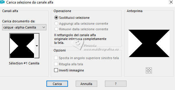 qui puoi trovare qualche risposta ai tuoi dubbi. Se l'argomento che ti interessa non è presente, ti prego di segnalarmelo. Questo tutorial è stato scritto con PSP2020 e tradotto con PSPX9, ma può essere realizzato anche con le altre versioni di PSP. Dalla versione X4, il comando Immagine>Rifletti è stato sostituito con Immagine>Capovolgi in orizzontale, e il comando Immagine>Capovolgi con Immagine>Capovolgi in verticale. Nelle versioni X5 e X6, le funzioni sono state migliorate rendendo disponibile il menu Oggetti. Con la nuova versione X7, sono tornati Rifletti>Capovolgi, ma con nuove varianti. Vedi la scheda sull'argomento qui Occorrente: ![]() Per la maschera grazie Narah. Il resto del materiale è di Laurette. L'autrice prega di non condividere in rete i suoi tubes. (in questa pagina trovi i links ai siti dei creatori di tubes) ![]() in caso di dubbi, ricorda di consultare la mia sezione filtri qui Filters Unlimited 2.0 qui L&K's - L&K's Mayra qui Mura's Seamless - Emboss at Alpha qui Graphics Plus - Cross shadow qui I filtri Mura's Seamless e Graphics Plus si possono usare da soli o importati in Filters Unlimited (come fare vedi qui) Se un filtro fornito appare con questa icona ![]() non esitare a cambiare modalità di miscelatura e opacità secondo i colori utilizzati. Nelle ultime versioni di PSP non c'è il gradiente di primo piano/sfondo (Corel_06_029) Puoi usare i gradienti delle versioni precedenti. Trovi qui i gradienti Corel X. ![]() Apri la maschera in PSP e minimizzala con il resto del materiale 1. Imposta il colore di primo piano con #252a37, e il colore di sfondo con #a03515. ![]() Passa il colore di primo piano a Gradiente di primo piano/sfondo, stile Lineare. ![]() 1. Apri Calque-Alpha-Camilla. Questa immagine, che sarà la base del tuo lavoro, non é vuota, ma contiene le selezioni salvate sul canale alfa. se hai problemi con il canale alfa, apri una nuova immagine trasparente 900 x 600 pixels e usa le selezioni da disco. 2. Riempi l'immagine trasparente con il gradiente.Livelli>Nuovo livello raster, Raster 2. Selezione>Seleziona tutto. Apri il tube principale IA-26-laurette ![]() Modifica>Copia. Torna al tuo lavoro e vai a Modifica>Incolla nella selezione. Selezione>Deseleziona. Effetti>Effetti di immagine>Motivo unico, con i settaggi standard. ![]() Regola>Sfocatura>Sfocatura gaussiana - raggio 50. ![]() 3. Regola>Aggiungi/Rimuovi disturbo>Aggiungi disturbo. ![]() Effetti>Effetti 3D>Sfalsa ombra, colore di primo piano. ![]() Livelli>Unisci>Unisci visibile. 4. Livelli>Duplica. Effetti>Effetti di distorsione>Tasselli. ![]() Effetti>Effetti di bordo>Aumenta di più. Effetti>Effetti di riflesso>Specchio rotante, con i settaggi standard. ![]() Cambia la modalità di miscelatura di questo livello in Luce netta. 5. Rimani su questo livello (Copia di uniti). Selezione>Carica/Salva selezione>Carica selezione da canale alfa. La selezione Sélection #1 è subito disponibile. Devi soltanto cliccare Carica. ![]() Selezione>Innalza selezione a livello. 6. Effetti>Plugins>L&K's - L&K's Mayra ![]() Selezione>Deseleziona. Livelli>Duplica. Immagine>Rifletti>Rifletti orizzontalmente. Abbassa l'opacità di questo livello al 50%. Livelli>Unisci>Unisci giù. Cambia la modalità di miscelatura di questo livello in Differenza. ![]() 7. Rimani su questo livello, Copia di Uniti. Selezione>Carica/Salva selezione>Carica selezione da canale alfa. Apri il menu delle selezioni e carica la sezione Sélection #2. ![]() Selezione>Innalza selezione a livello. Effetti>Plugins>L&K's - L&K's Mayra, con i settaggi precedenti ![]() Selezione>Deseleziona. Livelli>Duplica. Immagine>Rifletti>Rifletti orizzontalmente. Abbassa l'opacità di questo livello al 50%. Livelli>Unisci>Unisci giù. Effetti>Effetti 3D>Sfalsa ombra, con i settaggi precedenti. Cambia la modalità di miscelatura di questo livello in Differenza. ![]() 8. Attiva il livello superiore. Apri il tube déco 1 ![]() Modifica>Copia. Torna al tuo lavoro e vai a Modifica>Incolla come nuovo livello. Non spostarlo. E' al suo posto. Chiudi i due livelli inferiori. ![]() Livelli>Unisci>Unisci visibile. Livelli>Visualizza>Tutto. 9. Cambia la modalità del livello superiore in Luce netta, e attiva il livello sottostante, Copia di Uniti. ![]() Imposta il colore di sfondo con il colore bianco. Livelli>Nuovo livello raster. Riempi il livello con il colore bianco.Livelli>Nuovo livello maschera>Da immagine. Apri il menu sotto la finestra di origine e vedrai la lista dei files aperti. Seleziona la maschera NarahsMasks_1750 ![]() Livelli>Unisci>Unisci gruppo. 10. Effetti>Effetti di immagine>Motivo unico, con i settaggi standard. ![]() 11. Effetti>Plugins>Mura's Seamless - Emboss at Alpha, con i settaggi standard. ![]() La tag e i livelli ![]() Regola>Messa a fuoco>Metti a fuoco. Livelli>Unisci>Unisci visibile. 11. Effetti>Effetti di immagine>Motivo unico. ![]() Selezione>Seleziona tutto. Selezione>Modifica>Contrai - 9 pixels. ![]() Selezione>Inverti. Premi sulla tastiera il tasto CANC ![]() Riempi la selezione con il colore bianco.Effetti>Effetti di trama>Intessitura colore intessitura: colore di sfondo, colore spazio: colore di primo piano. ![]() 12. Selezione>Seleziona tutto. Immagine>Aggiungi bordatura, 20 pixels, simmetriche, con un colore qualsiasi. Imposta nuovamente il colore di sfondo con #a03515. ![]() Riempi la selezione con il gradiente.Effetti>Plugins>Graphics Plus - Cross Shadow - Brightness 50 ![]() Ripeti l'Effetto una seconda volta. Selezione>Deseleziona. 13. Selezione>Seleziona tutto. Immagine>Aggiungi bordatura, 50 pixels, simmetriche, colore bianco. Effetti>Effetti 3D>Sfalsa ombra, colore di primo piano. ![]() Selezione>Deseleziona. 14. Attiva nuovamente il tube della donna e vai a Modifica>Copia. Torna al tuo lavoro e vai a Modifica>Incolla come nuovo livello. Immagine>Ridimensiona, al 95%, tutti i livelli non selezionato. Sposta il tube in basso a destra.Effetti>Effetti 3D>Sfalsa ombra, colore di primo piano. ![]() 15. Apri il tube déco