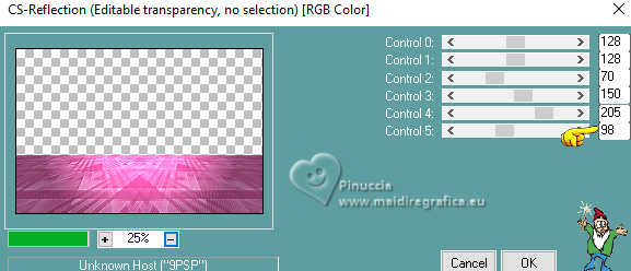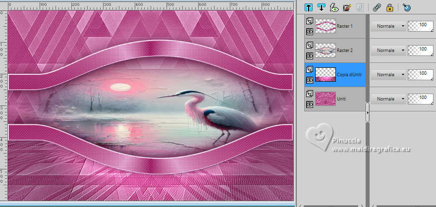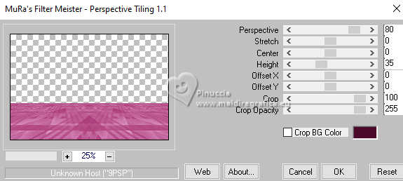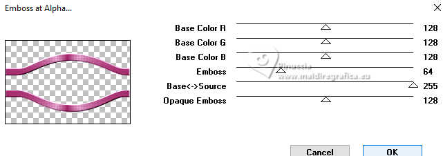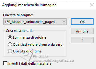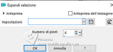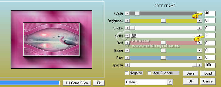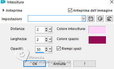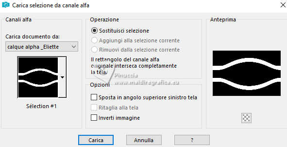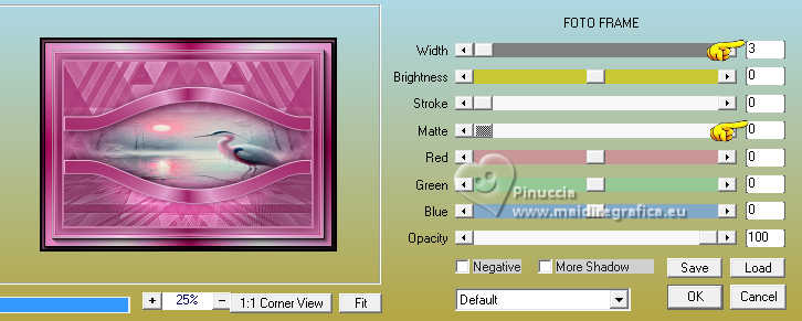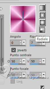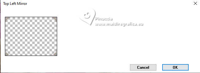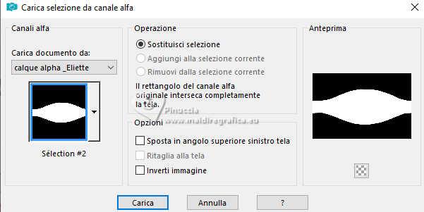 qui puoi trovare qualche risposta ai tuoi dubbi. Se l'argomento che ti interessa non è presente, ti prego di segnalarmelo. Questo tutorial è stato scritto con PSP2020 e tradotto con PSPX9, ma può essere realizzato anche con le altre versioni di PSP. Dalla versione X4, il comando Immagine>Rifletti è stato sostituito con Immagine>Capovolgi in orizzontale, e il comando Immagine>Capovolgi con Immagine>Capovolgi in verticale. Nelle versioni X5 e X6, le funzioni sono state migliorate rendendo disponibile il menu Oggetti. Con la nuova versione X7, sono tornati Rifletti>Capovolgi, ma con nuove varianti. Vedi la scheda sull'argomento qui Occorrente: ![]() Per la maschera grazie Animabelle. Il resto del materiale è di Laurette. L'autrice prega di non condividere in rete i suoi tubes. (in questa pagina trovi i links ai siti dei creatori di tubes) ![]() in caso di dubbi, ricorda di consultare la mia sezione filtri qui Filters Unlimited 2.0 qui Mura's Seamless - Emboss at Alpha qui Carolaine and Sensibility - CS Reflection qui Mura's Meister - Perspective Tiling qui AAA Frames - Foto Frame qui Simple - Top Left Mirror qui I filtri Mura's Seamless e Simple si possono usare da soli o importati in Filters Unlimited (come fare vedi qui) Se un filtro fornito appare con questa icona ![]() non esitare a cambiare modalità di miscelatura e opacità secondo i colori utilizzati. Nelle ultime versioni di PSP non c'è il gradiente di primo piano/sfondo (Corel_06_029) Puoi usare i gradienti delle versioni precedenti. Trovi qui i gradienti Corel X. ![]() Metti il preset Emboss 3 nella cartella Impostazioni predefinite. Apri la maschera in PSP e minimizzala con il resto del materiale. Colori ![]() Imposta il colore di primo piano con #fed2f6, e il colore di sfondo con #94f054. ![]() colore 3 #4b092b 1. Apri calque alfa Eliette. Finestra>Duplica o sulla tastiera maiuscola+D per fare una copia. ![]() Chiudi l'originale. La copia, che sarà la base del tuo lavoro, non è vuota, ma contiene le selezioni salvate sul canale alfa. Riempi l'immagine trasparente con il colore di sfondo.Effetti>Effetti di trama>Intessitura colore intessitura: colore di primo piano colore spazio: colore di sfondo ![]() 2. Livelli>Nuovo livello raster. Riempi il livello con il colore chiaro di primo piano.Livelli>Nuovo livello maschera>Da immagine. Apri il menu sotto la finestra di origine e vedrai la lista dei files aperti. Seleziona la maschera 150_Masque_Animabelle_page4 ![]() Effetti>Effetti di bordo>Aumenta di più. Livelli>Unisci>Unisci gruppo. Effetti>Effetti 3D>Sfalsa ombra, colore di sfondo. ![]() 3. Livelli>Duplica. Immagine>Rifletti>Rifletti orizzontalmente. Abbassa l'opacità di questo livello al 50%. Livelli>Unisci>Unisci giù. Effetti>Effetti di immagine>Motivo unico, con i settaggi standard. ![]() Effetti>Effetti di riflesso>Specchio rotante. ![]() Livelli>Unisci>Unisci visibile. 4. Selezione>Carica/Salva selezione>Carica selezione da canale alfa. La selezione Selection #1 è subito disponibile. Devi soltanto cliccare Carica. ![]() Livelli>Nuovo livello raster. Riempi la selezione con il colore di primo piano.Selezione>Modifica>Contrai - 3 pixels. ![]() Mantieni selezionato. 5. Passa il colore di primo piano a Gradiente di primo piano/sfondo, stile Radiale. ![]() Riempi la selezione con il gradiente.Effetti>Effetti di trama>Intessitura, con i settaggi precedenti. ![]() Selezione>Deseleziona. Effetti>Plugins>Mura's Seamless - Emboss at Alpha, con i settaggi standard. ![]() Effetti>Effetti 3D>Sfalsa ombra, colore 3 #4b092b. ![]() 6. Attiva il livello inferiore. Livelli>Nuovo livello raster, Raster 2. Selezione>Carica/Salva selezione>Carica selezione da canale alfa. Apri il menu delle selezioni e carica la selezione Selection 2 ![]() Selezione>Modifica>Espandi - 6 pixels. ![]() Apri il tube del paesaggio paysage_Eliette ![]() Cancella il watermark e vai a Modifica>Copia. Torna al tuo lavoro e vai a Modifica>Incolla nella selezione. Livelli>Duplica. Livelli>Unisci>Unisci giù. Selezione>Inverti. Effetti>Effetti 3D>Sfalsa ombra, colore 3 #4b092b. ![]() Modifica>Ripeti Sfalsa ombra. Selezione>Deseleziona. 7. Attiva il livello inferiore, Uniti. Livelli>Duplica. Effetti>Plugins>Mura's Meister - Perspective Tiling. ![]() Effetti>Filtro definito dall'utente - seleziona il preset Emboss 3 e ok. ![]() 8. Effetti>Plugins>Carolaine and Sensibility - CS Reflection ![]() La tag e i livelli prima di unire. ![]() Livelli>Unisci>Unisci visibile. 8. Immagine>Aggiungi bordatura, 2 pixels, simmetriche, colore chiaro di primo piano. Immagine>Aggiungi bordatura, 3 pixels, simmetriche, colore scuro di sfondo. Immagine>Aggiungi bordatura, 2 pixels, simmetriche, colore chiaro di primo piano. Selezione>Seleziona tutto. Immagine>Aggiungi bordatura, 20 pixels, simmetriche, colore scuro di sfondo. Selezione>Inverti. Riempi la selezione con il gradiente radiale.Effetti>Effetti di trama>Intessitura, con i settaggi precedenti. Di nuovo Selezione>Inverti. Effetti>Effetti 3D>Sfalsa ombra, con i settaggi precedenti. ![]() Selezione>Deseleziona. 9. Immagine>Aggiungi bordatura, 2 pixels, simmetriche, colore chiaro di primo piano. Immagine>Aggiungi bordatura, 3 pixels, simmetriche, colore scuro di sfondo. Immagine>Aggiungi bordatura, 2 pixels, simmetriche, colore chiaro di primo piano. Selezione>Seleziona tutto. Immagine>Aggiungi bordatura, 50 pixels, simmetriche, colore bianco. Selezione>Inverti. Riempi la selezione con il gradiente radiale.Effetti>Plugins>AAA Frames - Foto Frame - width 40, matte 2 ![]() Ripeti Foto Frame width 3, matte 0. ![]() Selezione>Deseleziona. 10. Immagine>Aggiungi bordatura, 2 pixels, simmetriche, colore chiaro di primo piano. Immagine>Aggiungi bordatura, 3 pixels, simmetriche, colore scuro di sfondo. Immagine>Aggiungi bordatura, 2 pixels, simmetriche, colore chiaro di primo piano. Selezione>Seleziona tutto. Immagine>Aggiungi bordatura, 50 pixels, simmetriche, colore bianco. Selezione>Inverti. Riempi la selezione con il gradiente radia