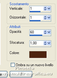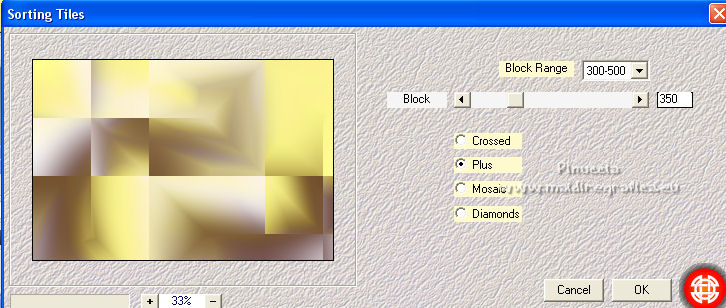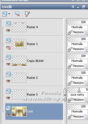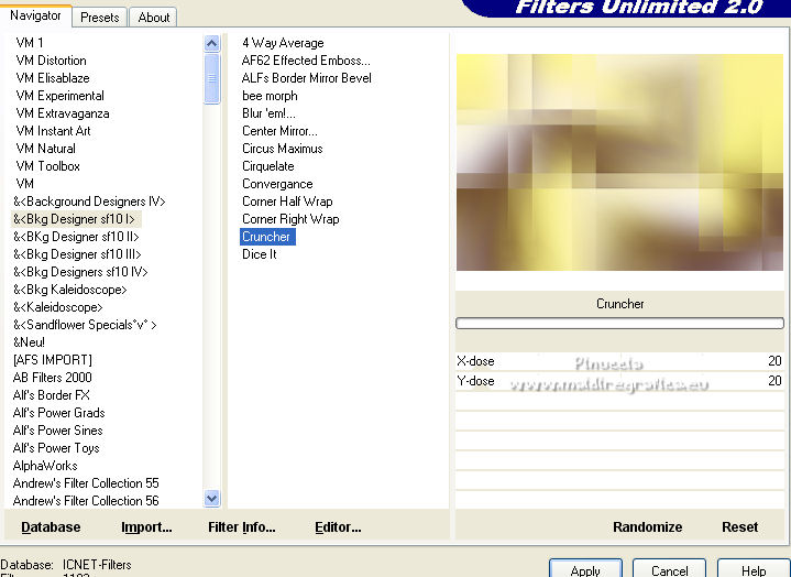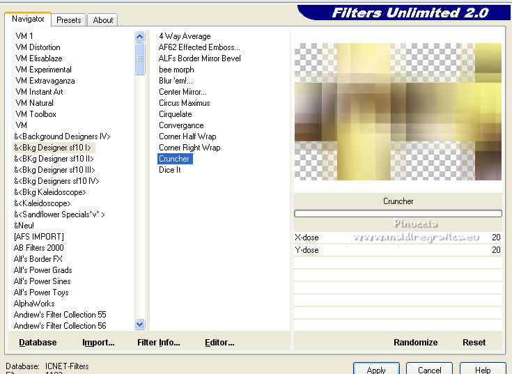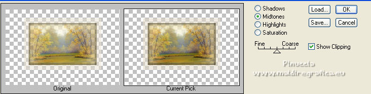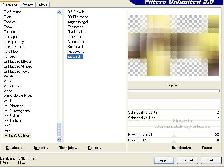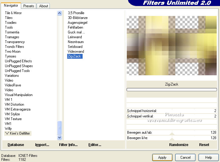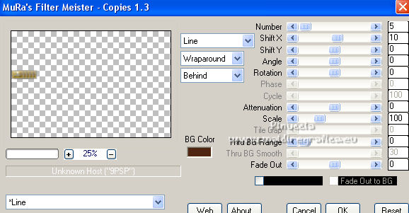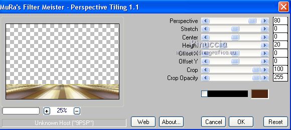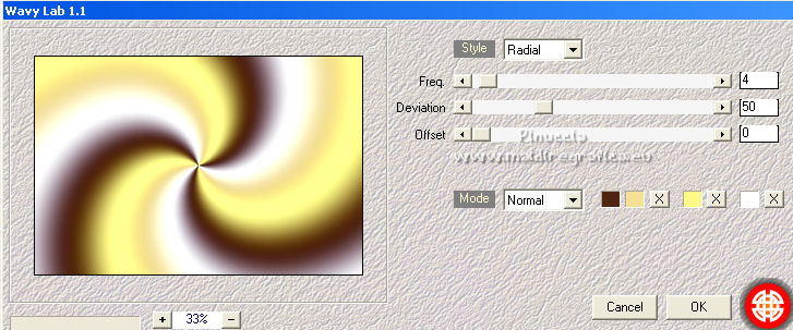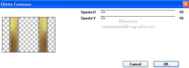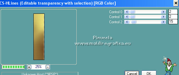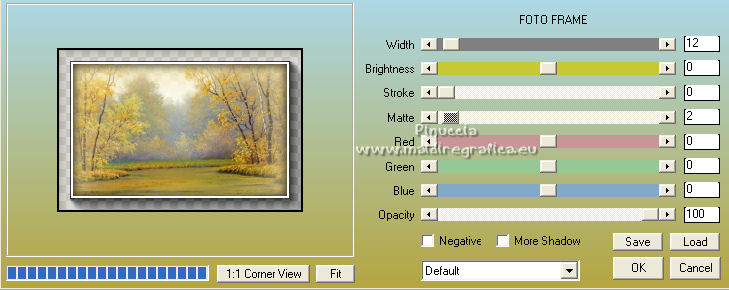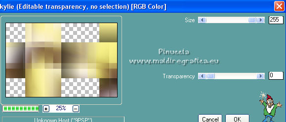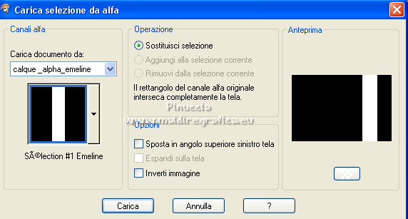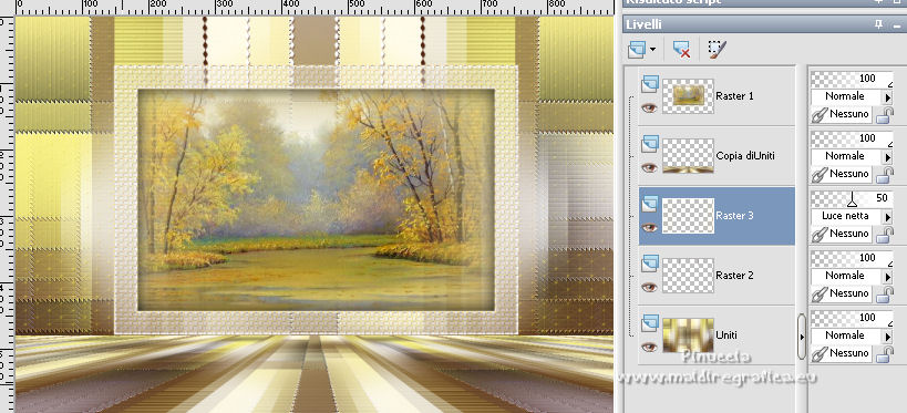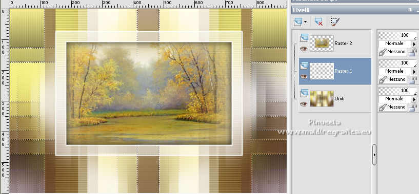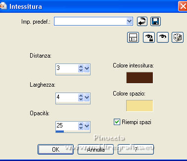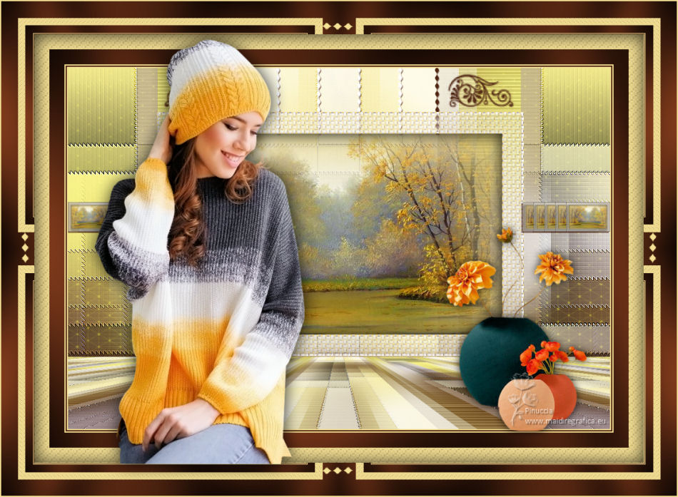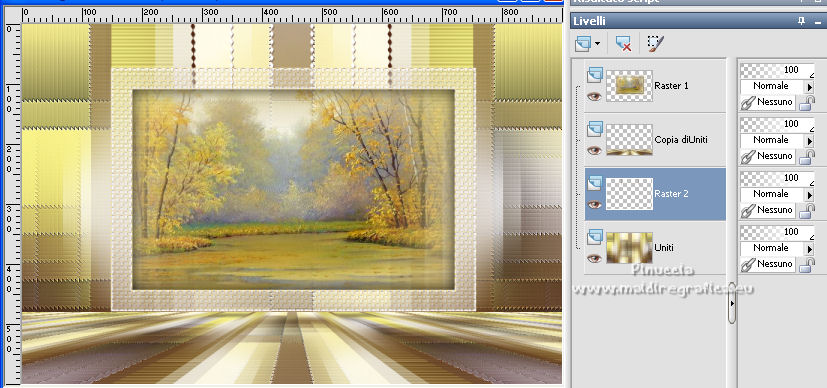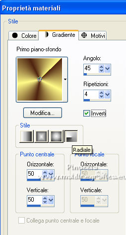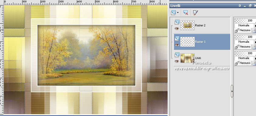 qui puoi trovare qualche risposta ai tuoi dubbi. Se l'argomento che ti interessa non è presente, ti prego di segnalarmelo. Questo tutorial è stato scritto con PSP2020 e tradotto con CorelX, ma può essere realizzato anche con le altre versioni di PSP. Dalla versione X4, il comando Immagine>Rifletti è stato sostituito con Immagine>Capovolgi in orizzontale, e il comando Immagine>Capovolgi con Immagine>Capovolgi in verticale. Nelle versioni X5 e X6, le funzioni sono state migliorate rendendo disponibile il menu Oggetti. Con la nuova versione X7, sono tornati Rifletti>Capovolgi, ma con nuove varianti. Vedi la scheda sull'argomento qui Occorrente: Materiale qui Il tube è di Laurette (l'autrice prega di non condividere in rete i suoi tubes). (in questa pagina trovi i links ai siti dei creatori di tubes) Filtri in caso di dubbi, ricorda di consultare la mia sezione filtri qui Filters Unlimited 2.0 qui Mehdi - Wavy Lab 1.1. qui Mehdi - Sorting Tiles qui &<Bkg Designer sf10I> - Cruncher (da importer in Unlimited) qui Photoshopfun II - Kylie qui Kiwi - Zig-Zack qui Carolaine and Sensibility - CS-HLines qui Italian Editors Effect - Effetto Fantasma qui Penta.com - VTR2 qui Graphics Plus - Cross Shadow, Quick Tile I qui Mura's Meister - Perspective Tiling qui Mura's Meister - Copies qui AAA Frames - Foto Frame qui I filtri Italian Editors, Penta.com, Kiwi e Graphics Plus si possono usare da soli o importati in Filters Unlimited (come fare vedi qui) Se un filtro fornito appare con questa icona ![]() non esitare a cambiare modalità di miscelatura e opacità secondo i colori utilizzati. Apri la maschera in PSP e minimizzala con il resto del materiale. Imposta il colore di primo piano con #f4e195, e il colore di sfondo con #4f2411. ![]() 1. Apri Alpha_emeline. Finestra>Duplica o sulla tastiera maiuscola+D per fare una copia. ![]() Chiudi l'originale. La copia, che sarà la base del tuo lavoro, non è vuota, ma contiene una selezione salvata sul canale alfa. Effetti>Plugins>Mehdi - Wavy Lab 1.1. Questo filtro crea gradienti con i colori della paletta: il primo è il colore di sfondo #4f2411, il secondo quello di primo piano #f4e195. Cambia gli ultimi due colori creati dal filtro: il terzo con il colore #fffa87 e il quarto con il colore bianco. ![]() Regola>Sfocatura>Sfocatura gaussiana - raggio 50. ![]() 2. Effetti>Plugins>Mehdi - Sorting Tiles. ![]() Effetti>Effetti di bordo>Aumenta. 3. Effetti>Plugins>Filters Unlimited 2.0 - &<Bkg Designer sf10I> - Cruncher, con i settaggi standard. ![]() Livelli>Duplica. 4. Effetti>Plugins>Photoshopfun II - Kylie. ![]() 5. Effetti>Plugins>Filters Unlimited 2.0 - &<Bkg Designer sf10I> - Cruncher, con i settaggi precedenti. ![]() Effetti>Plugins>Kiwi's Oelfilter - Zig-Zack, con i settaggi standard. ![]() alcuni effetti importati in Unlimited danno risultati differenti a seconda della versione di Unlimited utilizzata; in questo tutorial l'autrice ha usato la versione software; se stai usando la versione di Unlimited che non si installa, perchè composta da files in formato 8bf, avrai un risultato differente ![]() Effetti>Effetti di bordo>Aumenta di più. Livelli>Duplica. Immagine>Rifletti. Livelli>Unisci>Unisci giù. 6. Livelli>Nuovo livello raster, Raster 2. Selezione>Carica/Salva selezione>Carica selezione da canale alfa. La selezione #1 è subito disponibile. Devi soltanto cliccare Carica. ![]() Imposta il colore di primo piano con il colore #fffa87. ![]() Passa il colore di primo piano a Gradiente di primo piano/sfondo, stile Radiale. ![]() Riempi la selezione con il gradiente.Regola>Sfocatura>Sfocatura gaussiana, con i settaggi precedenti. ![]() 7. Effetti>Plugins>Carolaine and Sensibility - CS-HLines. ![]() Effetti>Effetti di bordo>Aumenta. Selezione>Deseleziona. 8. Effetti>Effetti di riflesso>Specchio rotante, con i settaggi standard. ![]() Effetti>Plugins>Italian Editor Effect - Effetto Fantasma. ![]() Livelli>Unisci>Unisci visibile. 9. Apri il tube déco 1 e vai a Modifica>Copia. Torna al tuo lavoro e vai a Modifica>Incolla come nuovo livello. Non spostarlo. Cambia la modalità di miscelatura di questo livello in Filtra. Effetti>Effetti di immagine>Motivo unico, con i settaggi standard. ![]() Livelli>Unisci>Unisci visibile. 10. Apri il tube Grand_cadre. Lascialo in bianco o metti il colore scelto in primo piano e utilizza lo strumento Cambia colore ![]() Modifica>Copia. Torna al tuo lavoro e vai a Modifica>Incolla come nuovo livello. Tasto K sulla tastiera per attivare lo strumento Puntatore ![]() e imposta Posizione X: 148,00 e Posizione Y: 73,00. ![]() Tasto M per deselezionare lo strumento. Attiva lo strumento Bacchetta magica ![]() ![]() Clicca al centro del quadro per selezionarlo. Riporta il colore di primo piano al colore iniziale #f4e195. ![]() Abbassa l'opacità dello strumento Riempimento al 50%. Livelli>Nuovo livello raster, Raster 2. Riempi la selezione con il colore di primo pianoRiporta l'opacità dello strumento Riempimento a 100. Mantieni selezionato. 10. Apri il tube paysage e vai a Modifica>Copia. Torna al tuo lavoro e vai a Modifica>Incolla come nuovo livello. Posiziona correttamente il tube sulla selezione.Selezione>Inverti. Premi sulla tastiera il tasto CANC ![]() Selezione>Inverti. Livelli>Nuovo livello raster. Effetti>Effetti 3D>Ritaglio. ![]() Selezione>Deseleziona. 11. Livelli>Unisci>Unisci giù - 2 volte. Attiva il livello Raster 1. ![]() questa la mia paletta usando la versione di Unlimited che non si installa ![]() Effetti>Effetti di trama>Intessitura colore intessitura: colore di sfondo #4f2411 colore spazio: colore di primo piano #f4e195. ![]() Modifica>Ripeti Intessitura. Attiva il livello superiore. Livelli>Unisci>Unisci giù. 12. Attiva il livello inferiore, Uniti. Livelli>Duplica. Effetti>Plugins>Mura's Meister - Perspective Tiling. ![]() la schermata del filtro se usi la versione di Unlimited che non si installa ![]() Effetti>Effetti 3D>Sfalsa ombra, colore di sfondo #4f2411. ![]() 13. Attiva il livello inferiore. Apri il 