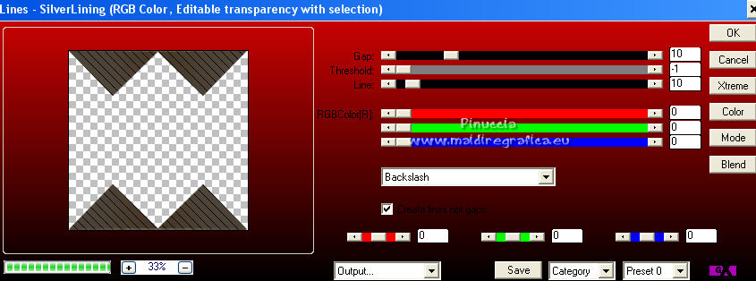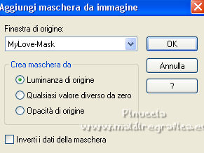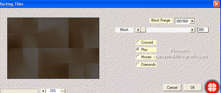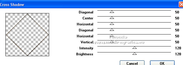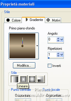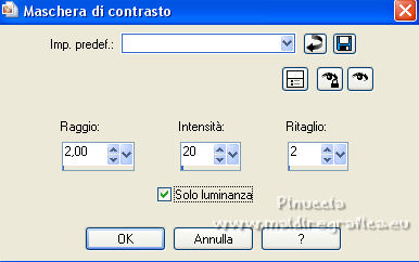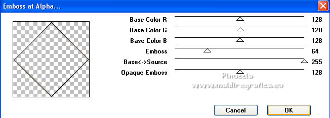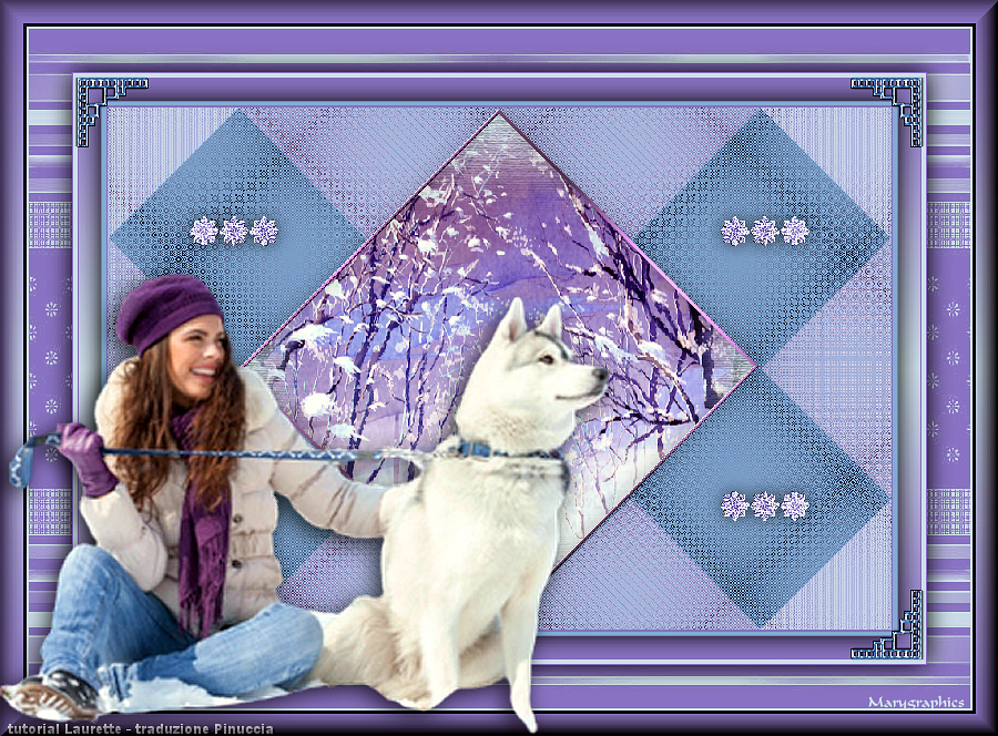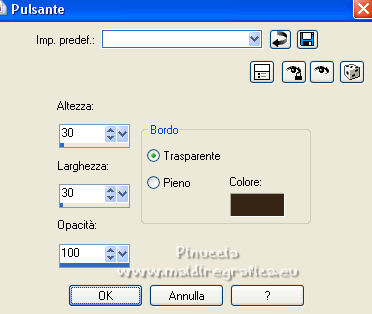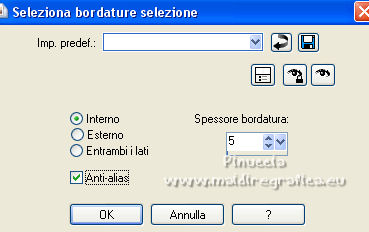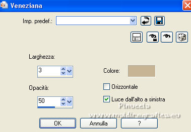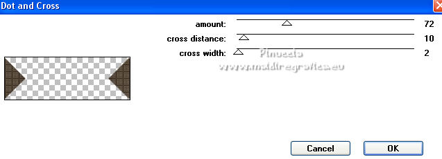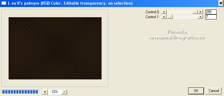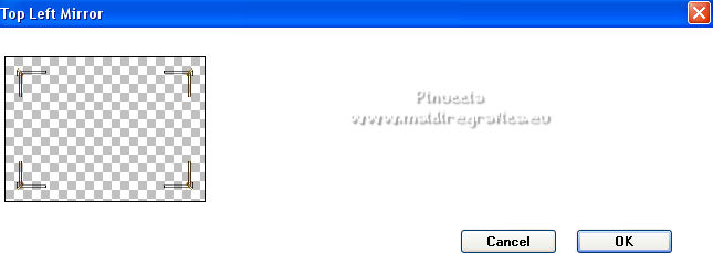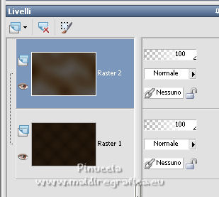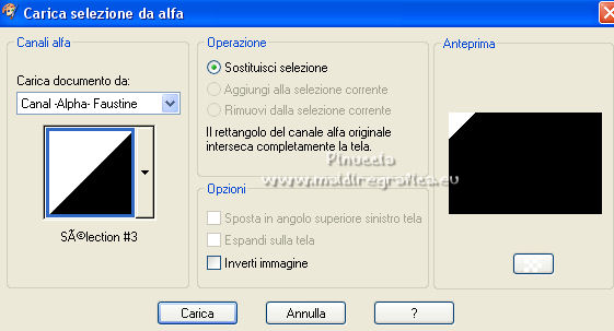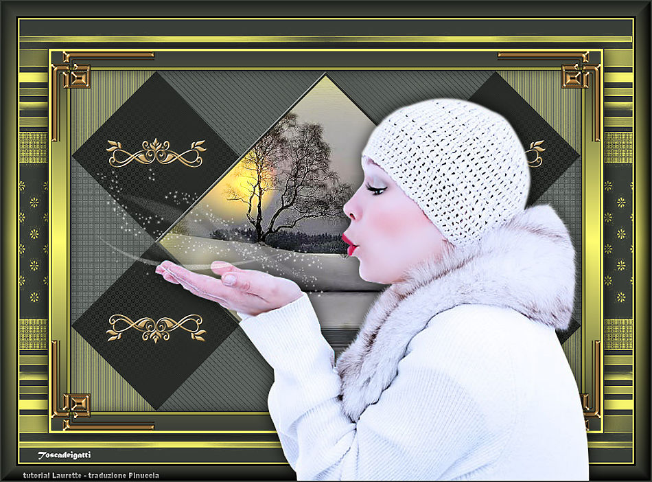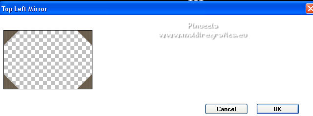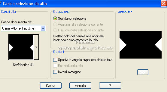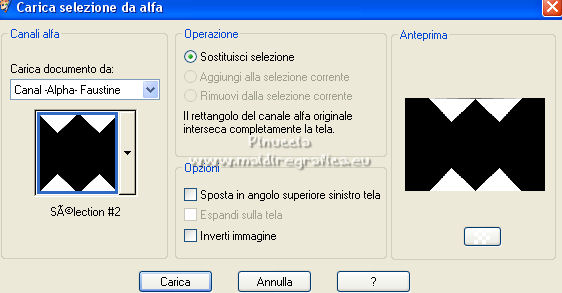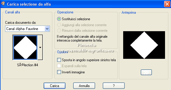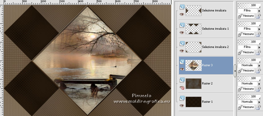 qui puoi trovare qualche risposta ai tuoi dubbi. Se l'argomento che ti interessa non è presente, ti prego di segnalarmelo. Questo tutorial è stato scritto con PSP2020 e tradotto con CorelX, ma può essere realizzato anche con le altre versioni di PSP. Dalla versione X4, il comando Immagine>Rifletti è stato sostituito con Immagine>Capovolgi in orizzontale, e il comando Immagine>Capovolgi con Immagine>Capovolgi in verticale. Nelle versioni X5 e X6, le funzioni sono state migliorate rendendo disponibile il menu Oggetti. Con la nuova versione X7, sono tornati Rifletti>Capovolgi, ma con nuove varianti. Vedi la scheda sull'argomento qui Occorrente: ![]() Il materiale è di Laurette. L'autrice prega di non condividere in rete i suoi tubes. (in questa pagina trovi i links ai siti dei creatori di tubes) ![]() in caso di dubbi, ricorda di consultare la mia sezione filtri qui Filters Unlimited 2-0 qui Simple - Pizza Slice Mirror, Blintz, Top Left Mirror qui Mehdi - Sorting Tiles qui Penta.com - Dot and Cross qui Mura's Seamless - Emboss at Alpha qui AP 01 Innovations - Lines SilverLining qui Graphics Plus - Cross Shadow qui L&K's - L&K's Palmyre qui Texture - Texturizer qui I filtri Simple, Penta, Graphics Plus e Mura's Seamless si possono usare da soli o importati in Filters Unlimited (come fare vedi qui) Se un filtro fornito appare con questa icona ![]() non esitare a cambiare modalità di miscelatura e opacità secondo i colori utilizzati. Nelle ultime versioni di PSP non c'è il gradiente di primo piano/sfondo (Corel_06_029) Puoi usare i gradienti delle versioni precedenti. Trovi qui i gradienti Corel X. Se hai problemi con il canale alfa, usa le selezioni da disco che trovi nel materiale. Apri la maschera in PSP e minimizzala con il resto del materiale. Scegli due colori dal tuo tube. Per il tutorial: imposta il colore di primo piano con il colore scuro #362515, e il colore di sfondo con il colore chiaro #c7b495. ![]() 1. Apri Calque-Alpha-faustine. Finestra>Duplica o sulla tastiera maiuscola+D per fare una copia. ![]() Chiudi l'originale. La copia, che sarà la base del tuo lavoro, non è vuota, ma contiene le selezioni salvate sul canale alfa. **Se hai problemi con il canale alfa, usa le selezioni da disco che trovi nel materiale. In questo caso, puoi aprire ugualmente questo file, o se preferisci apri una nuova immagine trasparente 900 x 600 pixels.** ![]() Riempi l'immagine trasparente con il colore scuro di primo piano #362515.Effetti>Plugins>L&K's - L&K's Palmyre, con i settaggi standard. ![]() 2. Livelli>Nuovo livello raster, Raster 2. Selezione>Seleziona tutto. Apri l'immagine fond du départ ![]() Colorizza secondo i tuoi colori. Modifica>Copia. Torna al tuo lavoro e vai a Modifica>Incolla nella selezione. Selezione>Deseleziona. ![]() 3. Effetti>Plugins>Mehdi - Sorting Tiles. ![]() Effetti>Effetti di bordo>Aumenta. Effetti>Plugins>Simple - Pizza Slice Mirror. Effetti>Effetti di riflesso>Specchio rotante. ![]() 4. Effetti>Plugins>Simple - Blintz. Livelli>Duplica. Immagine>Rifletti. Immagine>Capovolgi. Abbassa l'opacità di questo livello al 50%. Livelli>Unisci>Unisci giù. Regola>Messa a fuoco>Metti a fuoco. 5. Rimani sul livello superiore, Raster 2. Selezione>Carica/Salva selezione>Carica selezione da canale alfa. La selezione sélection #1 è subito disponibile. Devi soltanto cliccare Carica. ![]() Selezione>Innalza selezione a livello. Effetti>Plugins>Penta.com - Dot and Cross, con i settaggi standard. ![]() Effetti>Effetti 3D>Sfalsa ombra, colore nero. ![]() Cambia la modalità di miscelatura di questo livello in Filtra. Selezione>Deseleziona. 6. Attiva nuovamente il livello Raster 2. Selezione>Carica/Salva selezione>Carica selezione da canale alfa. Apri il menu delle selezioni e carica la selezione sélection #2 . ![]() Selezione>Innalza selezione a livello. Effetti>Plugins>AP 01 [Innovations] - Lines SilverLining. ![]() Effetti>Effetti 3D>Sfalsa ombra, colore nero. ![]() Cambia la modalità di miscelatura di questo livello in Filtra. Selezione>Deseleziona. 7. Attiva ancora il livello Raster 2. Selezione>Carica/Salva selezione>Carica selezione da canale alfa. Apri il menu delle selezioni e carica la selezione sélection #3 . ![]() Selezione>Innalza selezione a livello. Effetti>Effetti di trama>Veneziana - colore chiaro di sfondo. ![]() Selezione>Deseleziona. Effetti>Plugins>Simple - Top Left Mirror. ![]() Effetti>Effetti 3D>Sfalsa ombra, colore nero. ![]() Cambia la modalità di miscelatura di questo livello in Filtra. 8. Livelli>Nuovo livello raster. Selezione>Carica/Salva selezione>Carica selezione da canale alfa. Apri il menu delle selezioni e carica la selezione sélection #4. ![]() Riempi la selezione con il colore chiaro di sfondo #c7b495.Effetti>Plugins>Texture - Texturizer. ![]() Mantieni selezionato. Livelli>Nuovo livello raster, Raster 4. Apri il tube del paesaggio ![]() Modifica>Copia. Torna al tuo lavoro e vai a Modifica>Incolla nella selezione. Livelli>Duplica. Livelli>Unisci>Unisci giù. Mantieni ancora selezionato. 9. Selezione>Modifica>Seleziona bordature selezione. ![]() Livelli>Nuovo livello raster. Riempi con il colore scuro di primo piano #362515.Effetti>Plugins>Graphics Plus - Cross Shadow, con i settaggi standard. ![]() Effetti>Plugins>Mura's Seamless - Emboss at Alpha, con i settaggi standard. ![]() Livelli>Unisci>Unisci giù - 2 volte. Effetti>Effetti 3D>Sfalsa ombra, colore nero. ![]() Selezione>Deseleziona. 10. Chiudi o sopprimi il livello Raster 2, che non ci serve più. ![]() Attiva il livello superiore. Apri il tube déco1 ![]() Modifica>Copia. Torna al tuo lavoro e vai a Modifica>Incolla come nuovo livello. E' al suo posto. Effetti>Plugins>Mura's Seamless - Emboss at Alpha, con i settaggi standard. Effetti>Effetti 3D>Sfalsa ombra, colore scuro di primo piano. ![]() 12. Immagine>Aggiungi bordatura, 2 pixels, simmetriche, colore di primo piano. Immagine>Aggiungi bordatura, 4 pixels, simmetriche, colore di sfondo. Immagine>Aggiungi bordatura, 2 pixels