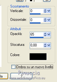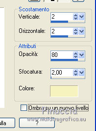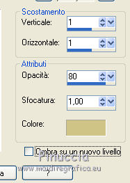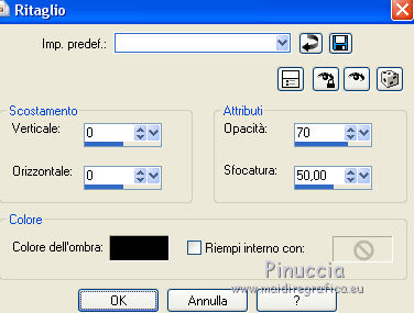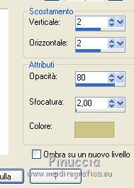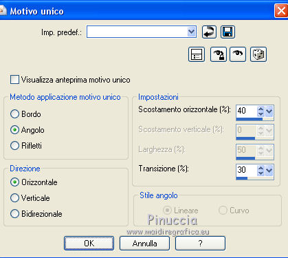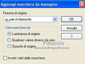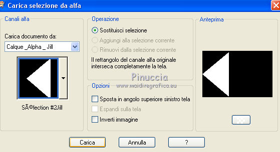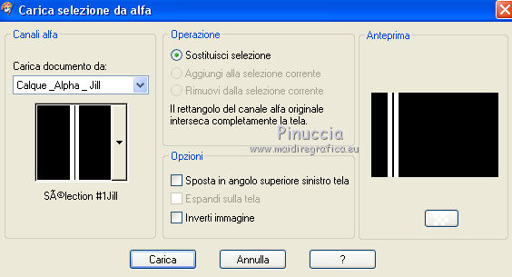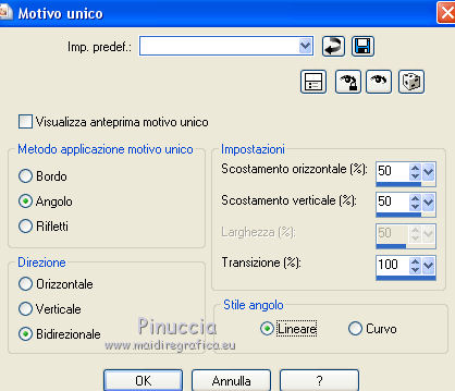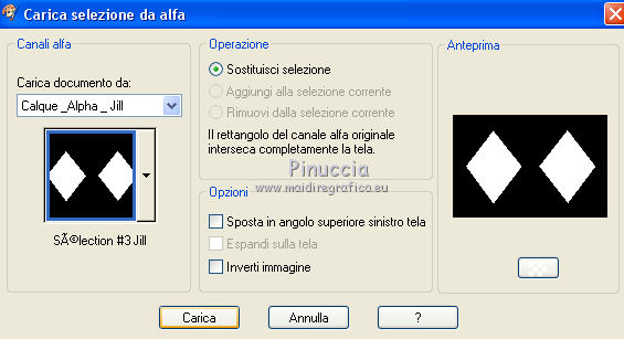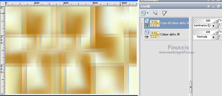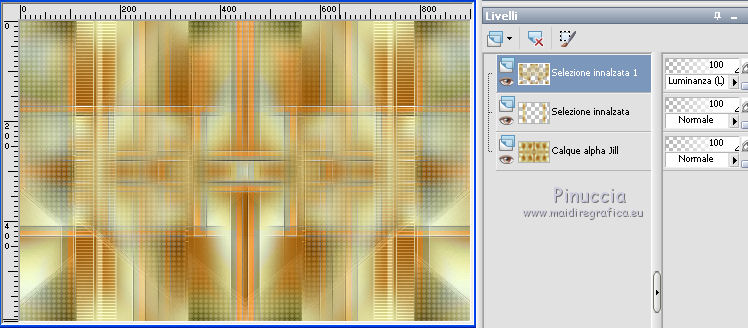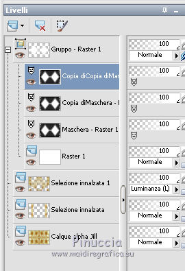 qui puoi trovare qualche risposta ai tuoi dubbi. Se l'argomento che ti interessa non è presente, ti prego di segnalarmelo. Questo tutorial è stato scritto con PSPX9 e tradotto con CorelX e CorelX3, ma può essere realizzato anche con le altre versioni di PSP. Dalla versione X4, il comando Immagine>Rifletti è stato sostituito con Immagine>Capovolgi in orizzontale, e il comando Immagine>Capovolgi con Immagine>Capovolgi in verticale. Nelle versioni X5 e X6, le funzioni sono state migliorate rendendo disponibile il menu Oggetti. Con la nuova versione X7, sono tornati Rifletti>Capovolgi, ma con nuove varianti. Vedi la scheda sull'argomento qui traduzione in inglese/english translation qui/hereOccorrente: Tubes a scelta. Il resto del materiale qui I tubes usati per il mio esempio sono di Tocha e Anna.br. (in questa pagina trovi i links ai siti dei creatori di tubes) Filtri in caso di dubbi, ricorda di consultare la mia sezione filtri qui Filters Unlimited 2.0 qui Mura's Seamless - Emboss at alpha qui Mehdi - Sorting Tiles qui Toadies - What are you qui Graphics Plus - Quick Tile I qui Carolaine and Sensibility - CS-Texture qui AP Lines - Lines SilverLining qui I filtri Toadies e Graphics Plus si possono usare da soli o importati in Filters Unlimited (come fare vedi qui) Se un filtro fornito appare con questa icona ![]() non esitare a cambiare modalità di miscelatura e opacità secondo i colori utilizzati. Apri la maschera in PSP e minimizzala con il resto del materiale. Imposta il colore di primo piano con #b4740e, e il colore di sfondo con #f5f2bf. ![]() 1. Apri Vyp_ Alpha_Jill. Finestra>Duplica, o sulla tastiera maiuscolo+D, per fare una copia. Chiudi l'originale. La copia, che sarà la base del tuo lavoro, non è vuota, ma contiene le selezioni salvate sul canale alfa. 2. Effetti>Plugins>Mehdi - Wavy Lab 1.1. Questo filtro crea gradienti con i colori della paletta Il primo è il colore di sfondo #f5f2bf e il secondo quello di primo piano #b4740e. Cambia gli altri due colori creati dal filtro: il terzo con il colore #cfc486 e il quarto con il colore #e6efde ![]() Regola>Sfocatura>Sfocatura gaussiana - raggio 20. ![]() Effetti>Plugins>Mehdi - Sorting Tiles. ![]() Effetti>Effetti di bordo>Aumenta. 3. Effetti>Effetti di immagine>Motivo unico. ![]() Livelli>Duplica. Effetti>Plugins>Toadies - What are you. ![]() Effetti>Effetti di bordo>Aumenta. Cambia la modalità di miscelatura di questo livello in Luminanza (esistente). ![]() Livelli>Unisci>Unisci giù. 4. Effetti>Plugins>Graphics Plus - Quick Tile I. ![]() Livelli>Duplica. Cambia la modalità di miscelatura di questo livello in Moltiplica, e abbassa l'opacità di questo livello al 50%. Livelli>Unisci>Unisci giù. 5. Selezione>Carica/Salva selezione>Carica selezione da canale alfa. La selezione #1 è subito disponibile. Devi soltanto cliccare Carica. ![]() Selezione>Innalza selezione a livello. Effetti>Plugins>Carolaine and Sensibility - CS-Textures ![]() Selezione>Deseleziona. Livelli>Duplica. Immagine>Rifletti. Livelli>Unisci>Unisci giù. Effetti>Effetti 3D>Sfalsa ombra, colore #f5f2bf. ![]() Ripeti l'Effetto Sfalsa ombra verticale e orizzontale -2. 6. Attiva il livello di sfondo. Selezione>Carica/Salva selezione>Carica selezione da canale alfa. Apri il menu delle selezioni e carica selezione #2. ![]() Selezione>Innalza selezione a livello. Livelli>Disponi>Porta in alto. Regola>Sfocatura>Sfocatura gaussiana - raggio 10. ![]() Effetti>Plugins>AP Lines - Lines SilverLining. ![]() Effetti>Plugins>Toadies - What are you ![]() Effetti>Effetti di bordo>Aumenta di più. Selezione>Deseleziona. Livelli>Duplica. Immagine>Rifletti. Livelli>Unisci>Unisci giù. Cambia la modalità di miscelatura di questo livello in Luminanza (esistente). 7. Effetti>Effetti di immagine>Motivo unico. ![]() Effetti>Effetti di riflesso>Specchio rotante. ![]() ![]() 8. Rimani posizionato sul livello superiore. Imposta il colore di primo piano con il colore bianco. Livelli>Nuovo livello raster. Riempi con il colore bianco.Livelli>Nuovo livello maschera>Da immagine. Apri il menu sotto la finestra di origine e vedrai la lista dei files aperti e seleziona la maschera sg_pair-of-diamonds @ ![]() Livelli>Duplica - 2 volte. ![]() Livelli>Unisci>Unisci gruppo. Effetti>Effetti 3D>Sfalsa ombra, colore #cfc486. ![]() Effetti>Plugins>Mura's Seamless - Emboss at alpha, con i settaggi standard. ![]() 9. Attiva il livello superiore. Selezione>Carica/Salva selezione>Carica selezione da canale alfa. Apri il menu delle selezioni e carica selezione #3. ![]() Apri il tube paysage Jill e vai a Modifica>Copia. Torna al tuo lavoro e vai a Modifica>Incolla nella selezione. Livelli>Nuovo livello raster. Effetti>Effetti 3D>Ritaglio. ![]() Selezione>Deseleziona. ![]() Livelli>Unisci>Unisci visibile. 10. Apri il tube déco 1 e vai a Modifica>Copia. Torna al tuo lavoro e vai a Modifica>Incolla come nuovo livello. Non spostarlo. Effetti>Effetti 3D>Sfalsa ombra, colore nero. ![]() 11. Apri il tube déco 2 e vai a Modifica>Copia. Torna al tuo lavoro e vai a Modifica>Incolla come nuovo livello. Non spostarlo. Effetti>Plugins>AP Lines - Lines SilverLining. ![]() Effetti>Effetti 3D>Sfalsa ombra, colore #cfc486. ![]() Ripeti l'Effetto Sfalsa ombra, cambiando verticale e orizzontale -2. Abbassa l'opacità di questo livello al 55%. 12. Apri il tube déco 3 e vai a Modifica>Copia. Torna al tuo lavoro e vai a Modifica>Incolla come nuovo livello. Non spostarlo. 13. Per i bordi, imposta nuovamente il colore di primo piano con #b4740e. ![]() Immagine>Aggiungi bordatura, 1 pixel, simmetriche, colore bianco. Immagine>Aggiungi bordatura, 3 pixels, simmetriche, colore di primo piano #b4740e. Immagine>Aggiungi bordatura, 3 pixels, simmetriche, colore di sfondo #f5f2bf. Immagine>Aggiungi bordatura, 2 pixels, simmetriche, colore #dadce8. Selezione>Seleziona tutto. Immagine>Aggiungi bordatura, 15 pixels, simmetriche, colore bianco. Selezione>Inverti. Effetti>Plugins>Mehdi - Wavy Lab 1.1, con i settaggi precedenti, ma dov