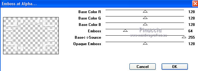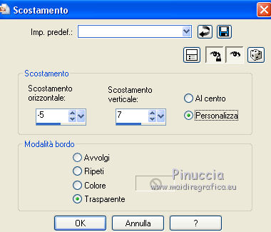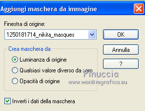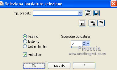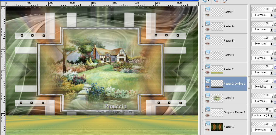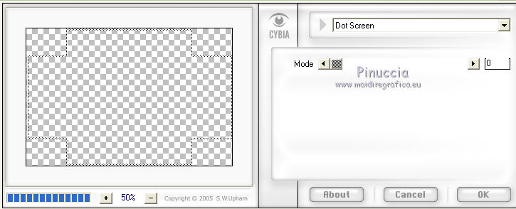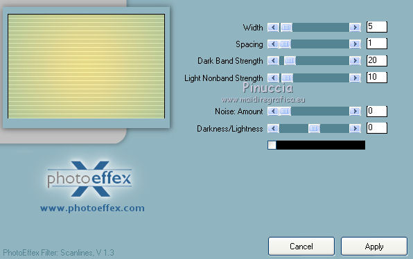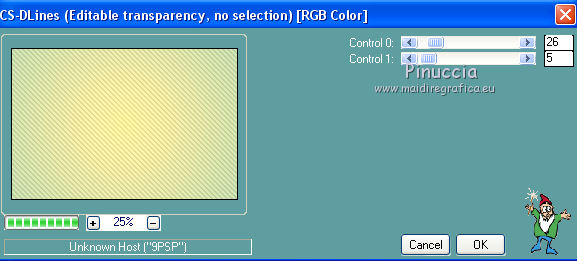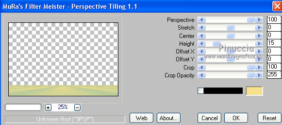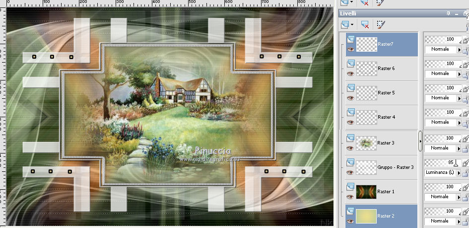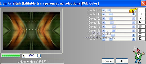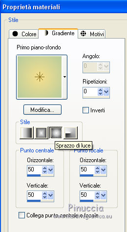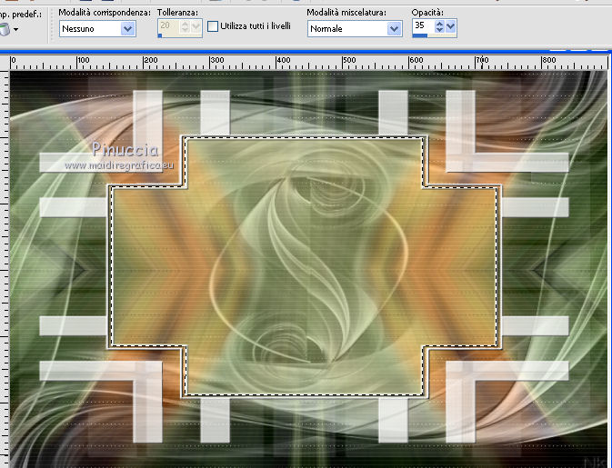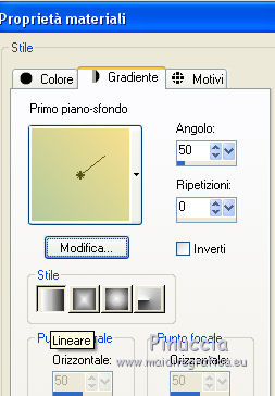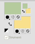 qui puoi trovare qualche risposta ai tuoi dubbi. Se l'argomento che ti interessa non è presente, ti prego di segnalarmelo. Questo tutorial è stato scritto con PSP2020 e tradotto con CorelX, ma può essere realizzato anche con le altre versioni di PSP. Dalla versione X4, il comando Immagine>Rifletti è stato sostituito con Immagine>Capovolgi in orizzontale, e il comando Immagine>Capovolgi con Immagine>Capovolgi in verticale. Nelle versioni X5 e X6, le funzioni sono state migliorate rendendo disponibile il menu Oggetti. Con la nuova versione X7, sono tornati Rifletti>Capovolgi, ma con nuove varianti. Vedi la scheda sull'argomento qui Occorrente: Materiale qui Per la maschera grazie Nikita Il resto del materiale è di Laurette (in questa pagina trovi i links ai siti dei creatori di tubes) Filtri in caso di dubbi, ricorda di consultare la mia sezione filtri qui Filters Unlimited 2.0 qui Photo Effex - Scanlines qui L&K's - L&K's Zitah qui Mura's Meister - Perspective Tiling qui Mura' Seamless - Emboss at Alpha qui Graphics Plus - Cross Shadow qui Cybia - Screenworks qui Carolaine and Sensibility - CS-DLines qui I filtri Mura's Seamless, Graphics Plus e Cybia si possono usare da soli o importati in Filters Unlimited (come fare vedi qui) Se un filtro fornito appare con questa icona ![]() Nelle ultime versioni di PSP non c'è il gradiente di primo piano/sfondo (Corel_06_029) Puoi usare i gradienti delle versioni precedenti. Trovi qui i gradienti Corel X. Apri la maschera in PSP e minimizzala con il resto del materiale. Imposta il colore di primo piano con il colore giallo #f7e08d. e il colore di sfondo con il colore verde chiaro #b6cb9d. ![]() Passa il colore di primo piano a Gradiente di primo piano/sfondo, stile Sprazzo di luce. ![]() 1. Apri canal alpha leatitia. Finestra>Duplica o sulla tastiera maiuscola+D per fare una copia. ![]() Chiudi l'originale. La copia, che sarà la base del tuo lavoro, non è vuota, ma contiene una selezione salvata sul canale alfa. Selezione>Seleziona tutto. Apri l'imagine Fractale, colorizza se stai usando altri colori, o usa uno dei tuoi. Torna al tuo lavoro e vai a Modifica>Incolla nella selezione. Selezione>Deseleziona. 2. Regola>Sfocatura>Sfocatura radiale. ![]() 3. Effetti>Effetti di riflesso>Specchio rotante. ![]() 4. Immagine>Ruota a sinistra. Effetti>Effetti di riflesso>Specchio rotante con i settaggi precedenti. ![]() Immagine>Ruota a destra. Effetti>Effetti di bordo>Aumenta di più. 5. Livelli>Nuovo livello raster. Riempi il livello con il gradiente.Effetti>Plugins>Carolaine and Sensibility - CS-DLines. ![]() 6. Effetti>Plugins>Photo Effex - Scanlines. ![]() Livelli>Disponi>Porta sotto (non preoccuparti se, per il momento, il livello sarà coperto dal livello superiore). Attiva nuovamente il livello superiore Raster 1. Effetti>Plugins>Photo Effex - Scanlines, con i settaggi precedenti. 7. Efetti>Plugins>L&K's - L&K's Zitah. ![]() Ripeti l'Effetto una seconda volta. 8. Imposta il colore di primo piano con il colore bianco. Livelli>Nuovo livello raster. Riempi il livello con il colore bianco.Livelli>Nuovo livello maschera>Da immagine. Apri il menu sotto la finestra di origine e vedrai la lista dei files aperti. Seleziona la maschera di Nikita 1250181714 ![]() Livelli>Unisci>Unisci gruppo. Cambia la modalità di miscelatura di questo livello in Luminanza (esistente), e abbassa l'opacità all'85%. 9. Apri il tube déco n. 1 e vai a Modifica>Copia. Torna al tuo lavoro e vai a Modifica>Incolla come nuovo livello. Non spostarlo. Effetti>Plugins>Mura's Seamless - Emboss at Alpha - 2 volte con i settaggi standard. ![]() 10. Selezione>Carica/Salva selezione>Carica selezione da canale alfa. La selezione #1 è subito disponibile. Devi soltanto cliccare Carica. ![]() Imposta il colore di primo piano con il colore verde chiaro #b6cb9d, e il colore di sfondo con il colore giallo #f7e08d. ![]() Passa il colore di primo piano a Gradiente di primo piano/sfondo, stile Lineare. ![]() Abbassa l'opacità dello strumento Riempimento al 35% e riempi il livello con il gradiente lineare.![]() Non dimenticare di riportare l'opacità a 100. Apri il tube del paesaggio e vai a Modifica>Copia. Torna al tuo lavoro e vai a Modifica>Incolla nella selezione. Mantieni selezionato. 11. Livelli>Nuovo livello raster. Effetti>Effetti 3D>Ritaglio. ![]() Livelli>Nuovo livello raster. Ripeti Effetti>Effetti 3D>Ritaglio, verticale e orizzonale - ![]() Mantieni ancora selezionato. 12. Selezione>Modifica>Seleziona bordature selezione. ![]() Livelli>Nuovo livello raster. Imposta nuovamente il colore di primo piano con il colore bianco. Riempi la selezione con il colore bianco.Effetti>Plugins>Cybia - Screenworks - Dot Screen. ![]() Effetti>Effetti 3D>Sfalsa ombra, colore nero. ![]() Modifica>Ripeti Sfalsa ombra. Selezione>Deseleziona. 13. Apri il tube déco 2 e vai a Modifica>Copia. Torna al tuo lavoro e vai a Modifica>Incolla come nuovo livello. Effetti>Effetti di immagine>Scostamento. ![]() Effetti>Effetti 3D>Sfalsa ombra, con i settaggi precedenti. ![]() 14. Attiva il livello inferiore, Raster 2. ![]() Effetti>Plugins>Mura's Meister - Perspective Tiling. ![]() Livelli>Disponi>Sposta su - 3 volte. Livelli>Duplica. Cambia la modalità di miscelatura di questo livello in Moltiplica, e abbassa l'opacità al 90%. Livelli>Unisci>Unisci giù. Effetti>Effetti 3D>Sfalsa ombra, colore nero, ombra su nuovo livello selezionato. ![]() Cambia la modalità di miscelatura del livello dell'ombra in Moltiplica. ![]() Immagine>Aggiungi bordatura, 1 pixel, simmetriche, colore #3d561c. Modifica>Copia. 15. Per i bordi, Imposta nuovamente il colore di primo piano con il colore verde chiaro #b6cb9d, e mantieni il colore di sfondo con il colore giallo #f7e08d. ![]() Immagine>Aggiungi bordatura, 3 pixels, simmetriche, colore verde #b6cb9d. Immagine>Aggiungi bordatura, 3 pixels, simmetriche, colore giallo #f7e08d. Selezione>Seleziona tutto. Immagine>Aggiungi bordatura, 30 pixels, simmetriche, colore bianco. Selezione>Inve