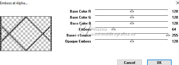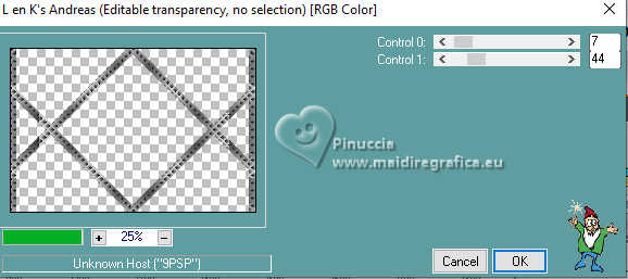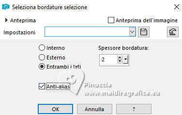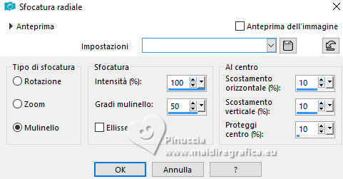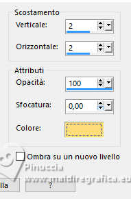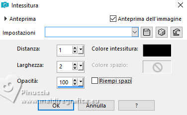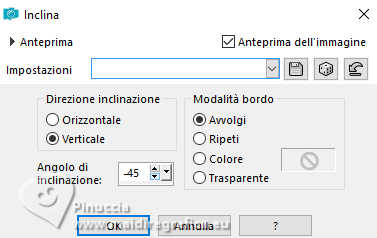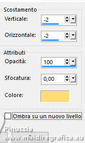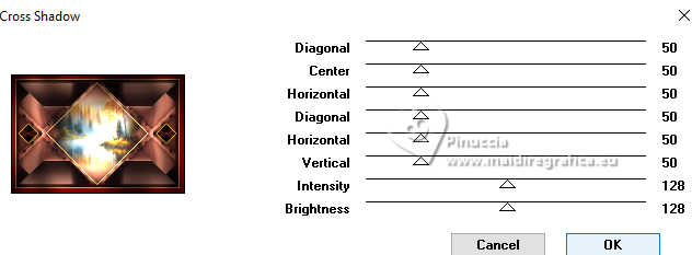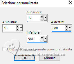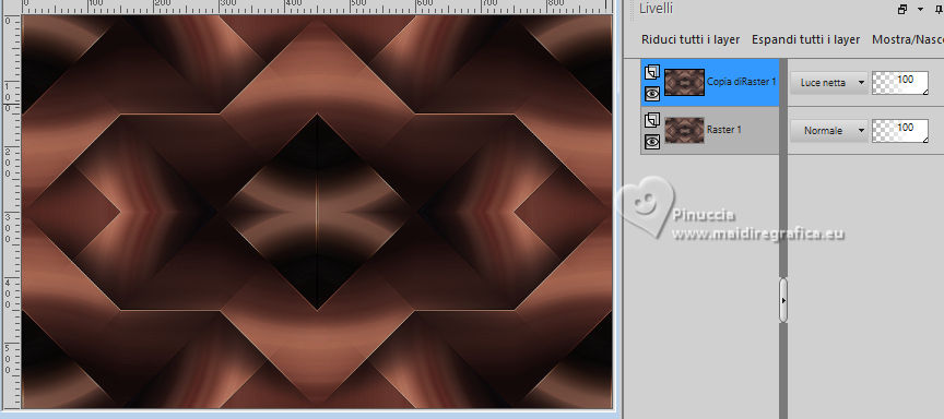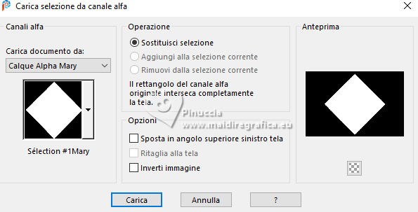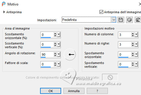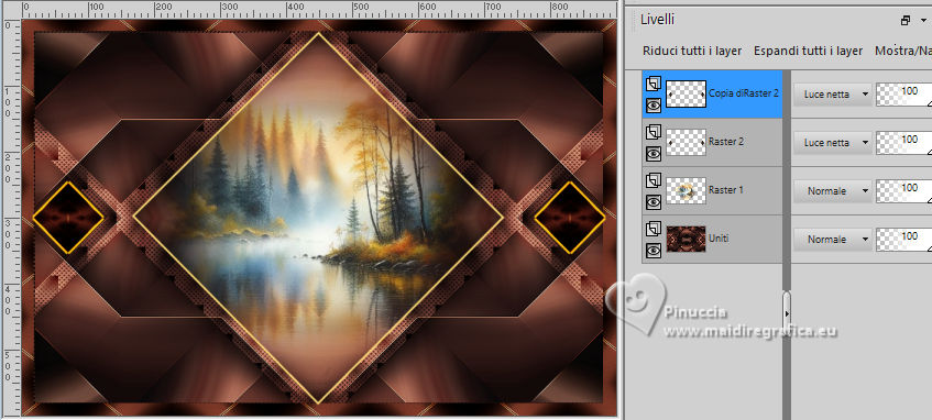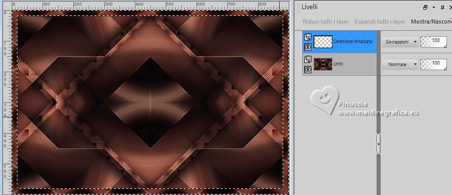 qui puoi trovare qualche risposta ai tuoi dubbi. Se l'argomento che ti interessa non è presente, ti prego di segnalarmelo. Questo tutorial è stato scritto con PSP2020 e tradotto con PSPX9, ma può essere realizzato anche con le altre versioni di PSP. Dalla versione X4, il comando Immagine>Rifletti è stato sostituito con Immagine>Capovolgi in orizzontale, e il comando Immagine>Capovolgi con Immagine>Capovolgi in verticale. Nelle versioni X5 e X6, le funzioni sono state migliorate rendendo disponibile il menu Oggetti. Con la nuova versione X7, sono tornati Rifletti>Capovolgi, ma con nuove varianti. Vedi la scheda sull'argomento qui Occorrente: ![]() Materiale di Laurette. L'autrice prega di non condividere in rete i suoi tubes. (in questa pagina trovi i links ai siti dei creatori di tubes) ![]() in caso di dubbi, ricorda di consultare la mia sezione filtri qui Filters Unlimited 2.0 qui Graphics Plus - Cross Shadow qui L&K's - L&K's Andreas qui Simple - Blintz, Pizza Slice Mirror qui I filtri Graphics Plus e Simple si possono usare da soli o importati in Filters Unlimited (come fare vedi qui) Se un filtro fornito appare con questa icona ![]() non esitare a cambiare modalità di miscelatura e opacità secondo i colori utilizzati. ![]() Se hai problemi con il canale alfa, apri una nuova immagine trasparente 900 x 600 pixels, e usa la selezione da disco. Paletta colori ![]() 1. Apri Calque Alpha Mary Questa immagine, che sarà la base del tuo lavoro, non è vuota, ma contiene una selezione salvata sul canale alfa. Imposta il colore di primo piano con il colore 3 #4e2522. ![]() Riempi l'immagine trasparente con il colore di primo piano.2. Selezione>Seleziona tutto. Apri il tube principale IA-175-laurette ![]() Cancella la firma e vai a Modifica>Copia. Minimizza il tube. Torna al tuo lavoro e vai a Modifica>Incolla nella selezione. Selezione>Deseleziona. Regola>Sfocatura>Sfocatura radiale. ![]() 3. Effetti>Plugins>Simple - Blintz. Effetti>Plugins>Simple - Pizza Slice Mirror. Modifica>Ripeti Pizza Slice Mirror. Effetti>Effetti di bordo>Aumenta. Effetti>Effetti di riflesso>Specchio rotante, con i settaggi standard. ![]() 4. Effetti>Effetti di immagine>Motivo unico, con i settaggi standard. ![]() Livelli>Duplica. Cambia la modalità di miscelatura di questo livello in Luce netta. ![]() Livelli>Unisci>Unisci giù. 5. Selezione>Seleziona tutto. Selezione>Modifica>Contrai - 20 pixels. Selezione>Inverti. Regola>Sfocatura>Sfocatura gaussiana - raggio 50. ![]() Effetti>Effetti di trama>Intessitura, colore nero. ![]() Selezione>Innalza selezione a livello. Selezione>Deseleziona. 6. Effetti>Effetti geometrici>Inclina. ![]() Livelli>Duplica. Immagine>Rifletti>Rifletti orizzontalmente. Livelli>Unisci>Unisci giù. Effetti>Plugins>L&K's - L&K's Andreas, con i settaggi standard. ![]() Cambia la modalità di miscelatura di questo livello in Sovrapponi. Effetti>Plugins>Mura's Seamless - Emboss at Alpha, con i settaggi standard. ![]() Effetti>Effetti 3D>Sfalsa ombra, colore nero. ![]() Livelli>Unisci>Unisci visibile. 7. Attiva lo strumento Selezione ![]() (non importa il tipo di selezione impostato, perch con la selezione personalizzata si ottiene sempre un rettangolo) clicca sull'icona Selezione personalizzata ![]() e imposta i seguenti settaggi. ![]() Selezione>Inverti. Regola>Sfocatura>Sfocatura gaussiana - raggio 50. Effetti>Effetti di riflesso>Motivo, con i settaggi standard. ![]() Selezione>Innalza selezione a livello. Cambia la modalità di miscelatura di questo livello in Sovrapponi. ![]() Livelli>Unisci>Unisci visibile. Selezione>Deseleziona. 8. Livelli>Nuovo livello raster, Raster 1. Selezione>Carica/Salva selezione>Carica selezione da canale alfa. La selezione #1 è subito disponibile. Devi soltanto cliccare Carica. ![]() Apri il tube del paesaggio paysage ![]() Cancella il watermark e vai a Modifica>Copia. Torna al tuo lavoro e vai a Modifica>Incolla nella selezione. Livelli>Duplica. Livelli>Unisci>Unisci giù. Mantieni selezionato. 9. Selezione>Modifica>Seleziona bordature selezione. ![]() Imposta il colore di sfondo con il colore 2 #ffdd78 (giallo). Livelli>Nuovo livello raster. Riempi la selezione con il colore 2 #ffdd78 (giallo).Livelli>Unisci>Unisci giù. Selezione>Deseleziona. 10. Apri il tube deco 01 ![]() Cancella il watermark e vai a Modifica>Copia. Torna al tuo lavoro e vai a Modifica>Incolla come nuovo livello. Non spostarlo, è al suo posto. Cambia la modalità di miscelatura di questo livello in Luce netta. Effetti>Effetti 3D>Sfalsa ombra, colore 2 #ffdd78. ![]() Ripeti l'Effetto Sfalsa ombra, verticale e orizzontale -2. ![]() Livelli>Duplica. Immagine>Rifletti>Rifletti orizzontalmente. ![]() Livelli>Unisci>Unisci visibile. 11. Imposta il colore di primo piano con il colore 1 #610003 ![]() Immagine>Aggiungi bordatura, 1 pixel, simmetriche, colore 4 #ffffff. Immagine>Aggiungi bordatura, 2 pixels, simmetriche, colore 2 #ffdd78. Immagine>Aggiungi bordatura, 3 pixels, simmetriche, colore 1 #610003. 12. Selezione>Seleziona tutto. Immagine>Aggiungi bordatura, 15 pixels, simmeriche, colore 1 #610003. Selezione>Inverti. Effetti>Plugins>Graphics Plus - Cross Shadow, con i settaggi standard. ![]() Selezione>Deseleziona. 13. Immagine>Aggiungi bordatura, 1 pixel, simmetriche, colore 4 #ffffff. Immagine>Aggiungi bordatura, 2 pixels, simmetriche, colore 2 #ffdd78. Immagine>Aggiungi bordatura, 3 pixels, simmetriche, colore 1 #610003. 14. Selezione>Seleziona tutto. Immagine>Aggiungi bordatura, 50 pixels, simmeriche, colore 1 #610003. Effetti>Effetti di immagine>Motivo unico, con i settaggi standard. ![]() Selezione>Inverti. Regola>Sfocatura>Sfocatura gaussiana - raggio 50. ![]() 15. Effetti>Plugins>Texture - Texturizer. ![]() Selezione>Inverti. Effetti>Effetti 3D>Sfalsa ombra, colore nero. ![]() Selezione>Deseleziona. 16. Apri il tube deco 2 ![]() Cancella il watermark e vai a Modifica>Copia. Torna al tuo lavoro e vai a Modifica>Incolla come nuovo livello. Non spostarlo. Effetti>Effetti 3D>Sfalsa ombra