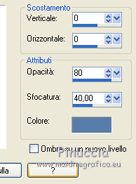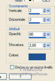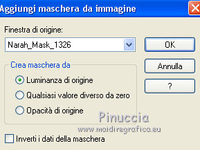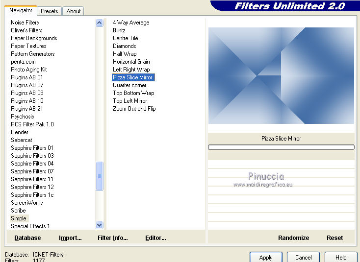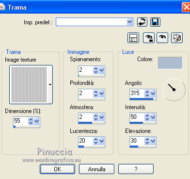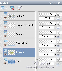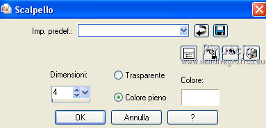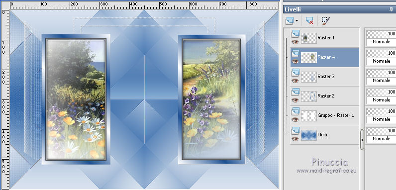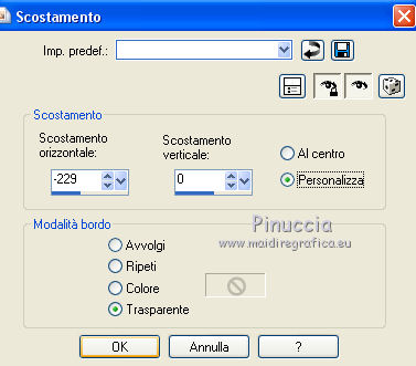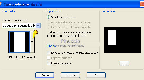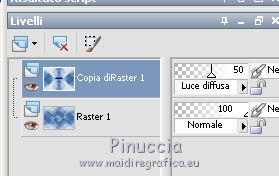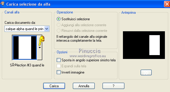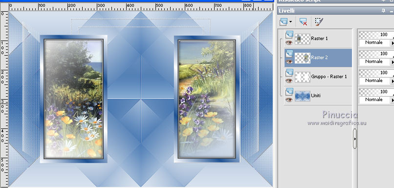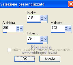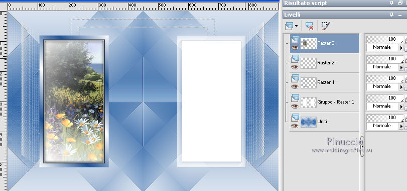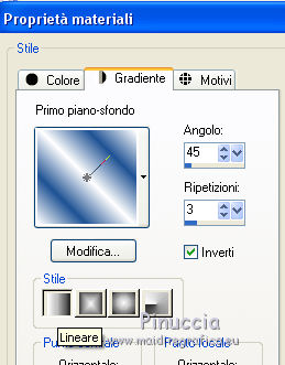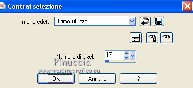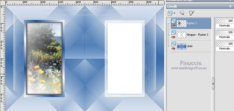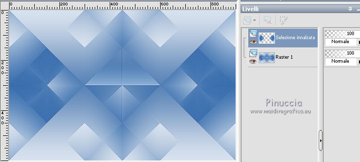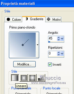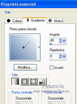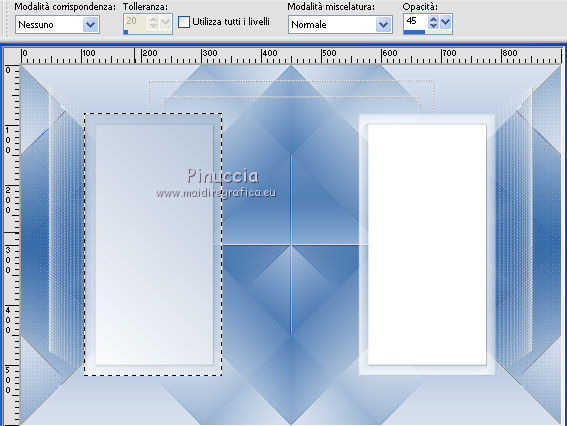 qui puoi trovare qualche risposta ai tuoi dubbi. Se l'argomento che ti interessa non è presente, ti prego di segnalarmelo. Questo tutorial è stato scritto con PSPX9 e tradotto con CorelX e CorelX3, ma può essere realizzato anche con le altre versioni di PSP. Dalla versione X4, il comando Immagine>Rifletti è stato sostituito con Immagine>Capovolgi in orizzontale, e il comando Immagine>Capovolgi con Immagine>Capovolgi in verticale. Nelle versioni X5 e X6, le funzioni sono state migliorate rendendo disponibile il menu Oggetti. Con la nuova versione X7, sono tornati Rifletti>Capovolgi, ma con nuove varianti. Vedi la scheda sull'argomento qui traduzione in inglese/english translation qui/hereOccorrente: Un tube a scelta. Il resto del materiale qui Per il mio esempio ho usato un tube di Tocha. (in questa pagina trovi i links ai siti dei creatori di tubes) Filtri in caso di dubbi, ricorda di consultare la mia sezione filtri qui Filters Unlimited 2.0 qui Mehdi - Wavy Lab 1.1 qui Mehdi - Sorting Tiles qui Mura's Seamless - Emboss at Alpha qui Simple - Pizza Slice Mirror qui Carolaine and Sensibility - CS-LDots qui Mura's Meister - Perspective Tiling qui Alien Skin Eye Candy 5 Impact - Glass qui AAA Frames - Foto Frame qui I filtri Simple, Toadies e VM Natural si possono usare da soli o importati in Filters Unlimited (come fare vedi qui) Se un filtro fornito appare con questa icona ![]() non esitare a cambiare modalità di miscelatura e opacità secondo i colori utilizzati. Nelle ultime versioni di PSP non c'è il gradiente di primo piano/sfondo (Corel_06_029) Puoi usare i gradienti delle versioni precedenti. Trovi qui i gradienti Corel X. Metti il preset Emboss 3 nella cartella Impostazioni predefinite. Metti la trama nella cartella Trame. Apri la maschera in PSP e minimizzala con il resto del materiale Imposta il colore di primo piano con #1f5294, e il colore di sfondo con il colore bianco #ffffff. ![]() Passa il colore di primo piano a Gradiente di primo piano/sfondo, stile Lineare. ![]() 1. Apri canal_alpha. Finestra>Duplica, o sulla tastiera maiuscola+D, per fare una copia Chiudi l'originale. La copia, che sarà la base del tuo lavor non è vuota, ma contiene le selezioni salvate sul canale alfa. Rinomina il livello Raster 1. Riempi l'immagine trasparente con il gradiente.Regola>Sfocatura>Sfocatura gaussiana - raggio 50. ![]() Modifica>Ripeti Sfocatura gaussiana. 2. Effetti>Plugins>Filters Unlimited 2.0 - Simple - Pizza Slice Mirror. ![]() Effetti>Effetti di riflesso>Specchio rotante. ![]() 3. Effetti>Plugins>Mehdi - Sorting Tiles. ![]() Effetti>Effetti di bordo>Aumenta. Livelli>Duplica. Abbassa l'opacità al 50%. Rimani sul livello Copia di Raster 1. Effetti>Plugins>Filters Unlimited 2.0 - Simple - Pizza Slice Mirror. ![]() Effetti>Effetti di riflesso>Specchio rotante, con i settaggi precedenti. Cambia la modalità di miscelatura di questo livello in Luce diffusa. ![]() Livelli>Unisci>Unisci giù. 4. Selezione>Carica/Salva selezione>Carica selezione da canale alfa. La selezione sélection#1 è subito disponibile. Devi soltanto cliccare Carica. ![]() Selezione>Innalza selezione a livello. Effetti>Plugins>Carolaine and Sensibility - CS-LDots ![]() Selezione>Deseleziona. Livelli>Duplica Immagine>Rifletti. Livelli>Unisci>Unisci giù. Effetti>Effetti di bordo>Aumenta. La tua paletta ![]() Livelli>Unisci>Unisci visibile. 5. Livelli>Nuovo livello raster. Riempi il livello con il colore bianco di sfondo.Livelli>Nuovo livello maschera>Da immagine. Apri il menu sotto la finestra di origine e vedrai la lista dei files aperti. Seleziona la maschera Narah _Mask_1326. ![]() Regola>Messa a fuoco>Metti a fuoco. Livelli>Unisci>Unisci gruppo. Effetti>Plugins>Mura's Meister - Emboss at Alpha, con i settaggi standard. ![]() 6. Attiva lo strumento Selezione ![]() (non importa il tipo di selezione impostato, perchè con la selezione personalizzata si ottiene sempre un rettangolo) clicca sull'icona Selezione personalizzata ![]() e imposta i seguenti settaggi. ![]() Premi sulla tastiera il tasto CANC ![]() Selezione>Deseleziona. 7. Livelli>Nuovo livello raster. Selezione>Carica/Salva selezione>Carica selezione da canale alfa. Apri il menu delle selezioni e carica la selezione sélection#2. ![]() Riempi la selezione con il gradiente.Selezione>Modifica>Contrai - 17 pixels. ![]() Premi sulla tastiera il tasto CANC. Mantieni selezionato. 8. Livelli>Nuovo livello raster. Imposta il colore di primo piano con il colore #597daa e mantieni il colore di sfondo con il colore bianco. ![]() Passa il colore di primo piano a Gradiente di primo piano/sfondo, angolo 45, ripetizioni 0, Inverti selezionato. ![]() Abbassa l'opacità dello strumento Riempimento a 45%. Riempi il livello con il gradiente.![]() Riporta l'opacità dello strumento Riempimento a 100. Selezione>Deseleziona. 9. Livelli>Nuovo livello raster. Apri il tube paysage n°1(1) e vai a Modifica>Copia. Torna al tuo lavoro e vai a Modifica>Incolla come nuovo livello. Posiziona il tube sulla selezione.Selezione>Inverti. Premi sulla tastiera il tasto CANC. Di nuovo Selezione>Inverti. Effetti>Plugins>Alien skin Eye Candy 5 Impact - Glass. Seleziona il preset Clear e ok. ![]() Effetti>Effetti 3D>Scalpello, colore bianco. ![]() Selezione>Deseleziona. Prima di unire i livelli, avrai questo: ![]() Livelli>Unisci>Unisci giù - 2 volte. ![]() 10. Attiva il livello della maschera, Gruppo Raster 1. Livelli>Nuovo livello raster. Selezione>Carica/Salva selezione>Carica selezione da canale alfa. Apri il menu delle selezioni e carica la selezione sélection#3. ![]() Imposta il colore di primo piano con il colore (#1f5294) e con il gradiente iniziali ![]() Riempi il livello con il gradiente.Selezione>Modifica>Contrai - 17 pixels. ![]() Premi sulla tastiera il tasto CANC. 11. Imposta nuovamente il colore di primo piano con #597daa ![]() e con il Gradiente ripetizioni 0, ma Inverti non selezionato. ![]() Abbassa l'opacità dello strumento Riempimento a 45. Riempi il livello con il gra