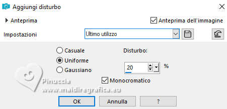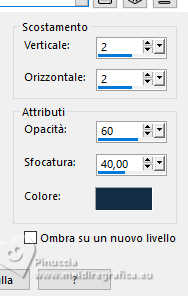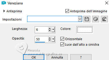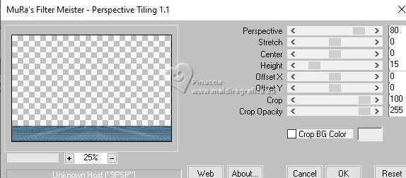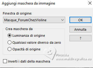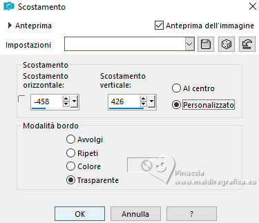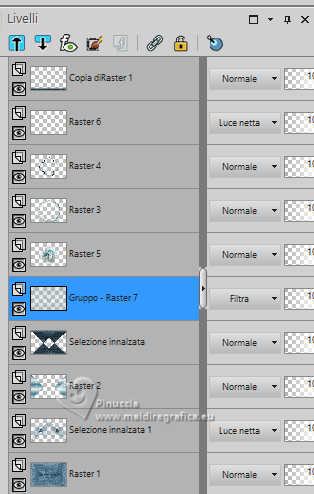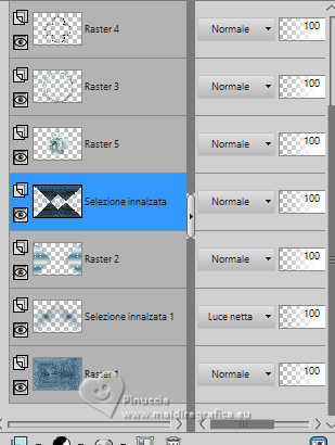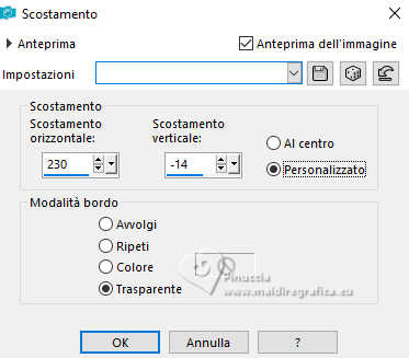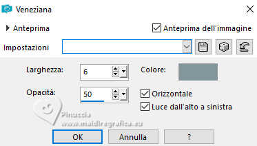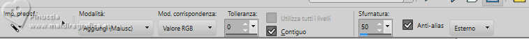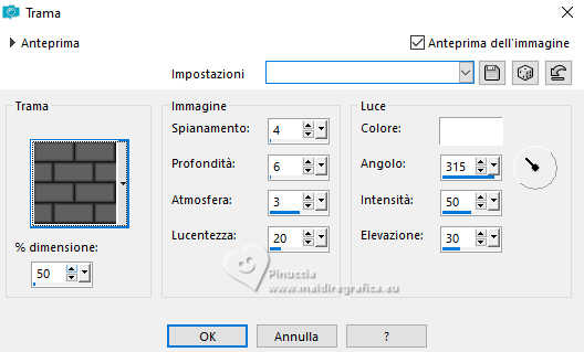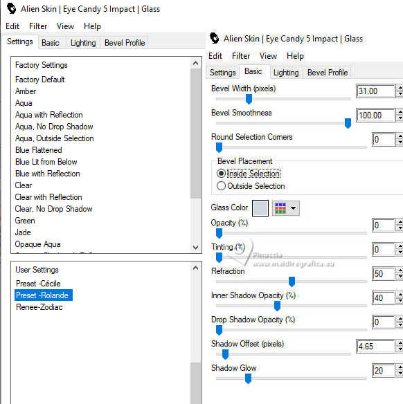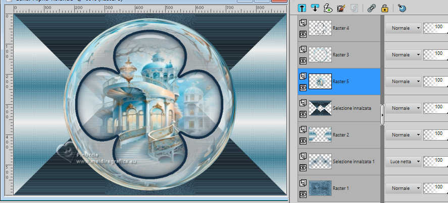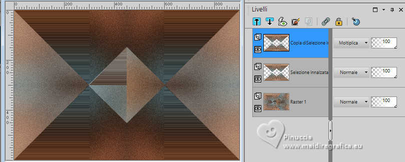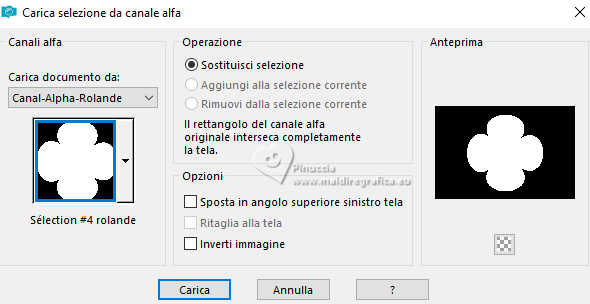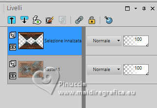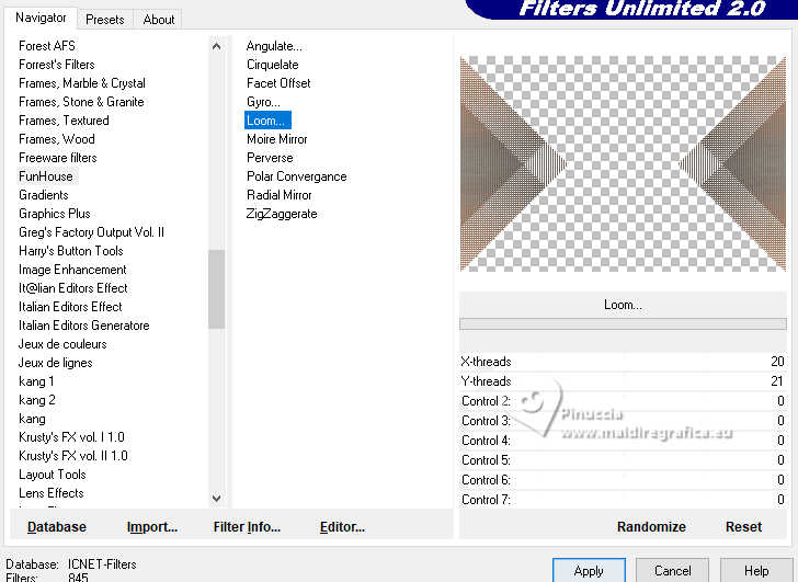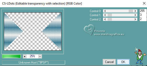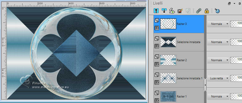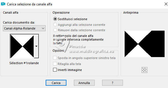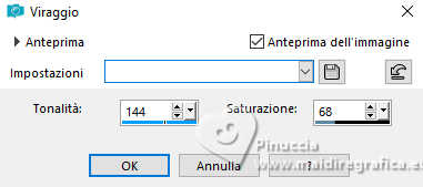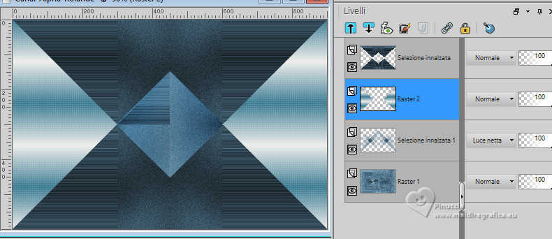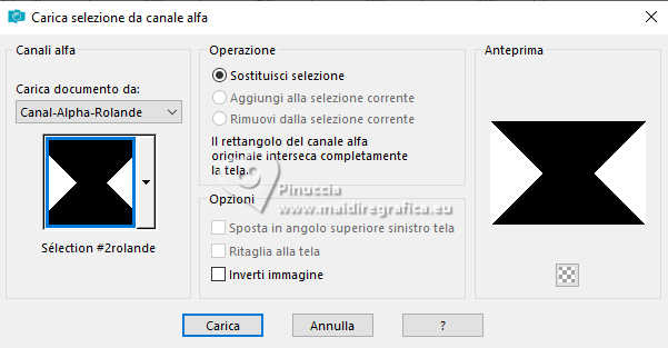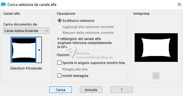 qui puoi trovare qualche risposta ai tuoi dubbi. Se l'argomento che ti interessa non è presente, ti prego di segnalarmelo. Questo tutorial è stato scritto con PSP2020 e tradotto con PSPX9, ma può essere realizzato anche con le altre versioni di PSP. Dalla versione X4, il comando Immagine>Rifletti è stato sostituito con Immagine>Capovolgi in orizzontale, e il comando Immagine>Capovolgi con Immagine>Capovolgi in verticale. Nelle versioni X5 e X6, le funzioni sono state migliorate rendendo disponibile il menu Oggetti. Con la nuova versione X7, sono tornati Rifletti>Capovolgi, ma con nuove varianti. Vedi la scheda sull'argomento qui Occorrente: ![]() L'autrice prega di non condividere in rete i suoi tubes. (in questa pagina trovi i links ai siti dei creatori di tubes) ![]() in caso di dubbi, ricorda di consultare la mia sezione filtri qui Filters Unlimited 2 qui Simple - Pizza Slice Mirror qui Simple - Left Right Wrap (bonus) qui Funhouse - Loom qui Carolaine and Sensibility - CS-LDots qui Flaming Pear - Flexify 2 qui Alien Skin Eye Candy 5 Impact - Glass qui Mura's Meister - Perspective Tiling qui FM Tile Tools - Saturation Emboss qui I filtri Simple e Funhouse si possono usare da soli o importati in Filters Unlimited (come fare vedi qui) Se un filtro fornito appare con questa icona ![]() non esitare a cambiare modalità di miscelatura e opacità secondo i colori utilizzati. Metti il preset Cliccando sul file una o due volte (a seconda delle tue impostazioni), automaticamente il preset si installerà nella cartella corretta. perché uno o due clic vedi qui ![]() Metti la trama Large bricks nella cartella Trame. Apri la maschera in PSP e minimizzala con il resto del materiale. Se hai problemi con il canale alfa, apri una nuova immagine trasparente 900 x 600 pixels e usa le selezioni da disco. Colori ![]() Imposta il colore di primo piano con il colore 3 #83969c e il colore di sfondo con il colore 2 #eeeeec. ![]() 1. Apri Calque-Alpha-Rolande. Questa immagine, che sarà la base del tuo lavoro, non é vuota, ma contiene le selezioni salvate sul canale alfa. Riempi l'immagine trasparente con il colore di primo piano #83969c.Selezione>Seleziona tutto. Apri il tube della donna femme-vintage-19.03.24-laurette ![]() Cancella il watermark e vai a Modifica>Copia. Minimizza il tube. Torna al tuo lavoro e vai a Modifica>Incolla nella selezione. Selezione>Deseleziona. 2. Effetti>Effetti di immagine>Motivo unico, con i settaggi standard. ![]() Regola>Sfocatura>Sfocatura gaussiana - raggio 60 ![]() Regola>Aggiungi/Rimuovi disturbo>Aggiungi disturbo. ![]() Effetti>Plugins>Simple - Pizza Slice Mirror. Questo effetto lavora senza finestra; risultato ![]() 3. Selezione>Carica/Salva selezione>Carica selezione da canale alfa. La selezione sélection #1 rolande è subito disponibile. Devi soltanto cliccare Carica. ![]() Selezione>Innalza selezione a livello. Selezione>Deseleziona. 4. Effetti>Effetti di riflesso>Specchio rotante. ![]() Livelli>Duplica. Cambia la modalità di miscelatura di questo livello in Moltiplica. ![]() Livelli>Unisci>Unisci giù. ![]() 5. Attiva il livello inferiore, Raster 1. Selezione>Carica/Salva selezione>Carica selezione da canale alfa. Apri il menu delle selezioni e carica la selezione sélection #2 rolande ![]() Selezione>Innalza selezione a livello. Effetti>Plugins>Filters Unlimited 2.0 - Funhouse - Loom. ![]() Cambia la modalità di miscelatura di questo livello in Luce netta, o secondo i tuoi colori. Selezione>Deseleziona. 6. Effetti>Effetti di immagine>Motivo unico, Fianco a fianco. ![]() Effetti>Effetti di riflesso>Specchio rotante, con i settaggi precedenti. ![]() Attiva il livello inferiore. Regola>Tonalità e saturazione>Viraggio ![]() Ripeti il Viraggio sugli altri livelli ![]() 7. Attiva il livello Selezione innalzata. Selezione>Carica/Salva selezione>Carica selezione da canale alfa. Apri il menu delle selezioni e carica nuovamente la selezione sélection #2 rolande ![]() Imposta il colore di primo piano con il colore 1 #3e7d94, e mantieni il colore di sfondo con il colore 2 #eeeeec. ![]() Passa il colore di primo piano a Gradiente di primo piano/sfondo, stile Lineare. ![]() Livelli>Nuovo livello raster, Raster 2. Riempi il livello con il gradiente.Effetti>Plugins>Carolaine and Sensibility - CS-LDots ![]() Selezione>Deseleziona. 8. Effetti>Effetti di immagine>Motivo unico, con i settaggi standard. ![]() Effetti>Effetti 3D>Sfalsa ombra, colore 4 #142e46. ![]() Ripeti l'Effetto Sfalsa ombra, verticale e orizzontale -2. La tag e i livelli: ![]() 9. Attiva il livello superiore. Selezione>Carica/Salva selezione>Carica selezione da canale alfa. Apri il menu delle selezioni e carica la selezione sélection #3 rolande ![]() Livelli>Nuovo livello raster. Riempi la selezione con il gradiente.Selezione>Modifica>Contrai - 3 pixels. Premi sulla tastiera il tasto CANC ![]() Mantieni selezionato. 10. Abbassa l'opacità dello strumento Riempimento al 40%. Riempi la selezione con il colore di sfondo #eeeeec.Apri il paesaggio paysage-23-02-24-laurette ![]() Modifica>Copia. Torna al tuo lavoro e vai a Modifica>Incolla nella selezione. Livelli>Duplica. Livelli>Unisci>Unisci giù. Riporta l'opacità dello strumento Riempimento a 100 Selezione>Deseleziona. 11. Effetti>Plugins>Flaming Pear - Flexify 2. ![]() Paletta dei livelli ![]() 12. Rimani sul livello superiore. Immagine>Ridimensiona, al 95%, tutti i livelli non selezionato. Selezione>Carica/Salva selezione>Carica selezione da canale alfa. Apri il menu delle selezioni e carica la selezione sélection #4 rolande ![]() 13. Livelli>Nuovo livello raster. Imposta il colore di primo piano con il colore 4 #142e46. ![]() Riempi il livello con il colore di primo piano.Selezione>Modifica>Contrai - 8 pixels. Premi sulla tastiera il tasto CANC. Selezione>Inverti. Effetti>Effetti 3D>Sfalsa ombra, colore 4 #142e46. ![]() Di nuovo Selezione>Inverti. Mantieni selezionato. 14. Riporta l'opacità dello strumento Riempimento a 40%. Livelli>Nuovo livello ra