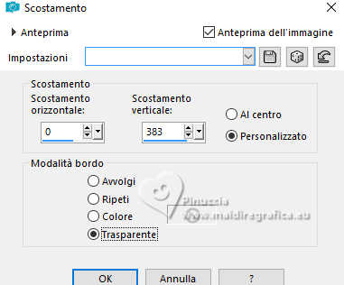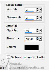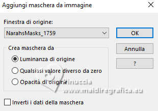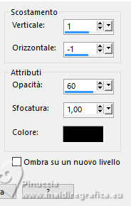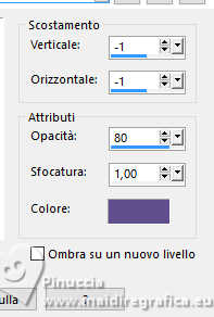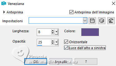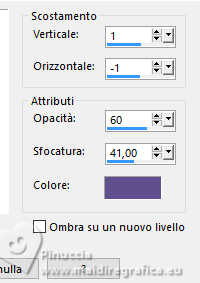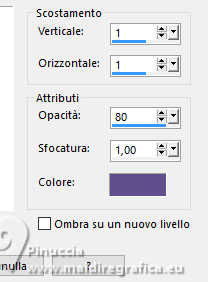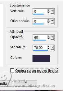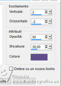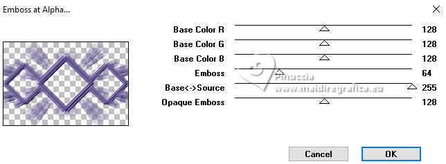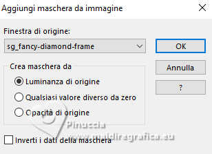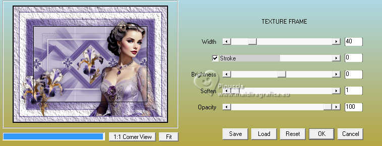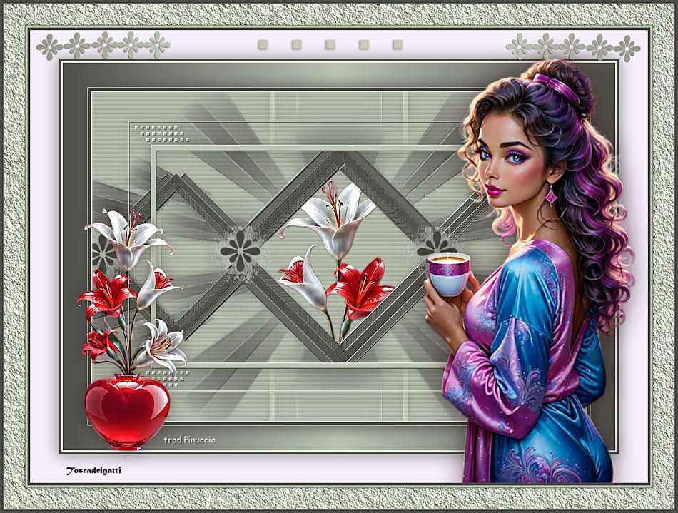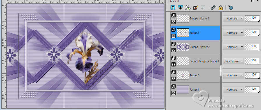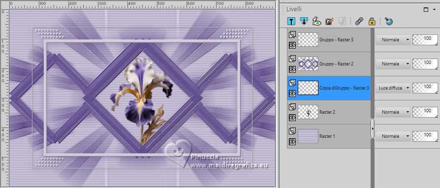 qui puoi trovare qualche risposta ai tuoi dubbi. Se l'argomento che ti interessa non è presente, ti prego di segnalarmelo. Questo tutorial è stato scritto con PSP2020 e tradotto con PSPX9, ma può essere realizzato anche con le altre versioni di PSP. Dalla versione X4, il comando Immagine>Rifletti è stato sostituito con Immagine>Capovolgi in orizzontale, e il comando Immagine>Capovolgi con Immagine>Capovolgi in verticale. Nelle versioni X5 e X6, le funzioni sono state migliorate rendendo disponibile il menu Oggetti. Con la nuova versione X7, sono tornati Rifletti>Capovolgi, ma con nuove varianti. Vedi la scheda sull'argomento qui Occorrente: ![]() L'autrice prega di non condividere in rete i suoi tubes. (in questa pagina trovi i links ai siti dei creatori di tubes) ![]() in caso di dubbi, ricorda di consultare la mia sezione filtri qui Filters Unlimited 2 qui Mura's Seamless - Emboss at Alpha qui AAA Frames - Foto Frame qui I filtri Mura's Seamless si possono usare da soli o importati in Filters Unlimited (come fare vedi qui) Se un filtro fornito appare con questa icona ![]() non esitare a cambiare modalità di miscelatura e opacità secondo i colori utilizzati. Nelle ultime versioni di PSP non c'é il gradiente di primo piano/sfondo (Corel_06_029) Puoi usare i gradienti delle versioni precedenti. Trovi qui i gradienti Corel X. ![]() Apri le maschere in PSP e minimizzale con il resto del materiale. Questi i colori usati nel tutorial. ![]() Imposta il colore di primo piano con il colore 1 #d0c9d9 e il colore di sfondo con il colore 2 #614f8d. ![]() 1. Apri una nuova immagine trasparente 900 x 600 pixels. ![]() Riempi l'immagine trasparente con il colore di primo piano #d0c9d9Effetti>Effetti di trama>Veneziana, colore di sfondo. ![]() 2. Livelli>Nuovo livello raster. Riempi con il colore di sfondo.Livelli>Nuovo livello maschera>Da immagine. Apri il menu sotto la finestra di origine e vedrai la lista dei files aperti. Seleziona la maschera sg_fancy-diamond-frame ![]() Effetti>Effetti di bordo>Aumenta. Livelli>Unisci>Unisci gruppo. Effetti>Effetti 3D>Sfalsa ombra, colore di sfondo. ![]() Ripeti l'Effetto Sfalsa ombra, verticale e orizzontale -1. ![]() 3. Effetti>Effetti di riflesso>Specchio rotante. ![]() Effetti>Plugins>Mura's Seamless - Emboss at alpha, con i settaggi standard. ![]() 4. Apri il tube fleur-Iris ![]() Modifica>Copia. Torna al tuo lavoro e vai a Modifica>Incolla come nuovo livello. Posiziona correttamente il tube al centro.Livelli>Disponi>Sposta giù. Effetti>Effetti 3D>Sfalsa ombra, colore di sfondo. ![]() 4. Attiva il livello superiore. Livelli>Nuovo livello raster. Riempi con il colore di primo piano.Livelli>Nuovo livello maschera>Da immagine. Apri il menu sotto la finestra di origine e seleziona la maschera NarahsMasks_1759 ![]() Effetti>Effetti di bordo>Aumenta. Livelli>Unisci>Unisci gruppo. Effetti>Plugins>Mura's Seamless - Emboss at alpha, con i settaggi standard. ![]() Effetti>Effetti 3D>Sfalsa ombra, colore di sfondo. ![]() Livelli>Duplica. Effetti>Effetti di immagine>Motivo unico, con i settaggi standard. ![]() Cambia la modalità di miscelatura di questo livello in Luce diffusa. Livelli>Disponi>Sposta giù - 2 volte. ![]() Attiva il livello superiore. Immagine>Ridimensiona, al 103%, tutti i livelli non selezionato. ![]() 5. Attiva il livello sottostante, Gruppo-Raster 2. Apri il tube déco_1 ![]() Colorizza secondo i tuoi colori. Modifica>Copia. Torna al tuo lavoro e vai a Modifica>Incolla come nuovo livello. Non spostarlo; è al suo posto. Effetti>Effetti 3D>Sfalsa ombra, colore bianco. ![]() Dovresti avere questo. ![]() 6. Passa il colore di primo piano a Gradiente di primo piano/sfondo, stile Lineare. ![]() 7. Immagine>Aggiungi bordatura, 2 pixels, simmetriche, colore bianco. Immagine>Aggiungi bordatura, 5 pixels, simmetriche, colore scuro. Immagine>Aggiungi bordatura, 2 pixels, simmetriche, colore chiaro. Selezione>Seleziona tutto. Immagine>Aggiungi bordatura, 45 pixels, simmetriche, con un colore qualsiasi. Selezione>Inverti. Riempi il livello con il gradiente.Di nuovo Selezione>Inverti. Effetti>Effetti 3D>Sfalsa ombra, colore di sfondo. ![]() Modifica>Ripeti Sfalsa ombra. Selezione>Deseleziona. 8. Immagine>Aggiungi bordatura, 2 pixels, simmetriche, colore bianco. Immagine>Aggiungi bordatura, 5 pixels, simmetriche, colore scuro. Immagine>Aggiungi bordatura, 2 pixels, simmetriche, colore chiaro. Selezione>Seleziona tutto. Immagine>Aggiungi bordatura, 50 pixels, simmetriche, colore bianco. Effetti>Effetti 3D>Sfalsa ombra, colore di sfondo. ![]() Selezione>Deseleziona. 8. Apri il tube della donna femme-virtuelle-04-06-24-laurette ![]() Cancella il watermark e vai a Modifica>Copia. Torna al tuo lavoro e vai a Modifica>Incolla come nuovo livello. Sposta il tube a destra.Effetti>Effetti 3D>Sfalsa ombra, colore #2d2442. ![]() 9. Apri il tube déco-bouquet ![]() Modifica>Copia. Torna al tuo lavoro e vai a Modifica>Incolla come nuovo livello. Immagine>Rifletti Sposta il tube in basso a sinistra.Effetti>Effetti 3D>Sfalsa ombra, colore nero. ![]() 10. Immagine>Aggiungi bordatura, 5 pixels, simmetriche, colore di sfondo. Selezione>Seleziona tutto. Immagine>Aggiungi bordatura, 45 pixels, simmetriche, colore di primo piano. Selezione>Inverti. Effetti>Plugins>AAA Frames - Texture Frame, con i settaggi standard. ![]() Modifica>Ripeti Texture Frame. Selezione>Deseleziona. 11. Apri il tube déco_cadre ![]() Modifica>Copia. Torna al tuo lavoro e vai a Modifica>Incolla come nuovo livello. Effetti>Effetti di immagine>Scostamento. ![]() Effetti>Effetti 3D>Sfalsa ombra, colore nero. ![]() 12. Firma il tuo lavoro su un nuovo livello. Immagine>Aggiungi bordatura, 5 pixels, simmetriche, colore di sfondo. Immagine>Ridimensiona, 950 pixels di larghezza, tutti i livelli selezionato. Regola>Messa a fuoco>Metti a fuoco. Salva in formato jpg. Per i tubes di questo esempio grazie Laurette ![]() ![]() Le vostre versioni. Grazie![]() Tosca dei gatti ![]() Diana ![]() Puoi scrivermi se hai pr