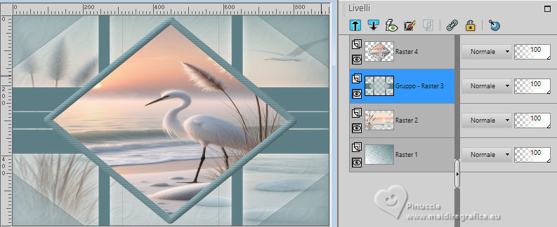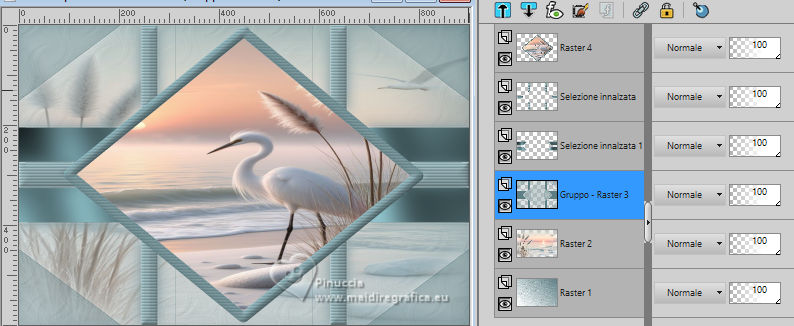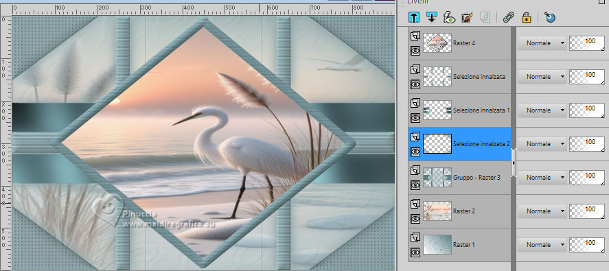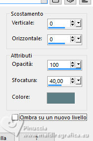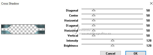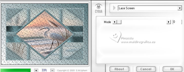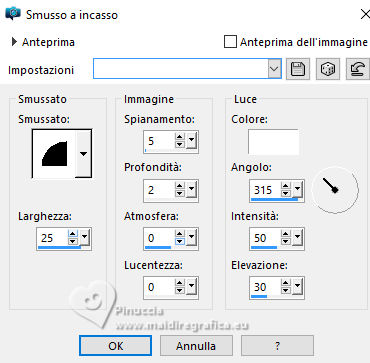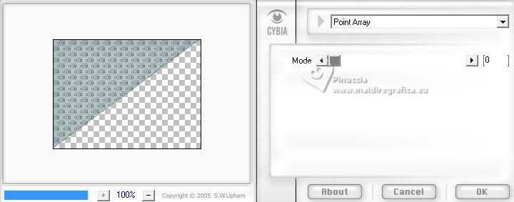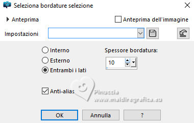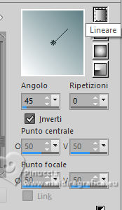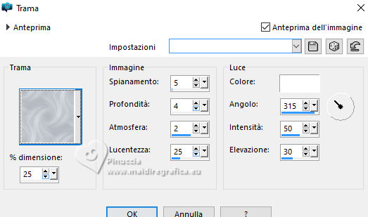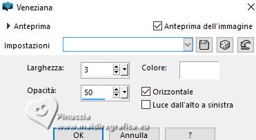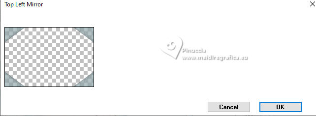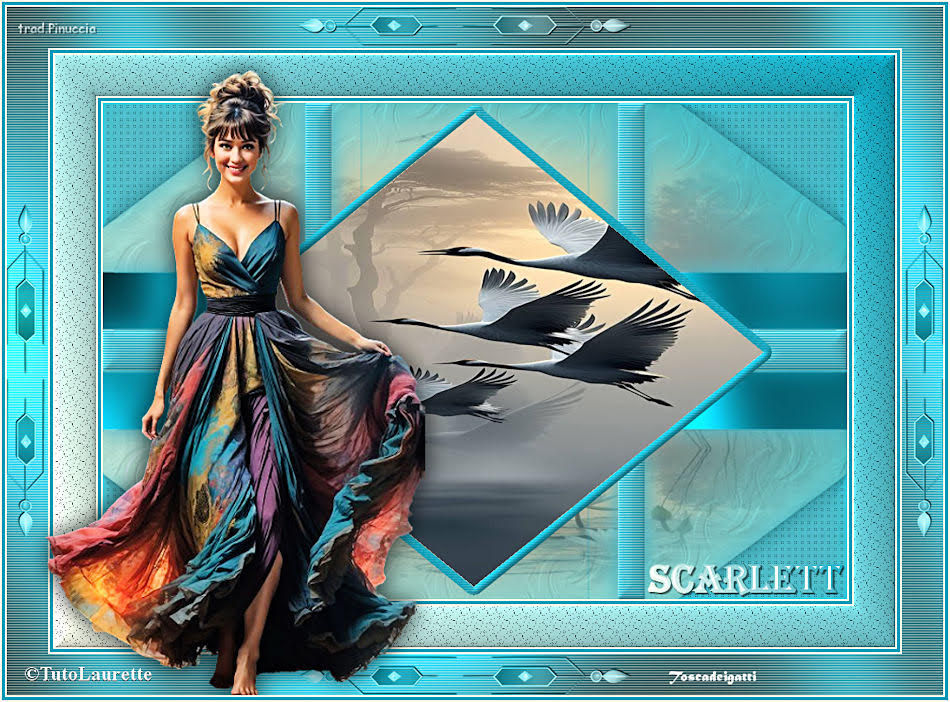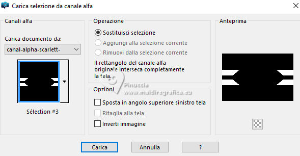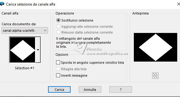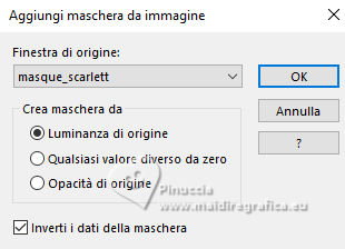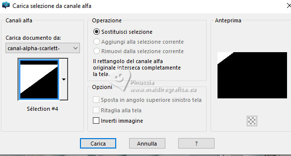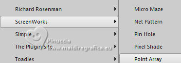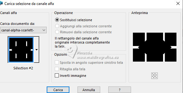 qui puoi trovare qualche risposta ai tuoi dubbi. Se l'argomento che ti interessa non è presente, ti prego di segnalarmelo. Questo tutorial è stato scritto con PSP2020 e tradotto con PSPX9, ma può essere realizzato anche con le altre versioni di PSP. Dalla versione X4, il comando Immagine>Rifletti è stato sostituito con Immagine>Capovolgi in orizzontale, e il comando Immagine>Capovolgi con Immagine>Capovolgi in verticale. Nelle versioni X5 e X6, le funzioni sono state migliorate rendendo disponibile il menu Oggetti. Con la nuova versione X7, sono tornati Rifletti>Capovolgi, ma con nuove varianti. Vedi la scheda sull'argomento qui Occorrente: ![]() Materiale di Laurette. L'autrice prega di non condividere in rete i suoi tubes. (in questa pagina trovi i links ai siti dei creatori di tubes) ![]() in caso di dubbi, ricorda di consultare la mia sezione filtri qui Filters Unlimited 2.0 qui Graphics Plus - Cross Shadow qui Cybia Screenworks - Point Array, Lace Screen qui Simple - Top Left Mirror qui I filtri Graphics Plus, Cybia Screenworks e Simple si possono usare da soli o importati in Filters Unlimited (come fare vedi qui) Se un filtro fornito appare con questa icona ![]() non esitare a cambiare modalità di miscelatura e opacità secondo i colori utilizzati. Nelle ultime versioni di PSP non c'è il gradiente di primo piano/sfondo (Corel_06_029) Puoi usare i gradienti delle versioni precedenti. Trovi qui i gradienti Corel X. ![]() Metti la trama scarlett nella cartella Trame. Apri la maschera in PSP e minimizzala con il resto del materiale. Imposta il colore di primo piano con #5d7e84, e il colore di sfondo con il colore bianco ![]() Passa il colore di primo piano a Gradiente di primo piano/sfondo, stile Radiale. ![]() 1. Apri canal-alpha-Scarlett. Finestra>Duplica o sulla tastiera maiuscola+D per fare una copia. ![]() Chiudi l'originale. La copia, che sarà la base del tuo lavoro, non è vuota, ma contiene le selezioni salvate sul canale alfa. se hai problemi con il canale alfa, apri una nuova immagine trasparente 900 x 600 pixels, e usa le selezioni da disco Riempi l'immagine trasparente con il gradiente.Effetti>Effetti di trama>Trama - seleziona la trama Scarlett ![]() 2. Livelli>Nuovo livello raster (raster 2). Selezione>Seleziona tutto. Apri il tube paysage n.1 ![]() Modifica>Copia. Torna al tuo lavoro e vai a Modifica>Incolla nella selezione. Livelli>Duplica. Livelli>Unisci>Unisci giù. Selezione>Deseleziona. 3. Livelli>Nuovo livello raster. Passa il colore di primo piano a Colore. Riempi il livello con il colore di primo piano.Livelli>Nuovo livello maschera>Da immagine. Apri il menu sotto la finestra di origine e vedrai la lista dei files aperti. Seleziona la maschera masque_scarlett ![]() Effetti>Effetti di bordo>Aumenta. Livelli>Unisci>Unisci gruppo. Effetti>Effetti 3D>Sfalsa ombra, colore bianco. ![]() 4. Rimani sul livello superiore, Gruppo-Raster 3. ![]() Selezione>Carica/Salva selezione>Carica selezione da canale alfa. La selezione Sélection #1 è subito disponibile. Devi soltanto cliccare Carica. ![]() Selezione>Modifica>Seleziona bordature selezione. ![]() Livelli>Nuovo livello raster, Raster 3. Riempi con il colore scuro di primo piano.Effetti>Effetti di trama>Veneziana - colore bianco ![]() Selezione>Inverti. Effetti>Effetti 3D>Sfalsa ombra, colore di primo piano. ![]() Selezione>Deseleziona. Effetti>Effetti 3D>Smusso a incasso ![]() 5. Rimani sul livello superiore, Raster 3. Attiva lo strumento Bacchetta magica ![]() e clicca al centro della quadro per selezionarlo. Livelli>Nuovo livello raster, Raster 4. Apri il tube paysage n.2 ![]() Modifica>Copia. Torna al tuo lavoro e vai a Modifica>Incolla nella selezione. Livelli>Disponi>Sposta giù, sotto il livello Raster 3. Attiva nuovamente il livello superiore. Livelli>Unisci>Unisci giù. Selezione>Deseleziona. 6. Attiva il livello Gruppo-Raster 3. ![]() Selezione>Carica/Salva selezione>Carica selezione da canale alfa. Apri il menu delle selezioni e carica la selezione Sélection #2 ![]() Selezione>Innalza selezione a livello. Effetti>Effetti di trama>Veneziana, con i settaggi precedenti. Effetti>Effetti 3D>Smusso a incasso, con i settaggi precedenti. Effetti>Effetti 3D>Sfalsa ombra, colore di primo piano. ![]() Selezione>Deseleziona. 7. Attiva nuovamente il livello Groupe-Raster 3. Selezione>Carica/Salva selezione>Carica selezione da canale alfa. Apri il menu delle selezioni e carica la selezione Sélection 3/Scarlett ![]() Selezione>Innalza selezione a livello. Effetti>Plugins>Graphics Plus - Cross shadow, con i settaggi standard. ![]() Effetti>Effetti 3D>Sfalsa ombra, con i settaggi precedenti. Selezione>Deseleziona. 8. Attiva nuovamente il livello Groupe-Raster 3. ![]() Selezione>Carica/Salva selezione>Carica selezione da canale alfa. Apri il menu delle selezioni e carica la selezione Sélection 4/Scarlett ![]() Selezione>Innalza selezione a livello. Effetti>Plugins>Screenworks - Point Array Questa versione del filtro lavora senza finestra: ![]() Se usi la versione completa (il risultato ovviamente non cambia) Effetti>Plugins>Cybia - Screenworks - Point Array ![]() Effetti>Effetti 3D>Smusso a incasso, con i settaggi precedenti. Selezione>Deseleziona. Effetti>Plugins>Simple - Top Left Mirror. ![]() Effetti>Effetti 3D>Sfalsa ombra, con i settaggi precedenti. La tag e i livelli ![]() Calques>Fusionner>Tous. 9. Immagine>Aggiungi bordatura, 2 pixels, simmetriche, colore bianco. Immagine>Aggiungi bordatura, 4 pixels, simmetriche, colore di primo piano. Immagine>Aggiungi bordatura, 2 pixels, simmetriche, colore bianco. 10. Selezione>Seleziona tutto. Immagine>Aggiungi bordatura, 50 pixels, simmetriche, colore bianco. Selezione>Inverti. Passa nuovamente il colore di primo piano al gradiente iniziale. ![]() Riempi la selezione con il gradiente.Effetti>Plugins>Screenworks - Lace Screen. ![]() Effetti>Effetti 3D>Smusso a incasso, con i settaggi precedenti. Selezione>Deseleziona. 11. Immagine>Aggiungi bordatura, 2 pixels, simmetrich