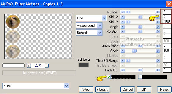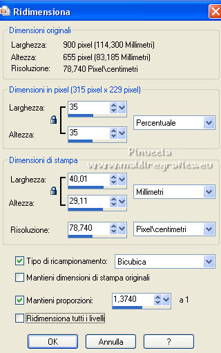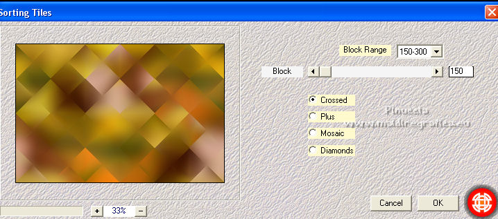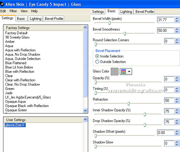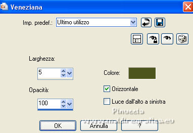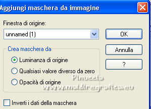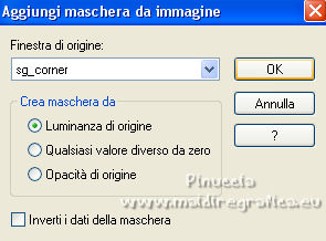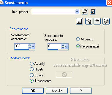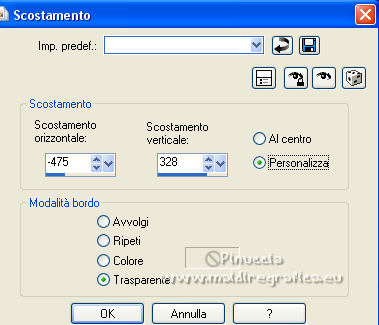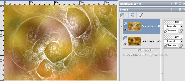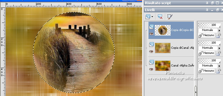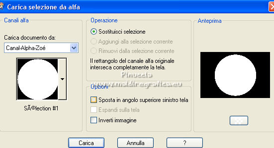qui puoi trovare qualche risposta ai tuoi dubbi. Se l'argomento che ti interessa non è presente, ti prego di segnalarmelo. Questo tutorial è stato scritto con PSP2020 e tradotto con CorelX, ma può essere realizzato anche con le altre versioni di PSP. Dalla versione X4, il comando Immagine>Rifletti è stato sostituito con Immagine>Capovolgi in orizzontale, e il comando Immagine>Capovolgi con Immagine>Capovolgi in verticale. Nelle versioni X5 e X6, le funzioni sono state migliorate rendendo disponibile il menu Oggetti. Con la nuova versione X7, sono tornati Rifletti>Capovolgi, ma con nuove varianti. Vedi la scheda sull'argomento qui Occorrente: Materiale qui L'autrice prega di non condividere in rete i suoi tubes. (in questa pagina trovi i links ai siti dei creatori di tubes) Filtri in caso di dubbi, ricorda di consultare la mia sezione filtri qui Mehdi - Sorting Tiles, Weaver qui Alien Skin Eye Candy 5 Impact - Glass qui Mura's Meister - Copies qui AP 01 Innovations - Lines SilverLining qui ![]() non esitare a cambiare modalità di miscelatura e opacità secondo i colori utilizzati. Metti il preset Cliccando sul file una o due volte (a seconda delle tue impostazioni), automaticamente il preset si installerà nella cartella corretta. perchè uno o due clic vedi qui Apri le maschere in PSP e minimizzale con il resto del materiale. Imposta il colore di primo piano con il colore bianco #ffffff. 1. Apri Alpha-Zoe. Finestra>Duplica o sulla tastiera maiuscola+D per fare una copia. ![]() Chiudi l'originale. La copia, che sarà la base del tuo lavoro, non è vuota, ma contiene le selezioni salvate sul canale alfa. 2. Selezione>Seleziona tutto. Apri l'immagine Fond-Zoé e vai a Modifica>Copia. Torna al tuo lavoro e vai a Modifica>Incolla nella selezione. Selezione>Deseleziona. Livelli>Duplica. Effetti>Plugins>Mehdi - Sorting Tiles. ![]() Effetti>Effetti di riflesso>Specchio rotante. ![]() Effetti>Effetti di bordo>Aumenta. Regola>Sfocatura>Sfocatura gaussiana - raggio 30. ![]() 3. Livelli>Nuovo livello raster, Raster 1. Riempi con il colore bianco.Livelli>Nuovo livello maschera>Da immagine. Apri il menu sotto la finestra di origine e vedrai la lista dei files aperti. Seleziona la maschera unnamed(1). ![]() Livelli>Unisci>Unisci gruppo. Livelli>Unisci>Unisci giù. ![]() 4. Effetti>Plugins>Mehdi - Weaver. ![]() Livelli>Duplica. Effetti>Effetti geometrici>Cerchio. ![]() Immagine>Ridimensiona, al 90%, tutti i livelli non selezionato. ![]() 5. Selezione>Carica/Salva selezione>Carica selezione da canale alfa. La selezione #1 è subito disponibile. Devi soltanto cliccare Carica. ![]() Apri il tube del paesaggio e vai a Modifica>Copia. Torna al tuo lavoro e vai a Modifica>Incolla come nuovo livello. Posiziona il tube sulla selezione.Selezione>Inverti. Premi sulla tastiera il tasto CANC ![]() Selezione>Inverti. Livelli>Unisci>Unisci giù. Mantieni selezionato. ![]() 6. Livelli>Nuovo livello raster. Riempi con il colore bianco.Selezione>Modifica>Contrai - 5 pixels. ![]() Premi sulla tastiera il tasto CANC ![]() 7. Livelli>Unisci>Unisci giù. Effetti>Plugins>Alien Skin Eye Candy 5 Impact - Glass. Seleziona il preset Zoe-1 e ok. ![]() Selezione>Deseleziona. 8. Livelli>Duplica. Immagine>Ridimensiona, al 35%, tutti i livelli non selezionato. ![]() Effetti>Effetti di immagine>Scostamento. ![]() 9. Effetti>Plugins>Mura's Meister - Copies. ![]() Selezione>Carica/Salva selezione>Carica selezione da canale alfa. Apri il menu delle selezioni e carica la selezione #2. ![]() Premi sulla tastiera il tasto CANc. Selezione>Deseleziona. 10. Attiva il livello della prima Copia di Canal-alpha Zoe. ![]() Livelli>Nuovo livello raster. Riempi il livello con il colore bianco.Livelli>Nuovo livello maschera>Da immagine. Apri il menu sotto la finestra di origine e seleziona la maschera sg_corner. ![]() Livelli>Duplica - 2 volte. Livelli>Unisci>Unisci gruppo. 11. Effetti>Plugins>AP 01 Innovations - Lines SilverLining. ![]() Effetti>Effetti 3D>Sfalsa ombra, colore nero. ![]() Chiudi il livello inferiore. Livelli>Unisci>Unisci visibile. Riapri il livello chiuso e rimani posizionato sul livello superiore. ![]() 12. Apri il tube décoration e vai a Modifica>Copia. Torna al tuo lavoro e vai a Modifica>Incolla come nuovo livello. Effetti>Effetti di immagine>Scostamento. ![]() 13. Apri il tube titre e vai a Modifica>Copia. Torna al tuo lavoro e vai a Modifica>Incolla come nuovo livello. Effetti>Effetti di immagine>Scostamento. ![]() 14. Attiva il livello inferiore. Modifica>Copia. Per i bordi: imposta il colore di primo piano con #e0bd04, e il colore di sfondo con #f07b0c. ![]() Immagine>Aggiungi bordatura, 2 pixels, simmetriche, colore di sfondo #f07b0c. Immagine>Aggiungi bordatura, 5 pixels, simmetriche, colore bianco. Immagine>Aggiungi bordatura, 1 pixel, simmetriche, colore di primo piano #e0bd04. Selezione>Seleziona tutto. Immagine>Aggiungi bordatura, 20 pixels, simmetriche, colore bianco. 15. Selezione>Inverti. Modifica>Incolla nella selezione. Effetti>Plugins>AP 01 Innovations - Lines SilverLining, con i settaggi precedenti. Selezione>Inverti. Effetti>Effetti 3D>Sfalsa ombra, colore nero. ![]() Selezione>Deseleziona. 16. Immagine>Aggiungi bordatura, 2 pixels, simmetriche, colore di sfondo #f07b0c. Immagine>Aggiungi bordatura, 5 pixels, simmetriche, colore bianco. Immagine>Aggiungi bordatura, 2 pixels, simmetriche, colore di primo piano #e0bd04. Selezione>Seleziona tutto. Immagine>Aggiungi bordatura, 50 pixels, simmetriche, colore bianco. Selezione>Inverti. Modifica>Incolla nella selezione (è sempre in memoria lo sfondo copiato al punto 14). Effetti>Effetti di trama>Veneziana, colore #4d551d. ![]() Selezione>Inverti. Effetti>Effetti 3D>Sfalsa ombra, colore nero. ![]() Selezione>Deseleziona. 17. Immagine>Aggiungi bordatura, 2 pixels, simmetriche, colore di sfondo #f07b0c. Immagine>Aggiungi bordatura, 5 pixels, simmetriche, colore bianco. Apri il tube coin e vai a Modifica>Copia. Torna al tuo lavoro e vai a Modifica>Incolla come nuov
