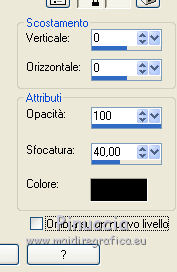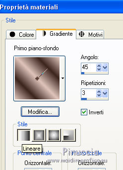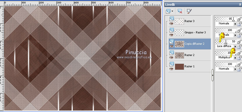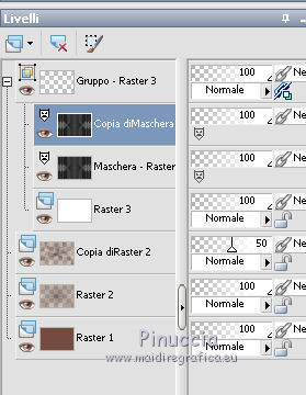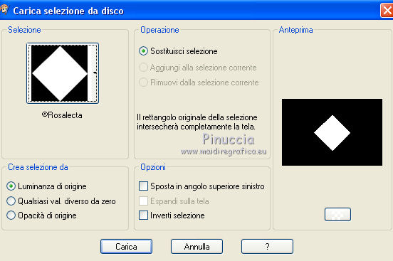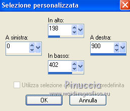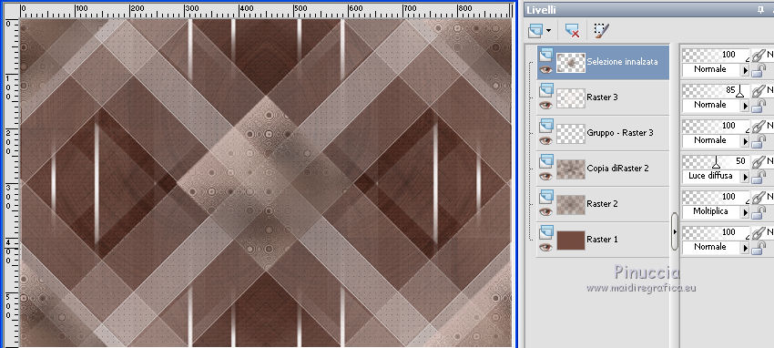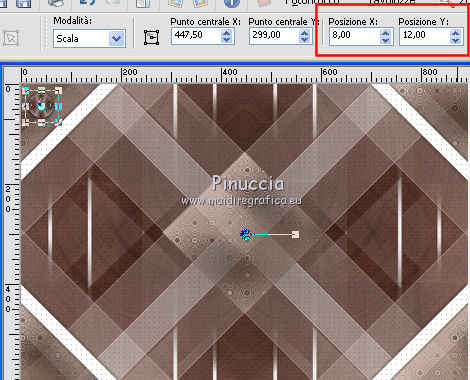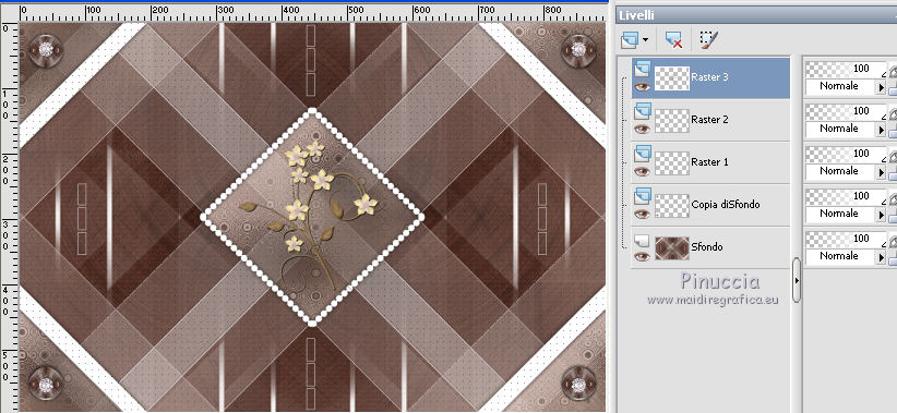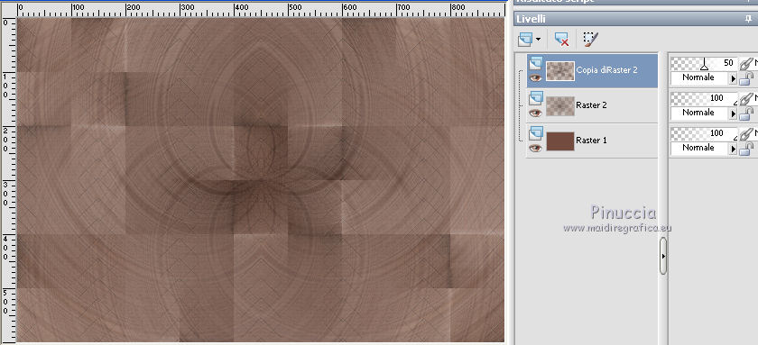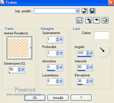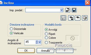 qui puoi trovare qualche risposta ai tuoi dubbi. Se l'argomento che ti interessa non è presente, ti prego di segnalarmelo. Questo tutorial è stato scritto con PSP 8 e tradotto con CorelX e CorelX3, ma può essere realizzato anche con le altre versioni di PSP. Dalla versione X4, il comando Immagine>Rifletti è stato sostituito con Immagine>Capovolgi in orizzontale, e il comando Immagine>Capovolgi con Immagine>Capovolgi in verticale. Nelle versioni X5 e X6, le funzioni sono state migliorate rendendo disponibile il menu Oggetti. Con la nuova versione X7, sono tornati Rifletti>Capovolgi, ma con nuove varianti. Vedi la scheda sull'argomento qui traduzione in inglese/english translation qui/hereLe vostre versioni qui Occorrente: Materiale qui Per il tube grazie Babette. (in questa pagina trovi i links ai siti dei creatori di tubes) Filtri in caso di dubbi, ricorda di consultare la mia sezione filtri qui Filter Factory Gallery J - Twister qui &<Bkg Designer sf10III> - Road Kill (da importare in Unlimited) qui Mehdi - Sorting Tile qui Toadies - What are you qui AP Lines - Lines SilverLining qui Funhouse - Cirquelate qui Alien Skin Eye Candy 5 Impact - Glass qui Simple - Top Left Mirror qui VM Toolbox - Instant Tile qui Filters Unlimited 2.0 qui I filtri Factory Gallery, Toadies, Funhouse, Simple e VM Toolbox si possono usare da soli o importati in Filters Unlimited (come fare vedi qui) Se un filtro fornito appare con questa icona ![]() non esitare a cambiare modalità di miscelatura e opacità secondo i colori utilizzati. Nelle ultime versioni di PSP non c'è il gradiente di primo piano/sfondo (Corel_06_029) Puoi usare i gradienti delle versioni precedenti. Trovi qui i gradienti Corel X. Metti il preset Emboss 3 nella cartella Impostazioni predefinite. Metti le selezioni nella cartella Selezioni. Metti la trama nella cartella Trama. Apri la maschera in PSP e minimizzala con il resto del materiale. Colori utilizzati ![]() 1. Apri una nuova immagine trasparente 900 x 600 pixels. Imposta il colore di primo piano con #754d42, e il colore di sfondo con #dec4bb. ![]() Riempi l'immagine trasparente con il colore di primo piano #754d42.Effetti>Effetti di trama>Trama - seleziona la trama Texture Rosalecta ![]() 2. Livelli>Nuovo livello raster. Selezione>Seleziona tutto. Apri il tube di Babette, cancella la firma, e vai a Modifica>Copia. Minimizza il tube. Torna al tuo lavoro e vai a Modifica>Incolla come nuovo livello. Selezione>Deseleziona. Effetti>Effetti di immagine>Motivo unico. ![]() Regola>Sfocatura>Fuoco diffuso, con i settaggi standard. ![]() Regola>Sfocatura>Sfocatura radiale. ![]() Effetti>Effetti di bordo>Aumenta di più. 3. Effetti>Plugins>Filters Unlimited 2.0 - Filter Factory Gallery J - Twister, con i settaggi standard. ![]() Effetti>Plugins>Filters Unlimited 2.0 - &< Bkg Designers sf10II> - Road Kill, con i settaggi standard. ![]() 4. Effetti>Effetti di riflesso>Specchio rotante. ![]() Livelli>Duplica. Immagine>Capovolgi. Abbassa l'opacità di questo livello al 50%. Livelli>Unisci>Unisci giù. 5. Livelli>Duplica. Effetti>Plugins>Mehdi - Sorting Tiles. ![]() Abbassa l'opacità di questo livello al 50%. ![]() 6. Imposta il colore di primo piano con il colore bianco. ![]() Livelli>Nuovo livello raster. Riempi il livello con il colore bianco.Livelli>Nuovo livello maschera>Da immagine. Apri il menu sotto la finestra di origine e vedrai la lista dei files aperti. Seleziona la maschera 26e2e630. ![]() Livelli>Duplica. ![]() Regola>Messa a fuoco>Metti a fuoco. Livelli>Unisci>Unisci gruppo. Effetti>Effetti di immagine>Motivo unico, con i settaggi standard. ![]() 7. Livelli>Nuovo livello raster. Attiva lo strumento Selezione ![]() (non importa il tipo di selezione impostato, perchè con la selezione personalizzata si ottiene sempre un rettangolo) clicca sull'icona Selezione personalizzata ![]() e imposta i seguenti settaggi. ![]() Riempi il livello con il colore bianco.Selezione>Modifica>Contrai - 2 pixels. ![]() Premi sulla tastiera il tasto CANC ![]() Abbassa l'opacità dello strumento Riempimento a 50. ![]() Riempi il livello con il colore bianco.Selezione>Deseleziona. Non dimenticare di riportare l'opacità a 100 ![]() 8. Effetti>Plugins>Toadies - What are you. ![]() Effetti>Filtro definito dall'utente - seleziona il preset Emboss 3 e ok. ![]() Effetti>Effetti geometrici>Inclina. ![]() 9. Livelli>Duplica. Immagine>Rifletti. Livelli>Unisci>Unisci giù. Abbassa l'opacità di questo livello all'85%. Effetti>Plugins>AP Lines - Lines SilverLining ![]() Cambia la modalità di miscelatura del livello Raster 2 in Moltiplica. Cambia la modalità di miscelatura del livello Copia di Raster 2 in Luce diffusa. ![]() Rimani posizionato sul livello Copia di Raster 2. Selezione>Carica/Salva selezione>Carica selezione da disco. Cerca e carica la selezione ©Rosalecta. ![]() Selezione>Trasforma la selezione a livello. Selezione>Deseleziona. 10. Livelli>Disponi>Porta in alto. Effetti>Plugins>Funhouse - Cirquelate, con i settaggi standard. ![]() Effetti>Effetti di immagine>Motivo unico. ![]() ![]() Livelli>Unisci>Unisci tutto. Selezione>Seleziona tutto. Selezione>Modifica>Contrai - 3 pixels. ![]() Immagine>Ritaglia la selezione. 11. Livelli>Nuovo livello raster. Selezione>Carica/Salva selezione>Carica selezione da disco. Cerca e carica la selezione ©Rosalecta2. ![]() Riempi la selezione con il colore bianco.Effetti>Plugins>AP Lines - Lines SilverLining, con i settaggi precedenti. Selezione>Deseleziona. Effetti>Effetti 3D>Sfalsa ombra, colore nero. ![]() Livelli>Unisci>Unisci giù. 12. Livelli>Duplica. Effetti>Effetti geometrici>Cerchio. ![]() Immagine>Ridimensiona, 3 volte al 45%, tutti i livelli non selezionato. ![]() Effetti>Plugins>Alien Skin Eye Candy 5 Impact - Glass. Seleziona il preset Clear et ok. ![]() Sulla tastiera premi il tasto K per attivare lo strumento Puntatore ![]() e imposta Posizione X: 8,00 e Posizione Y: 12,00. ![]() Tasto M per deselezionare lo strumento. Apri il tube Perle e vai a Modifi