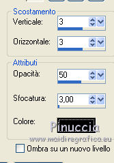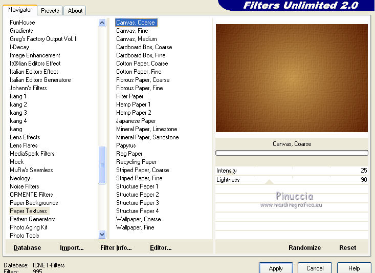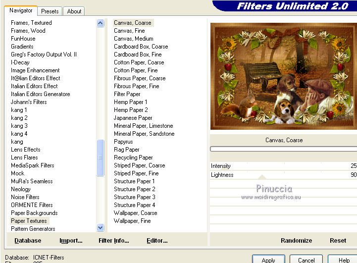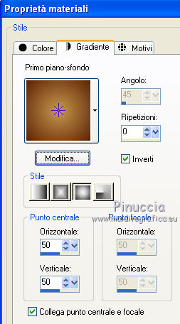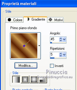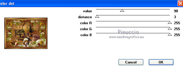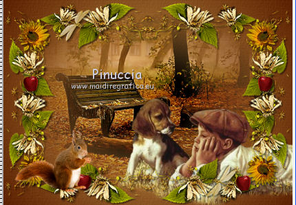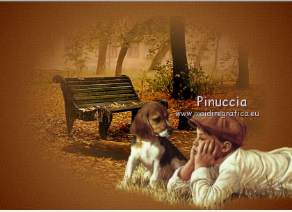 1. Apri una nuova immagine trasparente 700 x 500 pixels. 2. Imposta il colore di primo piano con #5d2204, e il colore di sfondo con #c7984e. Passa il colore di primo piano a Gradiente, con i seguenti settaggi. ![]() Riempi l'immagine trasparente con il gradiente.3. Effetti>Plugins>Filters Unlimited 2.0 - Paper Texture - Canvas,Coarse: ![]() 4. Apri il tube LD_banc_automne e vai a Modifica>Copia. Torna al tuo lavoro e vai a Modifica>Incolla come nuovo livello. 5. Apri il tube Kid_and_dog_CibiBijoux e vai a Modifica>Copia. Torna al tuo lavoro e vai a Modifica>Incolla come nuovo livello. Spostalo in basso a destra.![]() 6. Apri il tube flower clusters_RR_EK e vai a Modifica>Copia. Torna al tuo lavoro e vai a Modifica>Incolla come nuovo livello. 7. Effetti>Effetti 3D>Sfalsa ombra, con il colore nero. ![]() 8. Apri il tube deco_chipie_lea e vai a Modifica>Copia. Torna al tuo lavoro e vai a Modifica>Incolla come nuovo livello. 9. Effetti>Effetti 3D>sfalsa ombra, con i settaggi precedenti. ![]() 10. Apri il tube Ecureuil_CibiBijoux e vai a Modifica>Copia. Torna al tuo lavoro e vai a Modifica>Incolla come nuovo livello. Spostalo nell'angolo in basso a sinistra.![]() 11. Apri il tube LD_puppy e vai a Modifica>Copia. Torna al tuo lavoro e vai a Modifica>Incolla come nuovo livello. Spostalo in basso al centro.12. Apri il tube DS_Autumn Delight_Bow4 e vai a Modifica>Copia. Torna al tuo lavoro e vai a Modifica>Incolla come nuovo livello. Spostalo in alto al centro.13. Effetti>Effetti 3D>Sfalsa ombra, con il colore nero. ![]() 14. Livelli>Unisci>Unisci tutto. 15. Immagine>Aggiungi bordatura, 2 pixels, simmetriche, con il colore chiaro. Immagine>Aggiungi bordatura, 2 pixels, simmetriche, con il colore scuro. Immagine>Aggiungi bordatura, 2 pixels, simmetriche, con il colore chiaro. Immagine>Aggiungi bordatura, 15 pixels, simmetriche, con il colore scuro. 16. Seleziona il bordo da 15 pixels, con la bacchetta magica , sfumatura e tolleranza 0.Cambia i settaggi del gradiente. ![]() Riempi la selezione con il gradiente.17. Effetti>Plugins>Filters Unlimited 2.0 - Paper Texture - Canvas,Coarse. ![]() 18. Effetti>Plugins>Penta.com - Color dot: ![]() 19. Effetti>Effetti 3D>Smusso a incasso. ![]() 20. Immagine>Aggiungi bordatura, 2 pixels, simmetriche, con il colore chiaro. Immagine>Aggiungi bordatura, 2 pixels, simmetriche, con il colore scuro. Immagine>Aggiungi bordatura, 2 pixels, simmetriche, con il colore chiaro. 21. Apr il tube CJ_Gold Corner e vai a Modifica>Copia. Torna al tuo lavoro e vai a Modifica>Incolla come nuovo livello. Spostalo nell'angolo in alto a sinistra.22. Effetti>Plugins>Simple - Top Left mirror. 23. Livelli>Unisci>Unisci tutto appiattisci. Firma il tuo lavoro e salva in formato jpg. Se hai problemi o dubbi, o trovi un link non funzionante, o anche soltanto per un saluto, scrivimi. 27 Settembre 2011 |