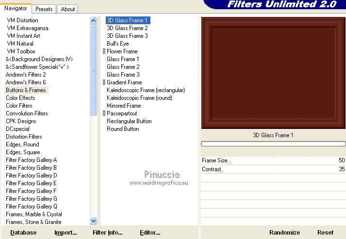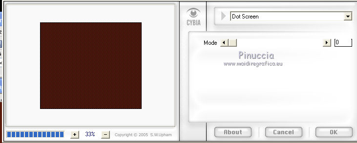 1. Apri una nuova immagine trasparente 620 x 530 pixels. 2. Imposta il colore di primo piano con #5a1b0f, e riempi l'immagine trasparente con questo colore.3. Effetti>Plugins>Cybia - Screenworks: seleziona Dot Screen e ok. ![]() 4. Apri il tube feuilles_automne_lea e vai a Modifica>Copia. Torna al tuo lavoro e vai a Modifica>Incolla come nuovo livello. Sposta il tube a sinistra.5. Livelli>Duplica. Immagine>Rifletti. 6. Livelli>Duplica. Immagine>Ruota per gradi - 90 gradi a sinistra. ![]() Sposta queste foglie in alto.7. Livelli>Duplica. Immagine>Capovolgi. 8. Chiudi il livello di sfondo e vai Livelli>Unisci>Unisci visibile. Riapri il livello di sfondo e rimani posizionato sul livello Uniti. 9. Livelli>Duplica. 10. Immagine>Ridimensiona, al 115%, tutti i livelli non selezionato. ![]() 11. Livelli>Disponi>Sposta giù. Cambia la modalità di miscelatura di questo livello in Dissolvi e abbassa l'opacità al 2%. Attiva nuovamente il livello superiore con la cornice di foglie. 12. Effetti>Effetti 3D>Sfalsa ombra, con il colore nero. ![]() 13. Apri una nuova immagine trasparente 480 x 375 pixels, e riempila con il colore di primo piano #5a1b0f.14. Effetti>Plugins>Filters Unlimited - Buttons & Frame - 3DGlass Frame 1. ![]() 15. Attiva lo strumento Bacchetta magica , sfumatura e tolleranza 0,e clicca al centro della cornice per selezionarla. Premi sulla tastiera il tasto CANC. Selezione>Inverti. 16. Effetti>Plugins>Cybia - Screenwork, con i settaggi precedenti. ![]() Selezione>Deseleziona. 17. Modifica>Copia. Torna al tuo lavoro e vai a Modifica>Incolla come nuovo livello. 18. Apri il tube cal_guis_foret e vai a Modifica>Copia. Torna al tuo lavoro e vai a Modifica>Incolla come nuovo livello. 19. Livelli>Disponi>Sposta giù. 20. Attiva il livello superiore. Apri il tube VC_element25 e vai a Modifica>Copia. Torna al tuo lavoro e vai a Modifica>Incolla come nuovo livello. Spostalo nell'angolo in alto a sinistra.21. Effetti>Plugins>Simple - Top Left Mirror. 22. Apri il tube fee_automne e vai a Modifica>Copia. Torna al tuo lavoro e vai a Modifica>Incolla come nuovo livello. Spostalo a sinistra.23. Apri il tube VC_element26 e vai a Modifica>Copia. Torna al tuo lavoro e vai a Modifica>Incolla come nuovo livello. Spostalo in alto sul quadro.24. Apri il tube "texte" e vai a Modifica>Incolla come nuovo livello. Spostalo al centro del quadro.25. Livelli>Unisci>Unisci tutto. 26. Immagine>Aggiungi bordatura, 1 pixel, simmetriche, con il colore #c48c2c. Immagine>Aggiungi bordatura, 1 pixel, simmetriche, con il colore #5a1b0f. Immagine>Aggiungi bordatura, 1 pixel, simmetriche, con il colore #c48c2c. 27. Selezione>Seleziona tutto. Selezione>Modifica>Contrai - 12 pixels. Selezione>Inverti. 28. Effetti>Effetti 3D>Smusso a incasso. ![]() 29. Aggiungi il tuo nome e/o il tuo watermark su un nuovo livello. 30. Livelli>Unisci>Unisci tutto e salva in formato jpg. Se hai problemi o dubbi, o trovi un link non funzionante, o anche soltanto per un saluto, scrivimi.