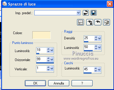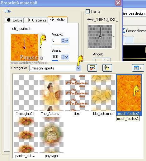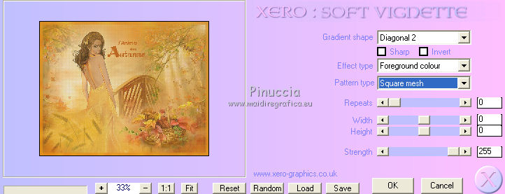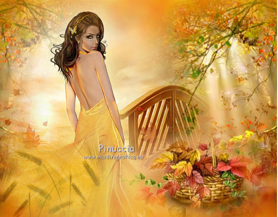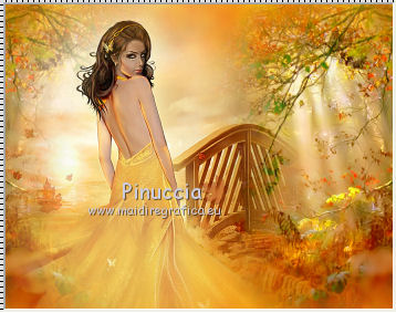 Apri tutto il materiale in PSP, compreso il motivo motif_feuilles2. 1. Apri una nuova immagine trasparente 700 x 550 pixels. Passa il colore di primo piano a Motivi. Apri il menu e tra "immagini aperte" troverai il motivo feuilles. Selezionalo con i seguenti settaggi. ![]() Riempi l'immagine trasparente con questo motivo.2. Regola>Sfocatura>Sfocatura gaussiana - raggio 9. ![]() 3. Apri il tube paysage e vai a Modifica>Copia. Torna al tuo lavoro e vai a Modifica>Incolla come nuovo livello. Spostalo a destra.4. Livelli>Duplica. Immagine>Rifletti. 5. Chiudi il livello inferiore. Livelli>Unisci>Unisci visibile. 6. Livelli>Duplica. Livelli>Unisci>Unisci visibile. 7. Riapri il livello inferiore e rimani posizionato sul livello Uniti. 8. Apri il tube The_Autumn_Soul e vai a Modifica>Copia. Torna al tuo lavoro e vai a Modifica>Incolla come nuovo livello. Spostalo a sinistra.![]() 9. Apri il tube ble_automne e vai a Modifica>Copia. Torna al tuo lavoro e vai a Modifica>Incolla come nuovo livello. Spostalo in basso a sinistra.10. Apri il tube panier_automne e vai a Modifica>Copia. Torna al tuo lavoro e vai a Modifica>Incolla come nuovo livello. Spostalo in basso a destra.![]() 11. Livelli>Unisci>Unisci tutto. 12. Effetti>Effetti di illuminazione>Sprazzo di luce - colore #FCF0CA. ![]() 13. Apri il file con il testo e vai a Modifica>Copia. Torna al tuo lavoro e vai a Modifica>Incolla come nuovo livello. Se preferisci, puoi scrivere un tuo testo. Sposta il testo sul ponte.14. Livelli>Unisci>Unisci tutto. 15. Immagine>Aggiungi bordatura, 12 pixels, simmetriche, con un colore qualsiasi, purchè non presente nell'immagine. Seleziona questo bordo con la bacchetta magica , sfumatura e tolleranza 0,e riempilo con il motivo di primo piano.16. Regola>Sfocatura>Sfocatura gaussiana - raggio 9. ![]() 17. Effetti>Plugins>Xero - Soft Vignette. ![]() 18. Effetti>Effetti 3D>Smusso a incasso. ![]() Selezione>Deseleziona. 19. Firma il tuo lavoro e salva in formato jpg. Se hai problemi o dubbi, o trovi un link non funzionante, o anche soltanto per un saluto, scrivimi. 27 Settembre 2011 |