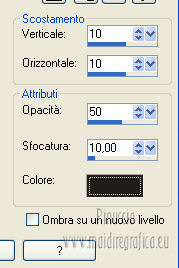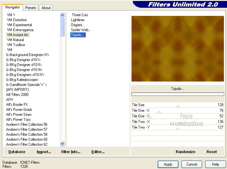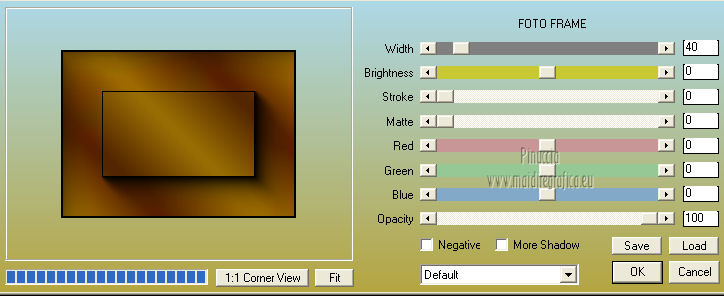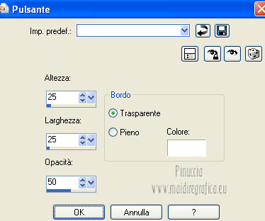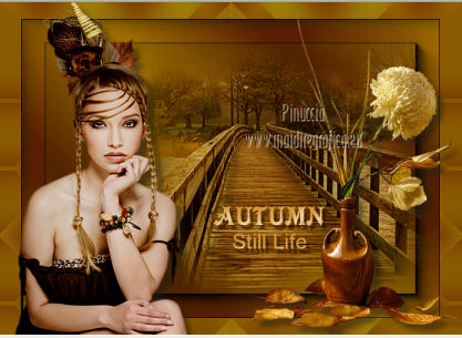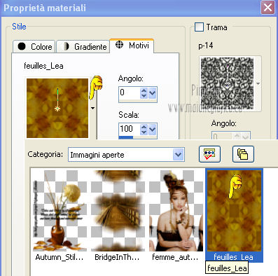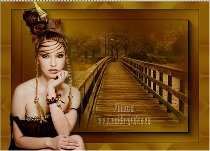 1. Apri una nuova immagine trasparente 700 x 500 pixels. 2. Passa il colore di primo piano a Motivi e cerca, nella categoria Immagine aperte, feuilles_Leadans. Imposta il motivo con i seguenti settaggi. ![]() Riempi l'immagine trasparente con questo motivo.3. Regola>Sfocatura>Sfocatura gaussiana - raggio 15. ![]() 4. Effetti>Plugins>VM Instant Art - Tripolis - 3 volte con i seguenti settaggi. ![]() 5. Imposta il colore di primo piano con #4f2100, e il colore di sfondo con #9b7104. Passa il colore di primo piano a Gradiente, con i seguenti settaggi. ![]() 6. Livelli>Nuovo livello raster. Riempi con il gradiente.7. Regola>Sfocatura>Sfocatura gaussiana - raggio 15. ![]() 8. Effetti>Plugins>AAA Frames - Foto Frame. ![]() 9. Immagine>Ridimensiona, al 90%, tutti i livelli non selezionato. 10. Apri il tube BridgeInTheMist_MistedByGini_11-30-06 e vai a Modifica>Copia. Torna al tuo lavoro e vai a Modifica>Incolla come nuovo livello. Spostalo a destra.11. Apri il tube femme_automne e vai a Modifica>Copia. Torna al tuo lavoro e vai a Modifica>Incolla come nuovo livello. Spostalo a sinistra.![]() 12. Effetti>Effetti 3D>Sfalsa ombra, con il colore nero. ![]() 13. Apri il tube Autumn_StillLife_na_05.09.2008 e vai a Modifica>Copia. Torna al tuo lavoro e vai a Modifica>Incolla come nuovo livello. Spostalo a destra.![]() 14. Effetti>Effetti 3D>Sfalsa ombra, con i settaggi precedenti. 15. Apri il tube wordart_autumn_still_life_Lea e vai a Modifica>Copia. Torna al tuo lavoro e vai a Modifica>Incolla come nuovo livello. Spostalo in basso, sul ponte.16. Livelli>Unisci>Unisci tutto. Immagine>Aggiungi bordatura, 1 pixel, simmetriche, con il colore nero. 17. Effetti>Effetti 3D>Pulsante. ![]() Firma il tuo lavoro e salva in formato jpg. Se hai problemi o dubbi, o trovi un link non funzionante, o anche soltanto per un saluto, scrivimi. 9 Novembre 2012 |