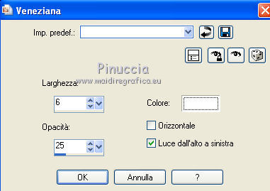qui puoi trovare qualche risposta ai tuoi dubbi. Se l'argomento che ti interessa non č presente, ti prego di segnalarmelo. Per tradurre questo tutorial ho usato PSP X. Questo tutorial č una creazione di ©Lea e non puņ essere copiato su altri siti nč essere offerto per il download. Lo stesso vale per la mia traduzione. Il materiale viene da vari gruppi di condivisione. Il copyright appartiene ai rispettivi autori. Grazie ai creatori dei tubes che mettono a disposizione il loro lavoro in vari gruppi di condivisione. Rispetta il lavoro degli autori, non cambiare il nome dei files e non cancellare il livello del watermark. Occorrente: Materiale qui Apri tutto il materiale in PsP. 1. Apri una nuova immagine trasparente 515 x 400 pixels. 2. Imposta il colore di primo piano con #a9bee8, e riempi l'immagine trasparente con questo colore.3. Effetti>Effetti di trama>Veneziana. ![]() 4. Apri il tube "a-dozi's-photoframe-04" e vai a Modifica>Copia. Torna al tuo lavoro e vai a Modifica>Incolla come nuovo livello. 5. Attiva lo strumento Bacchetta magica , sfumatura e tolleranza 0,e clicca al centro della cornice per selezionarla. 6. Apri l'immagine del bambino e vai a Modifica>Copia. Torna al tuo lavoro e vai a Modifica>Incolla nella selezione. Selezione>Deseleziona. 7. Apri il tube "ruban2" e vai a Modifica>Copia. Torna al tuo lavoro e vai a Modifica>Incolla come nuovo livello. Spostalo in alto lasciando un piccolo spazio (attenzione a non tagliare l'ombra).8. Livelli>Duplica. Immagine>Capovolgi. 9. Apri il tube "ruban1" e vai a Modifica>Copia. Torna al tuo lavoro e vai a Modifica>Incolla come nuovo livello. Spostalo a destra.10. Livelli>Duplica. Immagine>Rifletti. 11. Apri il tube "coins" e vai a Modifica>Copia. Torna al tuo lavoro e vai a Modifica>Incolla come nuovo livello. 12. Apri il tube "boutons" e vai a Modifica>Copia. Torna al tuo lavoro e vai a Modifica>Incolla come nuovo livello. Sposta i bottoni in alto, come nel mio esempio.13. Apri il tube "epingle" e vai a Modifica>Copia. Torna al tuo lavoro e vai a Modifica>Incolla come nuovo livello. Sposta la spilla a destra dei bottoni.14. Apri il tube "peluche" e vai a Modifica>Copia. Torna al tuo lavoro e vai a Modifica>Incolla come nuovo livello. Spostalo in basso a sinistra, come nel mio esempio.15. Livelli>Unisci>Unisci tutto. Firma il tuo lavoro e salva in formato jpg. Se hai problemi o dubbi, o trovi un link non funzionante, o anche soltanto per un saluto, scrivimi.