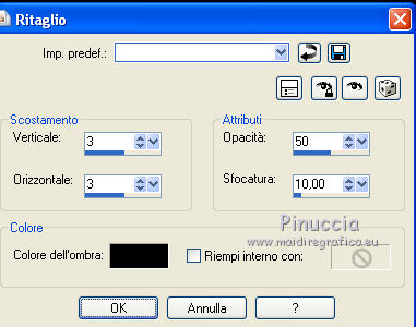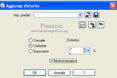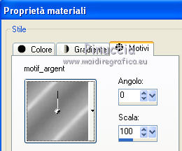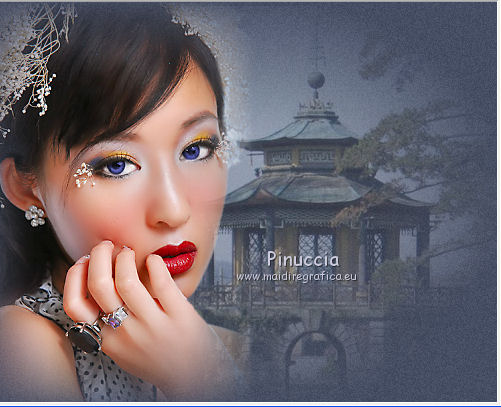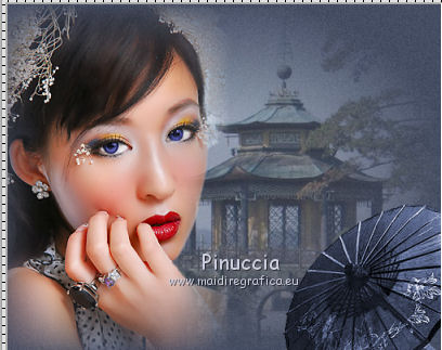 Apri tutto il materiale in PSP. 1. Apri una nuova immagine trasparente 500 x 400 pixels. 1. Imposta il colore di primo piano con #464e64, e riempi l'immagine trasparente con questo colore.2. Regola>Aggiungi/Rimuovi disturbo>Aggiungi disturbo. ![]() 3. Api il tube misted_asia e vai a Modifica>Copia. Torna al tuo lavoro e vai a Modifica>Incolla come nuovo livello. 4. Apri il tube "asia" e vai a Modifica>Copia. Torna al tuo lavoro e vai a Modifica>Incolla come nuovo livello. Spostalo a sinistra.![]() 5. Apri il tube "ombrelle" e vai a Modifica>Copia. Torna al tuo lavoro e vai a Modifica>Incolla come nuovo livello. Spostalo nell'angolo in basso a destra.![]() 6. Livelli>Unisci>Unisci tutto (appiattisci). 7. Passa il colore di primo piano a Motivi e seleziona il motivo argento. ![]() Imposta il colore di sfondo con #5a6072. 8. Selezione>Seleziona tutto. Selezione>Modifica>Contrai - 2 pixels. Selezione>Inverti. Riempi la selezione con il motivo argento.9. Selezione>Inverti. Effetti>Effetti 3D>Ritaglio, con i seguenti settaggi. ![]() Selezione>Deseleziona. 10. Immagine>Aggiungi bordatura, 25 pixels, simmetriche, con il colore di sfondo. Seleziona questo bordo con la bacchetta magica , sfumatura e tolleranza 0,11. Effetti>Plugins>Jeux de lignes>Entrelacement. ![]() Selezione>Deseleziona. 12. Selezione>Seleziona tutto. Selezione>Modifica>Contrai - 2 pixels. Selezione>Inverti. Riempi la selezione con il motivo argento.Selezione>Deseleziona. 13. Immagine>Ridimensiona, all'85%, tutti i livelli selezionato. 14. Apri il tube "coin_asia" e vai a Modifica>Copia. Torna al tuo lavoro e vai a Modifica>Incolla come nuovo livello. Spostalo nell'angolo in alto a sinistra.15. Effetti>Plugins>Simple - Top Left Mirror. 16. Librlli>Unisci>Unisci tutto. Firma il tuo lavoro e salva in formato jpg. Se hai problemi o dubbi, o trovi un link non funzionante, o anche soltanto per un saluto, scrivimi. 27 Giugno 2011 |