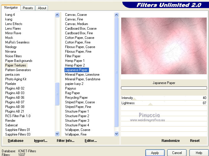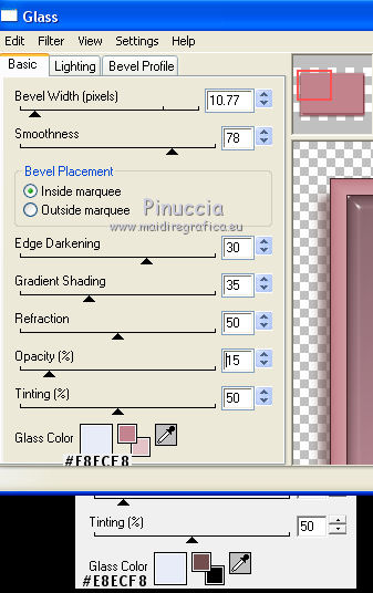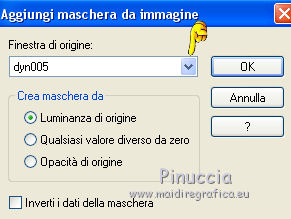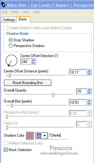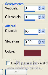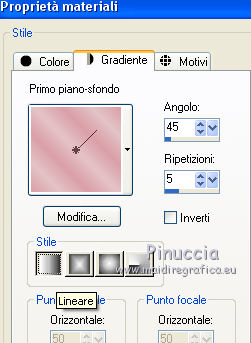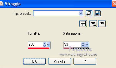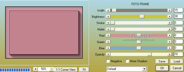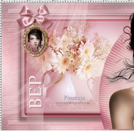 Apri la maschera in PSP e minimizzala con il resto del materiale. 1. Apri una nuova immagine trasparente 750 x 500 pixels. Imposta il colore di primo piano con #da9fa7, e il colore di sfondo con #e3c3c6. Passa il colore di primo piano a Gradiente di primo piano/sfondo, stile Lineare. ![]() Riempi l'immagine trasparente con il gradiente.3. Effetti>Plugins>Graphics Plus - Cross Shadow. ![]() 4. Effetti>Plugins>Filters Unlimited 2.0 - Paper Texture - Japanese Paper. ![]() 5. Livelli>Nuovo livello raster. Imposta il colore di primo piano con f3e5e7, e riempi il livello con questo colore.6. Livelli>Nuovo livello maschera>Da immagine. Apri il menu sotto la finestra di origine e vedrai la lista dei files aperti. Seleziona la maschera dyn005, con i seguenti settaggi. ![]() Livelli>Elimina e rispondi sì alla domanda unire la maschera nel livello corrente. ![]() Livelli>Unisci>Unisci gruppo. 7. Effetti>Effetti 3D>Sfalsa ombra, colore #762835. ![]() 8. Regola>Tonalità e saturazione>Viraggio. ![]() 9. Livelli>Nuovo livello raster. Imposta il colore di primo piano con c4848f, e riempi il livello con questo colore.10. Immagine>Ridimensiona, all'80%, tutti i livelli non selezionato. 11. Selezione>Seleziona tutto. Selezione>Mobile. Selezione>Immobilizza. 12. Effetti>Plugins>AAA Frames - Foto Frame. ![]() Selezione>Deseleziona. 13. Regola>Tonalità e saturazione>Viraggio. ![]() 14. Effetti>Plugins>Alien Skin Eye Candy 5 Impact - Perspective Shadow. ![]() 15. Attiva lo strumento Bacchetta magica , sfumatura e tolleranza 0,e clicca al centro della cornice per selezionarla. 16. Effetti>Plugins>Eye Candy 4000 - Glass. ![]() 17. Regola>Tonalità e saturazione>Viraggio. ![]() Selezione>Deseleziona. 18. Apri il tube voile e vai a Modifica>Copia. Torna al tuo lavoro e vai a Modifica>Incolla come nuovo livello. Spostalo nell'angolo in alto a sinistra.19. Apri il tube Gerry-Misted-Flower14 - 1 september 2009, e vai a Modifica>Copia. Torna al tuo lavoro e vai a Modifica>Incolla come nuovo livello. Spostalo a sinistra.Cambia la modalità di miscelatura di questo livello in Sovrapponi. ![]() 20. Apri il tube femme 243_2 e vai a Modifica>Copia. Torna al tuo lavoro e vai a Modifica>Incolla come nuovo livello. Spostalo a destra, contro il bordo.21. Apri il tube deco1_bep e vai a Modifica>Copia. Torna al tuo lavoro e vai a Modifica>Incolla come nuovo livello. Spostalo nella cornice interna,come nell'esempio. ![]() 22. Apri il tube medaillon_auteur_inconnu e vai a Modifica>Copia. Torna al tuo lavoro e vai a Modifica>Incolla come nuovo livello. Spostalo in alto a sinistra, sul bordo della cornice interna.23. Effetti>Effetti 3D>Sfalsa ombra, colore #762835. ![]() 24. Apri il tube femme 243_2_modifier, e vai a Modifica>Copia. Torna al tuo lavoro e vai a Modifica>Incolla come nuovo livello. Posiziona il tube sul medaglione.Livelli>Disponi>Sposta giù. 25. Apri il tube femme texte_bep e vai a Modifica>Copia. Torna al tuo lavoro e vai a Modifica>Incolla come nuovo livello. Spostalo nella cornice interna, in basso a sinistra.![]() 26. Livelli>Unisci>Unisci tutto. 27. Immagine>Aggiungi bordatura, 2 pixels, simmetriche, colore #efd1d6. Immagine>Aggiungi bordatura, 20 pixels, simmetriche, colore #C66875. Attiva lo strumento Bacchetta magica , sfumatura e tolleranza 0,e clicca nel bordo da 20 pixels per selezionarlo. 28. Effetti>Plugins>Eye Candy 4000 - Glass, con i settaggi precedenti. 29. Regola>Tonalità e saturazione>Viraggio. ![]() 30. Immagine>Rifletti. Immagine>Capovolgi. Selezione>Deseleziona. 31. Immagine>Aggiungi bordatura, 2 pixels, simmetriche, colore #efd1d6. Firma il tuo lavoro e salva in formato jpg. Le vostre versioni ![]() Olimpia ![]() Se hai problemi o dubbi, o trovi un link non funzionante, o anche soltanto per un saluto, scrivimi. 20 Aprile 2014 |