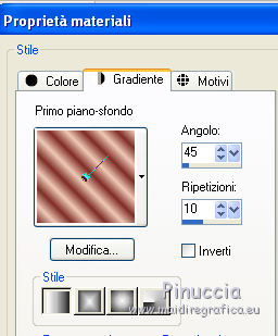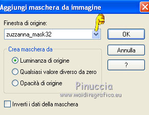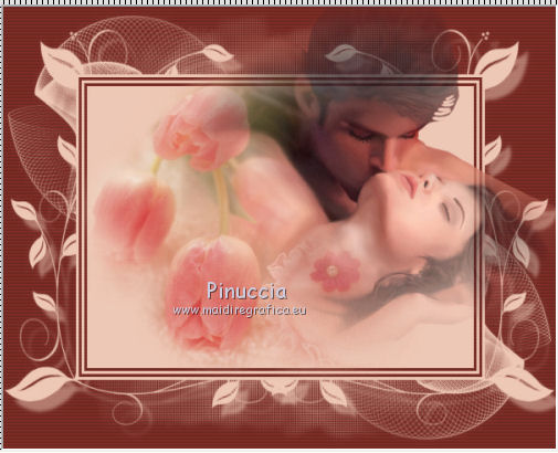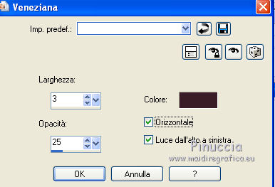Apri la maschera in PSP e minimizzala con il resto del materiale in PSP. 1. Apri una nuova immagine trasparente 600 x 400 pixels. 2. Imposta il colore di primo piano con #eec8b6, e il colore di sfondo con #7f2d25. Riempi l'immagine trasparente con il colore di primo piano.3. Livelli>Nuovo livello raster. Riempi con il colore di sfondo.4. Livelli>Nuovo livello maschera>Da immagine. Apri il menu sotto la finestra di origine e vedrai la lista dei files aperti. Seleziona la maschera zuzzanna_mask32, con i seguenti settaggi. ![]() Livelli>Elimina e rispondi sì alla domanda Unire la maschera nel livello corrente. ![]() Livelli>Unisci>Unisci gruppo. 5. Effetti>Effetti di trama>Veneziana. ![]() 6. Apri il tube fondu_fleurs e vai a Modifica>Copia. Torna al tuo lavoro e vai a Modifica>Incolla come nuovo livello. 7. Apri il tube couple e vai a Modifica>Copia. Torna al tuo lavoro e vai a Modifica>Incolla come nuovo livello. Spostalo un po' più in alto e a destra.![]() 8. Apri il tube boites_filly e vai a Modifica>Copia. Torna al tuo lavoro e vai a Modifica>Incolla come nuovo livello. Spostalo in basso a destra.9. Apri il tube boucle e vai a Modifica>Copia. Torna al tuo lavoro e vai a Modifica>Incolla come nuovo livello. Spostalo in alto a sinistra.Livelli>Duplica. Immagine>Rifletti. Posiziona correttamente il tube a destra.![]() 10. Apri il tube butterfly e vai a Modifica>Copia. Torna al tuo lavoro e vai a Modifica>Incolla come nuovo livello. Spostalo in basso a sinistra.11. Livelli>Unisci>Unisci tutto. 12. Immagine>Aggiungi bordatura, 5 pixels, simmetriche, con un colore qualsiasi. Seleziona questo bordo con la bacchetta magica , sfumatura e tolleranza 0.13. Inverti i colori della paletta. Primo piano #7f2d25, sfondo #eec8b6. Passa il colore di primo piano a Gradiente lineare. ![]() Riempi la selezione con il gradiente.Selezione>Deseleziona. Firma il tuo lavoro e salva in formato jpg. Se hai problemi o dubbi, o trovi un link non funzionante, o anche soltanto per un saluto, scrivimi. 25 Gennaio 2012 |
