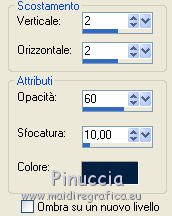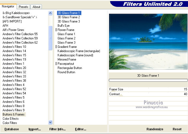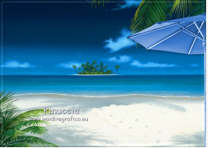 Apri tutto il materiale in PSP. 1. Apri l'immagine plage-ile-deserte-wallfizz. Duplicala con la combinazione di tasti maiuscola+D e chiudi l'originale. La copia sarà la base del tuo lavoro. 2. Effetti>Plugins>Filters Unlimited 2.0 - Buttons and Frames - 3D Glass Frame 1. ![]() 3. Apri il tube CAJ.SCR. MINI-KIT SEA-LIFE EL 13, e vai a Modifica>Copia. Torna al tuo lavoro e vai a Modifica>Incolla come nuovo livello. Sposta il tube a destra, un po' fuori dall'immagine.![]() 4. Effetti>Effetti 3D>Sfalsa ombra, con il colore #011F41. ![]() 5. Apri il enfants_plage, e vai a Modifica>Copia. Torna al tuo lavoro e vai a Modifica>Incolla come nuovo livello. Sposta il tube un po' più in basso a destra.![]() 6. Effetti>Effetti 3D>Sfalsa ombra, con i settaggi precedenti. 7. Apri il tube CAJ.SCR. MINI-KIT SEA-LIFE EL 9, e vai a Modifica>Copia. Torna al tuo lavoro e vai a Modifica>Incolla come nuovo livello. Sposta la sedia nell'angolo in basso a destra.![]() 8. Effetti>Effetti 3D>Sfalsa ombra, con i settaggi precedenti. 9. Apri il tube CAJ.SCR. MINI-KIT SEA-LIFE EL 5, e vai a Modifica>Copia. Torna al tuo lavoro e vai a Modifica>Incolla come nuovo livello. Sposta il tube ai piedi della bambina.![]() 10. Apri il tube CAJ.SCR. MINI-KIT SEA-LIFE EL, e vai a Modifica>Copia. Torna al tuo lavoro e vai a Modifica>Incolla come nuovo livello. Sposta il tube tra il secchiello e la sedia.![]() 11. Apri il tube sea_birds e vai a Modifica>Copia. Torna al tuo lavoro e vai a Modifica>Incolla come nuovo livello. Sposta il tube a sinistra, come nell'esempio.![]() 12. Apri il tube LD_ballon_plage e vai a Modifica>Copia. Torna al tuo lavoro e vai a Modifica>Incolla come nuovo livello. Sposta questo tube a sinistra.![]() 13. Apri il tube titre e vai a Modifica>Copia. Torna al tuo lavoro e vai a Modifica>Incolla come nuovo livello. Sposta il testo in alto a sinistra.14. Livelli>Unisci>Unisci tutto. 15. Immagine>Aggiungi bordatura, 2 pixels, simmetriche, con il colore #7CA6DE. Firma il tuo lavoro e salva in formato jpg. Se hai problemi o dubbi, o trovi un link non funzionante, o anche soltanto per dirmi che ti è piaciuto,
