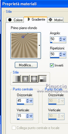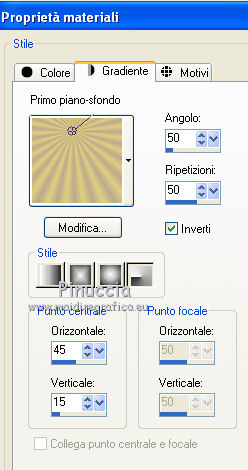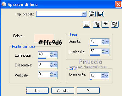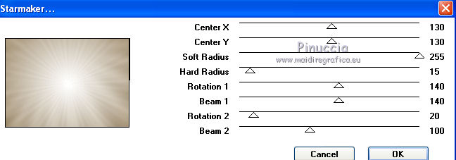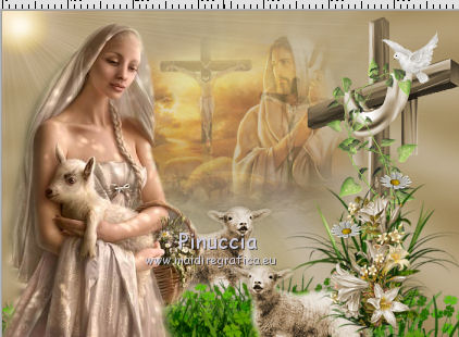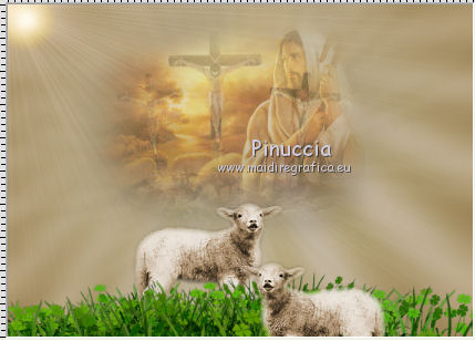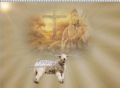 1. Imposta il colore di primo piano con #8e7a5a, e il colore di sfondo con #baaa90. 2. Passa il colore di primo piano a Gradiente radiale. .3. Apri una nuova immagine trasparente 700 x 500 pixels, e riempila con il gradiente.4. Regola>Sfocatura>Sfocatura gaussiana - raggio 20. ![]() 5. Livelli>Duplica. 6. Effetti>Plugins>VM Natural - Starmaker. ![]() 7. Cambia la modalità di miscelatura di questo livello in Sovrapponi, e abbassa l'opacità al 50%. 8. Livelli>Unisci>Unisci visibile. 9. Effetti>Effetti di illuminazione>Sprazzo di luce. ![]() 10. Regola>Luminosità e contrasto>Luminosità e contrasto. ![]() 11. Apri il tube misc_13 e vai a Modifica>Copia. Torna al tuo lavoro e vai a Modifica>Incolla come nuovo livello. Spostalo nell'angolo in alto a sinistra.12. Apri il tube goinghome e vai a Modifica>Copia. Torna al tuo lavoro e vai a Modifica>Incolla come nuovo livello. Spostalo in alto al centro.13. Abbassa l'opacità di questo livello al 30%. 14. Apri il tube christ, e vai a Modifica>Copia. Torna al tuo lavoro e vai a Modifica>Incolla come nuovo livello. Sposta questo tube in alto al centro.15. Cambia la modalità di miscelatura di questo livello in Luce diffusa. 16. Apri il tube In_10_sheep2 e vai a Modifica>Copia. Torna al tuo lavoro e vai a Modifica>Incolla come nuovo livello. Spostalo in basso al centro, come nell'esempio.![]() 17. Livelli>Duplica. Immagine>Rifletti. 18. Apri il tube Hunt_Grass_Scrap and Tubes e vai a Modifica>Copia. Torna al tuo lavoro e vai a Modifica>Incolla come nuovo livello. Sposta il tube sul bordo inferiore.Attiva il livello della seconda pecora. Livelli>Disponi>Porta in alto e posiziona la pecora in basso come nell'esempio.![]() 19. Apri il tube SS_543 e vai a Modifica>Copia. Modifica>Incolla come nuovo livello. Spostalo a sinistra.20. Apri il tube Easter_cross_lea_design e vai a Modifica>Copia. Torna al tuo lavoro e vai a Modifica>Incolla come nuovo livello. Sposta il tube in basso a destra.21. Apri il tube dove, e vai a Modifica>Copia. Torna al tuo lavoro e vai a Modifica>Incolla come nuovo livello. Sposta la colomba sulla croce.![]() 22. Livelli>Unisci>Unisci tutto (appiattisci). 23. Immagine>Aggiungi bordatura, 20 pixels, simmetriche, con il colore #baaa90. Seleziona questo bordo con la bacchetta magica , sfumatura e tolleranza 0.24. Imposta il colore di primo piano con #e2ce7c, e il colore di sfondo con #baaa90. Passa il colore di primo piano a Gradiente Radiale. ![]() 25. Riempi la selezione con il gradiente.26. Effetti>Plugins>Graphics Plus - Cross Shadow. ![]() 27. Effetti>Effetti 3D>Smusso a rilievo. ![]() Selezione>Deseleziona. 28. Apri il tube 01_foliage e vai a Modifica>Copia. Torna al tuo lavoro e vai a Modifica>Incolla come nuovo livello. Spostalo nell'angolo in alto a sinistra.29. Effetti>Plugins>Simple - Top Left Mirror. 30. Livelli>Unisci>Unisci tutto. Firma il tuo lavoro e salva in formato jpg. Se hai problemi o dubbi, o trovi un link non funzionante, o anche soltanto per un saluto, scrivimi.