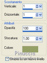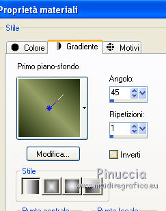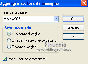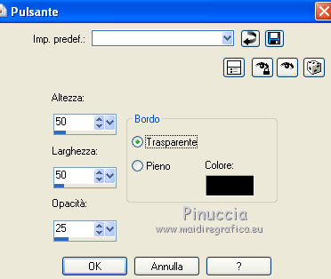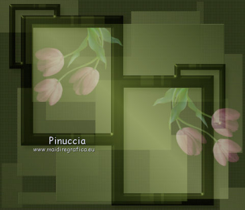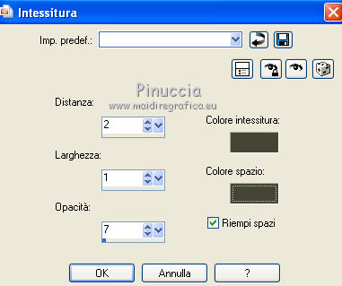 Apri la maschera in PSP e minimizzala con il resto del materiale. 1. Imposta il colore di primo piano con #1E2A09, e il colore di sfondo con #95A066. Passa il colore di primo piano a Gradiente, stile Lineare, con i seguenti settaggi. ![]() 2. Apri una nuova immagine trasparente 610 x 515 pixels, e riempila con il gradiente.3. Livelli>Nuovo livello raster. Riempi con il colore di primo piano #1e2a09.4. Livelli>Nuovo livello maschera>Da immagine. Apri il menu sotto la finestra di origine e vedrai la lista dei files aperti. Tra questi la maschera. Seleziona la maschera masque025, con i seguenti settaggi: ![]() Livelli>Elimina e rispondi sì alla domanda unire la maschera nel livello corrente. ![]() Livelli>Unisci>Unisci gruppo. 5. Effetti>Effetti 3D>Sfalsa ombra, con il colore di sfondo #95A066. ![]() 6. Effetti>Effetti di trama>Intessitura, entrambi i colori impostati con #454533 . ![]() 7. Apri il tube "cadre" e vai a Modifica>Copia. Torna al tuo lavoro e vai a Modifica>Incolla come nuovo livello. Sposta il tube un po' più in basso.8. Apri il tube "tulipes1" e vai a Modifica>Copia. Torna al tuo lavoro e vai a Modifica>Incolla come nuovo livello. Spostalo all'interno del quadro, in alto.9. Livelli>Duplica. Immagine>Capovolgi. Spostalo nella cornice a destra.![]() 10. Apri il tube "rideau de pierres" e vai a Modifica>Copia. Torna al tuo lavoro e vai a Modifica>Incolla come nuovo livello. Spostalo all'interno dei due quadri.11. Apri il tube Leny-vrouw174 e vai a Modifica>Copia. Torna al tuo lavoro e vai a Modifica>Incolla come nuovo livello. Spostalo un po' più a destra.12. Apri il tube "tulipes2" e vai a Modifica>Copia. Torna al tuo lavoro e vai a Modifica>Incolla come nuovo livello. Spostalo in basso a sinistra.![]() 12. Apri il tube "deco_coeur" e vai a Modifica>Copia. Torna al tuo lavoro e vai a Modifica>Incolla come nuovo livello. Spostalo nell'angolo in alto a destra.13. Livelli>Unisci>Unisci tutto (appiattisci). 14. Effetti>Effetti 3D>Pulsante. ![]() 15. Immagine>Aggiungi bordatura, 3 pixels, simmetriche, con il colore #95a066. Firma il tuo lavoro e salva in formato jpg. Se hai problemi o dubbi, o trovi un link non funzionante, o anche soltanto per un saluto, scrivimi. 31 Luglio 2011 |