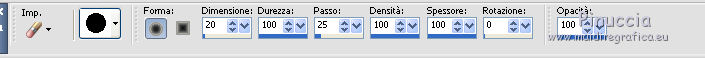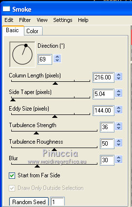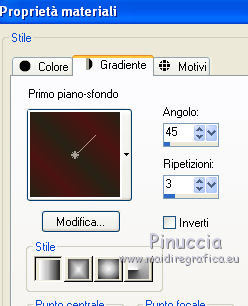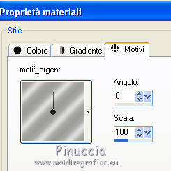 Apri tutto il materiale in PSP, compreso il motivo argento, che troverai nella lista dei motivi disponibili, quando ti servirà. 1. Apri una nuova immagine trasparente 700 x 550 pixels. 2. Imposta il colore di primo piano con #34342f. e riempi l'immagine trasparente con questo colore.3. Livelli>Nuovo livello raster. 4. Effetti>Plugins>Eye candy 4000 - Smoke. ![]() 5. Abbassa l'opacità di questo livello al 60%. 6. Regola>Tonalità e saturazione>Viraggio. ![]() 7. Attiva lo strumento Gomma con i seguenti settaggi.![]() Cancella la parte nell'angolo in alto a sinistra, come nella schermata. ![]() 8. Apri il tube maison_hantee e vai a Modifica>Copia. Torna al tuo lavoro e vai a Modifica>Incolla come nuovo livello. Sposta il tube a destra, contro il bordo.9. Apri il tube Adiene_Eternal_kiss e vai a Modifica>Copia. Torna al tuo lavoro e vai a Modifica>Incolla come nuovo livello. Spostalo un po' più in basso a sinistra.10. Apri il tube blood, e vai a Modifica>Copia. Torna al tuo lavoro e vai a Modifica>Incolla come nuovo livello. Spostalo in alto contro il bordo.11. Apri il tube chauve_souris e vai a Modifica>Copia. Torna al tuo lavoro e vai a Modifica>Incolla come nuovo livello. Spostalo sopra la casa.12. Apri il tube eclairs, e vai a Modifica>Copia. Torna al tuo lavoro e vai a Modifica>Incolla come nuovo livello. Sposta anche questo tube in alto contro il bordo.13. Abbassa l'opacità di questo livello all'80%. 14. Apri il tube texte e vai a Modifica>Copia. Torna al tuo lavoro e vai a Modifica>Incolla come nuovo livello. Spostalo dove preferisci, o vedi il mio esempio.questo passaggio è facoltativo 15. Apri il tube gouttes e vai a Modifica>Copia. Torna al tuo lavoro e vai a Modifica>Incolla come nuovo livello. Posiziona le gocce sul collo della donna.16. Livelli>Unisci>Unisci tutto (appiattisci). 17. Immagine>Aggiungi bordatura, 2 pixels, simmetriche, con un colore qualsiasi, purchè non presente nell'immagine. Seleziona questo bordo con la bacchetta magica , sfumatura e tolleranza 0,Passa il colore di primo piano a Motivi e seleziona il motivo argento. ![]() Riempi la selezione con il motivo argento.Selezione>Deseleziona. 18. Immagine>Aggiungi bordatura, 12 pixels, simmetriche, con un altro colore. Seleziona questo bordo conla bacchetta magica ![]() 19. Imposta il colore di primo piano con #282216, e il colore di sfondo con #4c1412. Passa il colore di primo piano a Gradiente lineare, con i seguenti settaggi. ![]() Riempi la selezione con il gradiente.Effetti>Effetti 3D>Smusso a incasso. ![]() Selezione>Deseleziona. 20. Immagine>Aggiungi bordatura, 2 pixels, simmetriche, con un colore qualsiasi, purchè non presente nell'immagine. Seleziona questo bordo con la bacchetta magica ![]() e riempilo con il motivo argento.21. Aggiungi il tuo nome e/o il tuo watermark su un nuovo livello. 22. Livelli>Unisci>Unisci tutto e salva in formato jpg. Se hai problemi o dubbi, o trovi un link non funzionante, o anche soltanto per un saluto, scrivimi.