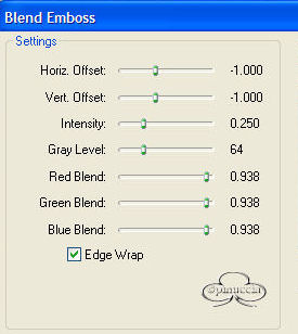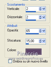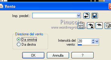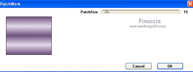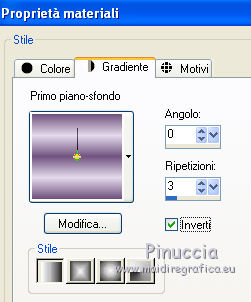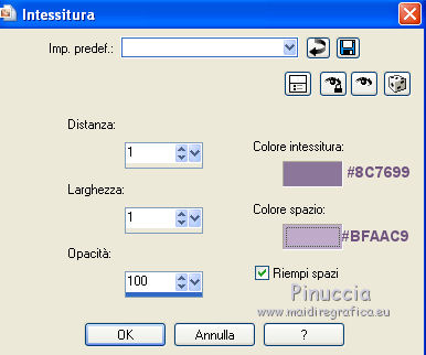 1. Imposta il colore di primo piano con #E5DBEC, e il colore di sfondo con #70527F. Passa il colore di primo piano a Gradiente Lineare, con i seguenti settaggi. ![]() 2. Apri una nuova immagine trasparente 600 x 500 pixels, e riempila con il gradiente.3. Effetti>Plugins>Funhouse - Patchwork. ![]() 4. Apri il tube perle01 e vai a Modifica>Copia. Torna al tuo lavoro e vai a Modifica>Incolla come nuovo livello. Spostalo nell'angolo in alto a sinistra.5. Effetti>Plugins>Simple - Top Left Mirror. 6. Effetti>Effetti di distorsione>Vento - da sinistra, intensità 20. ![]() Ripeti l'Effetto Vento, questa volta da destra. 7. Effetti>Effetti di trama>Intessitura. ![]() 8. Livelli>Duplica. Immagine>Ruota per gradi - 90 gradi a sinistra. ![]() Chiudi il livello di sfondo. Livelli>Unisci>Unisci visibile. Riapri il livello di sfondo e rimani posizionato sul livello superiore. 9. Effetti>Plugins>FM Tile Tools - Blend Emboss, con i settaggi standard. ![]() 10. Apri il tube lys_blanc e vai a Modifica>Copia. Torna al tuo lavoro e vai a Modifica>Incolla come nuovo livello. 11. Apri il tube deco12 e vai a Modifica>Copia. Torna al tuo lavoro e vai a Modifica>Incolla come nuovo livello. Spostalo in basso, sul bordo.12. Apri il tube fashion-chapeau166-tube-colombe, e vai a Modifica>Copia. Torna al tuo lavoro e vai a Modifica>Incolla come nuovo livello. Sposta il tube a sinistra, vicino al bordo.13. Apri il tube country_tish_oval_frame e vai a Modifica>Copia. Torna al tuo lavoro e vai a Modifica>Incolla come nuovo livello. Sposta la cornice un po' più in alto a destra.14. Apri il tube fashion-chapeau-166-tube-colombe2, e vai a Modifica>Copia. Torna al tuo lavoro e vai a Modifica>Incolla come nuovo livello. Posiziona correttamente il tube nella cornice.15. Apri il tube boucle50 e vai a Modifica>Copia. Torna al tuo lavoro e vai a Modifica>Incolla come nuovo livello. Spostalo sul bordo destro della cornice.16. Apri il tube perle01-tube-colombe 2 e vai a Modifica>Copia. Torna al tuo lavoro e vai a Modifica>Incolla come nuovo livello. Spostalo in basso a destra - vedi il mio esempio.17. Effetti>Effetti 3D>Sfalsa ombra, con il colore #5f446a. ![]() 18. Livelli>Duplica. Immagine>Rifletti. Livelli>Unisci>Unisci tutto (appiattisci). 19. Immagine>Aggiungi bordatura, 2 pixels, simmetriche, con il colore #e5dbec. Immagine>Aggiungi bordatura, 25 pixels, simmetriche, con il colore #5f446a. Seleziona questo bordo con la bacchetta magica , sfumatura e tolleranza 0.Effetti>Effetti di trama>Intessitura, con i settaggi precedenti. 20. Effetti>Effetti 3D>Smusso a incasso. ![]() Selezione>Deseleziona. 21. Immagine>Aggiungi bordatura, 2 pixels, simmetriche, con il colore #e5dbec. Copia. Torna al tuo lavoro e vai a Modifica>Incolla come nuovo livello. Spostalo nell'angolo in alto a sinistra.23. Effetti>Plugins>Simple - Top Left Mirror. 24. Livelli>Unisci>Unisci tutto (appiattisci). Firma il tuo lavoro e salva in formato jpg. Se hai problemi o dubbi, o trovi un link non funzionante, o anche soltanto per un saluto, scrivimi. 27 Giugno 2011 |