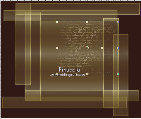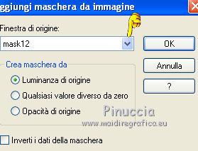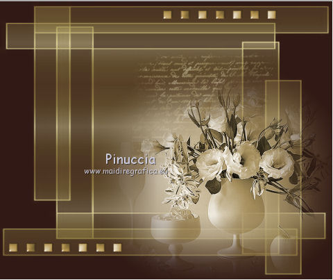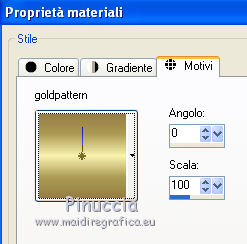 Apri la maschera in PSP e minimizzala con il resto del materiale. 1. Apri una nuova immagine trasparente 600 x 500 pixels. Imposta il colore di primo piano con #321b16, e riempi l'immagine trasparente con questo colore.2. Livelli>Nuovo livello raster. Passa il colore di primo piano a Motivi e seleziona il motivo oro. ![]() Riempi il nuovo livello con il motivo oro.3. Livelli>Nuovo livello maschera>Da immagine. Apri il menu sotto la finestra di origine e vedrai la lista dei files aperti. Tra questi la maschera. Seleziona la maschera mask12, con i seguenti settaggi: ![]() Livelli>Elimina e rispondi sì alla domanda unire la maschera nel livello corrente. ![]() Livelli>Unisci>Unisci gruppo. 4. Apri il tube texte, e vai a Modifica>Copia. Torna al tuo lavoro e vai a Modifica>Incolla come nuovo livello. Spostalo un po' più a destra.![]() 5. Apri il tube mc2507, e vai a Modifica>Copia. Torna al tuo lavoro e vai a Modifica>Incolla come nuovo livello. Spostalo in basso a destra.![]() 6. Apri il tube deco_fibi, e vai a Modifica>Copia. Torna al tuo lavoro e vai a Modifica>Incolla come nuovo livello. Spostalo in basso a sinistra.7. Livelli>Duplica. Sposta il duplicato in alto a destra.![]() 8. Apri il tube milief514 e vai a Modifica>Copia. Torna al tuo lavoro e vai a Modifica>Incolla come nuovo livello. Immagine>Ridimensiona, all'85%, tutti i livelli non selezionato. Sposta il tube a sinistra.Livelli>Duplica - 1-2 volte per rafforzare i colori del tube. 9. Apri il tube mou_juwelery e vai a Modifica>Copia. Torna al tuo lavoro e vai a Modifica>Incolla come nuovo livello. Spostalo in alto a destra.![]() 10. Apri il tube deco_fibi2 e vai a Modifica>Copia. Torna al tuo lavoro e vai a Modifica>Incolla come nuovo livello. Spostalo in basso a destra.11. Apri il tube deco_fibi3 e vai a Modifica>Copia. Torna al tuo lavoro e vai a Modifica>Incolla come nuovo livello. Spostalo al centro del braccialetto.12. Livelli>Unisci>Unisci tutto (appiattisci). 13. Immagine>Aggiungi bordatura, 2 pixels, simmetriche, con un colore contrastante, per l'esempio ho scelto il colore blu. Seleziona questo bordo con la bacchetta magica , sfumatura e tolleranza 0,e riempilo con il motivo oro.Selezione>Deseleziona. Firma il tuo lavoro e salva in formato jpg. Se hai problemi o dubbi, o trovi un link non funzionante, o anche soltanto per un saluto, scrivimi. 27 Giugno 2011 |
