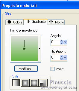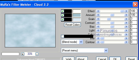 1. Imposta il colore di primo piano con #64b642, e il colore di sfondo con #dfdfde. Passa il colore di primo piano a Gradiente Lineare, con i seguenti settaggi. ![]() 2. Apri una nuova immagine trasparente 725 x 525 pixels, e riempila con il gradiente.3. Apri il tube LD_cadre_fraises e vai a Modifica>Copia. Torna al tuo lavoro e vai a Modifica>Incolla come nuovo livello. 4. Effetti>Effetti 3D>Sfalsa ombra, con il colore #022e02. ![]() 5. Seleziona l'interno della cornice cliccando con la bacchetta magica ![]() Selezione>modifica>Espandi - 20 pixels. 6. Livelli>Nuovo livello raster. Livelli>Disponi>Sposta giù. Imposta il colore di primo piano con #9ebfcb. Riempi il livello con il colore di primo piano.Imposta il colore di sfondo con #d9e8f3. 7. Effetti>Plugins>Mura's Meister - Cloud. ![]()