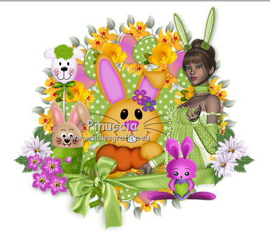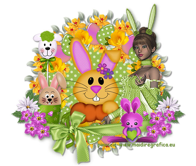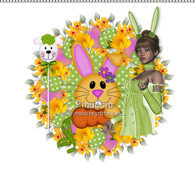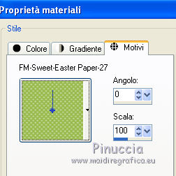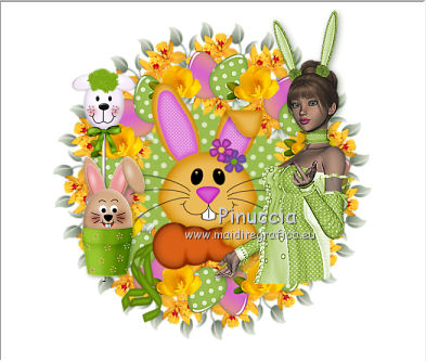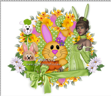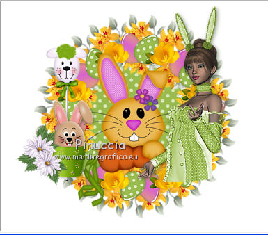 Apri tutto il materiale in PSP. 1. Imposta il colore di primo piano con il colore bianco. Passa il colore di sfondo a Motivi e seleziona il motivo FM-Sweet-Easter Paper-27. ![]() 2. Apri una nuova immagine trasparente 650 x 550 pixels, e riempila con il colore bianco di primo piano.Apri il tube FM-Sweet-Easter-Element-59 e vai a Modifica>Copia. Torna al tuo lavoro e vai a Modifica>Incolla come nuovo livello. 3. Attiva lo strumento Bacchetta magica , sfumatura e tolleranza 0,e clicca al centro della corona per selezionarla. Selezione>Modifica>Espandi - 10 pixels. Livelli>Nuovo livello raster. Livelli>Disponi>Sposta giù. Riempi con il motivo di sfondo (Tasto destro del mouse).Attiva nuovamente il livello superiore. 4. Apri il tube FM-Sweet-Easter-Element-62 e vai a Modifica>Copia. Torna al tuo lavoro e vai a Modifica>Incolla come nuovo livello. Sposta il tube un po' più in basso.5. Apri il tube FM-Bunny9 e vai a Modifica>Copia. Torna al tuo lavoro e vai a Modifica>Incolla come nuovo livello. Spostalo a destra, come nell'esempio.![]() 6. Apri il tube FM-Sweet-Easter-Element-63 e vai a Modifica>Copia. Torna al tuo lavoro e vai a Modifica>Incolla come nuovo livello. Spostalo a sinistra, come nell'esempio.![]() 7. Apri il tube FM-Sweet-Easter-Element-9 e vai a Modifica>Copia. Torna al tuo lavoro e vai a Modifica>Incolla come nuovo livello. Spostalo a sinistra, come nell'esempio.![]() 8. Apri il tube FM-Sweet-Easter-Element-6 e vai a Modifica>Copia. Torna al tuo lavoro e vai a Modifica>Incolla come nuovo livello. Spostalo in basso a sinistra, come nell'esempio.![]() 9. Livelli>Duplica. Immagine>Rifletti. 10. Apri il tube FM-Sweet-Easter-Element-22 e vai a Modifica>Copia. Torna al tuo lavoro e vai a Modifica>Incolla come nuovo livello. Spostalo in basso al centro.![]() 11. Apri il tube FM-Sweet-Easter-Element-46 e vai a Modifica>Copia. Torna al tuo lavoro e vai a Modifica>Incolla come nuovo livello. Spostalo a destra del nastro.![]() 12. Apri il tube FM-Sweet-Easter-Element-52 e vai a Modifica>Copia. Torna al tuo lavoro e vai a Modifica>Incolla come nuovo livello. Spostalo in basso a sinistra, come nell'esempio.![]() 13. Livelli>Duplica. Immagine>Rifletti. 14. Chiudi il livello di sfondo bianco. Livelli>Unisci>Unisci visibile. 15. Effetti>Effetti 3D>Sfalsa ombra, con il colore #202020. ![]() 16. Riapri il livello di sfondo bianco. Livelli>Unisci>Unisci tutto. Firma il tuo lavoro e salva in formato jpg. se vuoi salvare in lavoro conservando la trasparenza dello sfondo (come nel mio esempio in alto): prima di salvare, elimina il livello di sfondo bianco, e vai a Livelli>Unisci>Unisci visibile e salva in formato png. ![]() Se hai problemi o dubbi, o trovi un link non funzionante, o anche soltanto per un saluto, scrivimi.