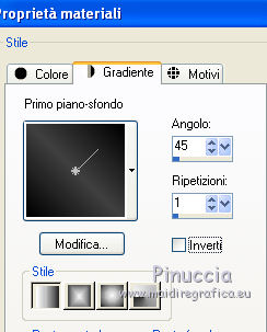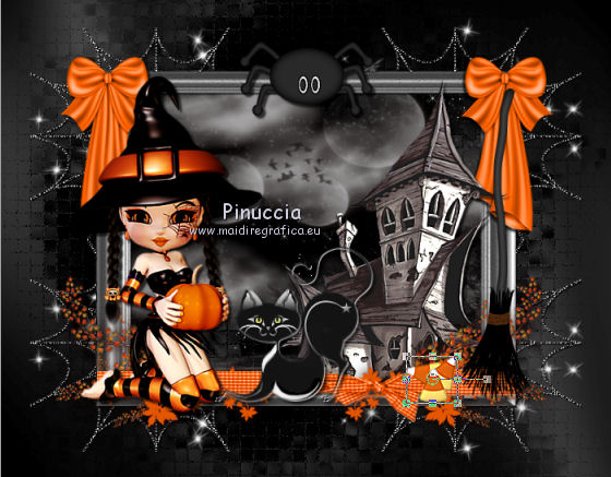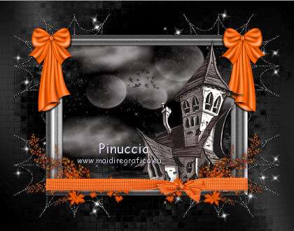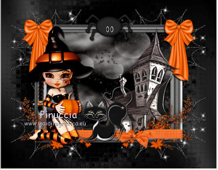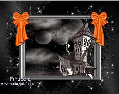 1. Apri una nuova immagine trasparente 700 x 550 pixels. 2. Imposta il colore di primo piano con #000000, e il colore di sfondo con #404040. Passa il colore di primo piano a Gradiente, con i seguenti settaggi. ![]() Riempi l'immagine trasparente con il gradiente.3. Effetti>Plugins>Graphics Plus - Cross Shadow, con i settaggi standard. ![]() 4. Apri il tube mask_halloween02 e vai a Modifica>Copia. Torna al tuo lavoro e vai a Modifica>Incolla come nuovo livello. 5. Immagine>Ridimensiona, al 150%, tutti i livelli non selezionato. 6. Effetti>Effetti di trama>Mosaico antico. ![]() 7. Effetti>Effetti di bordo>Aumenta. 8. Apri il tube mask_mistery e vai a Modifica>Copia. Torna al tuo lavoro e vai a Modifica>Incolla come nuovo livello. 9. Apri il tube LD_FRAME e vai a Modifica>Copia. Torna al tuo lavoro e vai a Modifica>Incolla come nuovo livello. 10. Apri il tube SM_halloween_Bow_1 e vai a Modifica>Copia. Torna al tuo lavoro e vai a Modifica>Incolla come nuovo livello. Spostalo sul bordo della cornice in alto a sinistra.11. Effetti>Effetti 3D>Sfalsa ombra. ![]() 12. Livelli>Duplica. Immagine>Rifletti. 13. Apri il tube maison_hantee3 e vai a Modifica>Copia. Torna al tuo lavoro e vai a Modifica>Incolla come nuovo livello. Spostalo sul bordo della cornice a destra.![]() 14. Effetti>Effetti 3D>sfalsa ombra. ![]() 15. Apri il tube SM_halloween_leaves e vai a Modifica>Copia. Torna al tuo lavoro e vai a Modifica>Incolla come nuovo livello. Spostalo sul bordo del quadro in basso.16. Apri il tube lliella_CPicnic_bowbig1 e vai a Modifica>Copia. Torna al tuo lavoro e vai a Modifica>Incolla come nuovo livello. Spostalo in basso, sulle foglie.![]() 17. Apri il tube SSLisa - Cookie - Halloween Freebie 5 e vai a Modifica>Copia. Torna al tuo lavoro e vai a Modifica>Incolla come nuovo livello. Spostalo in basso a sinistra.18. Effetti>Effetti 3D>sfalsa ombra. ![]() 19. Apri il tube BITN08-CANDY_SPIDER e vai a Modifica>Copia. Torna al tuo lavoro e vai a Modifica>Incolla come nuovo livello. Spostalo in alto al centro della cornice.20. Effetti>Effetti 3D>Sfalsa ombra. ![]() 21. Apri il tube blackKat2rae édition e vai a Modifica>Copia. Torna al tuo lavoro e vai a Modifica>Incolla come nuovo livello. Spostalo in basso al centro della cornice.![]() 22. Effetti>Effetti 3D>Sfalsa ombra. ![]() 23. Apri il tube BITN08-WITCHBROOM e vai a Modifica>Copia. Torna al tuo lavoro e vai a Modifica>Incolla come nuovo livello. Spostalo sulla cornice a destra.24. Apri il tube BITN08-CANDYCORN e vai a Modifica>Copia. Torna al tuo lavoro e vai a Modifica>Incolla come nuovo livello. Spostalo sul nastro in basso![]() 25. Apri il file con il testo e vai a Modifica>Copia. Torna al tuo lavoro e vai a Modifica>Incolla come nuovo livello. Spostalo dove preferisci o vedi il mio esempio.26. Livelli>Unisci>Unisci tutto. Immagine>Aggiungi bordatura, 20 pixels, simmetriche, con il colore nero. 27. Apri il tube BITN08-CANDYCORNBORDER e vai a Modifica>Copia. Torna al tuo lavoro e vai a Modifica>Incolla come nuovo livello. 28. Immagine>Aggiungi bordatura, 2 pixels, simmetriche, con il colore arancio #E45600. Firma il tuo lavoro e salva in formato jpg. Se hai problemi o dubbi, o trovi un link non funzionante, o anche soltanto per un saluto, scrivimi. 27 Settembre 2011 |