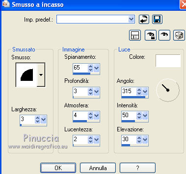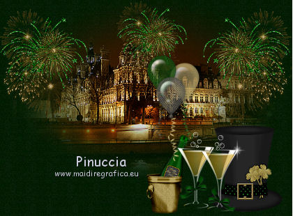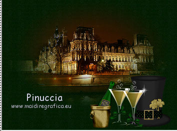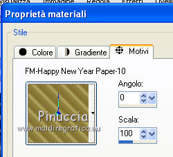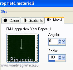 Apri tutto il materiale in PSP, compresi i due motivi (minimizzandoli, li troverai nella lista dei motivi disponibili quando ti serviranno). 1. Apri una nuova immagine trasparente 700 x 520 pixels. 2. Passa il colore di primo piano a Motivi e seleziona FM-Happy New Year Paper-11: ![]() 3. Riempi l'immagine trasparente con il motivo di primo piano.4. Apri il tube Noel_a_Paris e vai a Modifica>Copia. Torna al tuo lavoro e vai a Modifica>Incolla come nuovo livello. Sposta questo tube un po' più in alto.5. Apri il tube FM-Happy New Year Element-45 e vai a Modifica>Copia. Torna al tuo lavoro e vai a Modifica>Incolla come nuovo livello. Spostalo nell'angolo in basso a destra.![]() 6. Apri il tube FW029 e vai a Modifica>Copia. Torna al tuo lavoro e vai a Modifica>Incolla come nuovo livello. Spostalo in alto contro il bordo.7. Apri il tube FM-Happy New Year Element-8 e vai a Modifica>Copia. Torna al tuo lavoro e vai a Modifica>Incolla come nuovo livello. Posiziona il tube come nel mio esempio.![]() 8. Apri il tube FM-Happy New Year Elegante 2 e vai a Modifica>Copia. Torna al tuo lavoro e vai a Modifica>Incolla come nuovo livello. Spostalo in basso a sinistra.9. Apri il tube "texte" e vai a Modifica>Copia. Torna al tuo lavoro e vai a Modifica>Incolla come nuovo livello. Spostalo in alto, come nel mio esempio.10. Livelli>Unisci>Unisci tutto. 11. Passa il colore di sfondo a Motivo e seleziona FM-Happy New Year Paper-10. ![]() 12. Immagine>Aggiungi bordatura, 2 pixels, simmetriche, con il colore bianco. Seleziona questo bordo con la bacchetta magica , sfumatura e tolleranza 0,e riempilo con il motivo di sfondo (tasto destro del mouse).Selezione>Deseleziona. 13. Immagine>Aggiungi bordatura, 20 pixels, simmetriche, con il colore bianco. Seleziona questo bordo con la bacchetta magica , sfumatura e tolleranza 0,e riempilo con il motivo verde di primo piano (Paper-11).14. Effetti>Effetti 3D>Smusso a incasso. ![]() Selezione>Desleziona. 15. Immagine>Aggiungi bordatura, 2 pixels, simmetriche, con il colore bianco. Seleziona questo bordo con la bacchetta magica , sfumatura e tolleranza 0,e riempilo con il motivo oro di sfondo (tasto destro del mouse).Selezione>Deseleziona. 16. Apri il tube FM-Happy New Year Element-17 e vai a Modifica>Copia. Torna al tuo lavoro e vai a Modifica>Incolla come nuovo livello. Spostalo nell'angolo in alto a sinistra.Effetti>Plugins>Simple - Top Left Mirror. 17. Livelli>Unisci>Unisci tutto. Firma il tuo lavoro e salva in formato jpg. Se hai problemi o dubbi, o trovi un link non funzionante, o anche soltanto per un saluto, scrivimi.