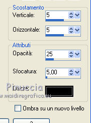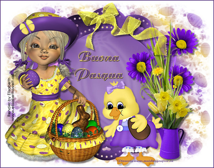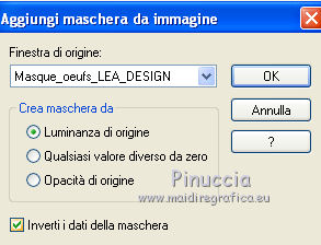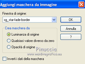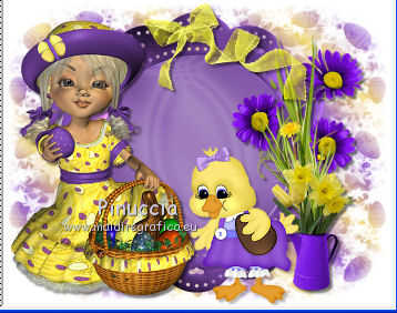 Apri le maschere in PSP e minimizzale con il resto del materiale. 1. Imposta il colore di primo piano con #9154d2, e il colore di sfondo con #f2d96a. Passa il colore di primo piano a Gradiente, stile Lineare. ![]() 2. Apri una nuova immagine bianca 700 x 550 pixels. Livelli>Nuovo livello raster. Riempi con il gradiente.3. Livelli>Nuovo livello maschera>Da immagine. Apri il menu sotto la finestra di origine e vedrai la lista dei files aperti. Seleziona la maschera sg_star-fade-border, con i seguenti settaggi: ![]() Livelli>Elimina e rispondi sì alla domanda unire la maschera nel livello corrente. ![]() Livelli>Unisci>Unisci gruppo. 4. Livelli>Nuovo livello raster. Riempi nuovamente con il gradiente.5. Livelli>Nuovo livello maschera>Da immagine. Apri il menu sotto la finestra di origine e seleziona la maschera masque_oeufs_LEA_DESIGN, con i seguenti settaggi: ![]() Livelli>Elimina e rispondi sì alla domanda unire la maschera nel livello corrente. ![]() Livelli>Unisci>Unisci gruppo. 6. Apri il tube "cercle" e vai a Modifica>Copia. Torna al tuo lavoro e vai a Modifica>Incolla come nuovo livello. 7. Apri il tube "glass" e vai a Modifica>Copia. Torna al tuo lavoro e vai a Modifica>Incolla come nuovo livello. 8. Apri il tube "NVDFrame3" e vai a Modifica>Copia. Torna al tuo lavoro e vai a Modifica>Incolla come nuovo livello. 9. Apri il tube "Pot of Flowers" e vai a Modifica>Copia. Torna al tuo lavoro e vai a Modifica>Incolla come nuovo livello. Spostalo a destra.10. Effetti>Effetti 3D>Sfalsa ombra, con il colore nero. ![]() 11. Apri il tube "element_45" e vai a Modifica>Copia. Torna al tuo lavoro e vai a Modifica>Incolla come nuovo livello. Spostalo sulla cornice in alto.12. Effetti>Effetti 3D>Sfalsa ombra, con i settaggi precedenti. ![]() 13. Apri il tube "Easter Hunt_Chick_Scrap and Tubes" e vai a Modifica>Copia. Torna al tuo lavoro e vai a Modifica>Incolla come nuovo livello. Spostalo in basso tra Kiki e il vaso di fiori.![]() 14. Effetti>Effetti 3D>Sfalsa ombra, con il colore nero. ![]() 15. Apri il tube "Wordart_paques_LD" e vai a Modifica>Copia. Torna al tuo lavoro e vai a Modifica>Incolla come nuovo livello. Spostalo nello spazio vuoto.16. Aggiungi il tuo nome e/o il tuo watermark su un nuovo livello. 17. Se vuoi mantenere lo sfondo trasparente, elimina il livello di sfondo bianco. Livelli>Unisci>Unisci visibile e salva in formato png. Esempio con lo sfondo bianco. ![]() Se hai problemi o dubbi, o trovi un link non funzionante, o anche soltanto per un saluto, scrivimi. 1 Aprile 2012 |
