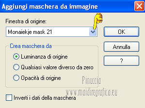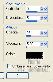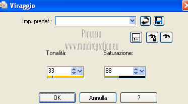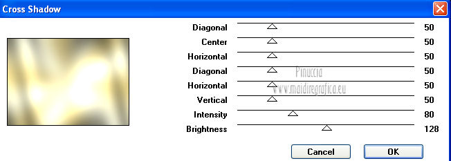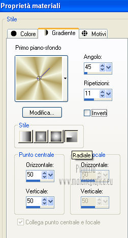 Apri la maschera in PSP e minimizzala con il resto del materiale. 1. Imposta il colore di primo piano con #b19f5f, e il colore di sfondo con #f3f5e1. Passa il colore di primo piano a Gradiente, stile Radiale. ![]() 2. Apri una nuova immagine trasparente 700 x 500 pixels, e riempila con il gradiente.3. Regola>Sfocatura>Sfocatura gaussiana - raggio 40. ![]() 4. Effetti>Plugins>Graphics Plus - Cross Shadow. ![]() 5. Selezione>Seleziona tutto. Livelli>Nuovo livello raster. 6. Apri l'immagine sussieM North Pole Trip IL PP3 e vai a Modifica>Copia. Torna al tuo lavoro e vai a Modifica>Incolla nella selezione. Selezione>Deseleziona. 7. Effetti>Effetti di bordo>Aumenta. 8. Regola>Tonalità e saturazione>Viraggio. ![]() 9. Livelli>Nuovo livello maschera>Da immagine. Apri il menu sotto la finestra di origine e vedrai la lista dei files aperti. Seleziona la maschera Monaiekje mask 21. ![]() 10. Livelli>Elimina e rispondi sì alla domanda Unire la maschera nel livello corrente. ![]() Livelli>Unisci>Unisci gruppo. 11. Effetti>Effetti 3D>Sfalsa ombra, con il colore nero. ![]() 12. Apri il tube ChristmasShopping e vai a Modifica>Copia. Torna al tuo lavoro e vai a Modifica>Incolla come nuovo livello. Spostalo in basso a destra.Cambia la modalità di miscelatura di questo livello in Luminanza. 13. Apri il tube AD_Lady Christmas(75) e vai a Modifica>Copia. Torna al tuo lavoro e vai a Modifica>Incolla come nuovo livello. 14. Apri il tube Pascale_121211_woman_GoldStar e vai a Modifica>Copia. Torna al tuo lavoro e vai a Modifica>Incolla come nuovo livello. Spostalo a sinistra.15. Effetti>Effetti 3D>Sfalsa ombra, con il colore nero. ![]() 16. Apri il tube ornament_zuzzanna e vai a Modifica>Copia. Torna al tuo lavoro e vai a Modifica>Incolla come nuovo livello. Spostalo a destra.![]() 17. Apri il tube deco_zuzzanna e vai a Modifica>Copia. Torna al tuo lavoro e vai a Modifica>Incolla come nuovo livello. Spostalo sopra la sfera.![]() 18. Effetti>Effetti 3D>Sfalsa ombra, con il colore nero. ![]() 19. Livelli>Unisci>Unisci tutto. 20. Immagine>Aggiungi bordatura, 25 pixels, simmetriche, con il colore scuro di primo piano. Seleziona questo bordo con la bacchetta magica , sfumatura e tolleranza 0,e riempilo con il gradiente.21. Effetti>Plugins>Cybia - Screenworks - Dot Screen. ![]() 22. Effetti>Plugins>Graphics Plus - Cross Shadow. ![]() 23. Effetti>Effetti 3D>Smusso a rilievo. ![]() 24. Immagine>Aggiungi bordatura, 2 pixels, simmetriche, con il colore chiaro di sfondo. Firma il tuo lavoro e salva in formato jpg. Se hai problemi o dubbi, o trovi un link non funzionante, o anche soltanto per un saluto, scrivimi. 2 Dicembre 2012 |